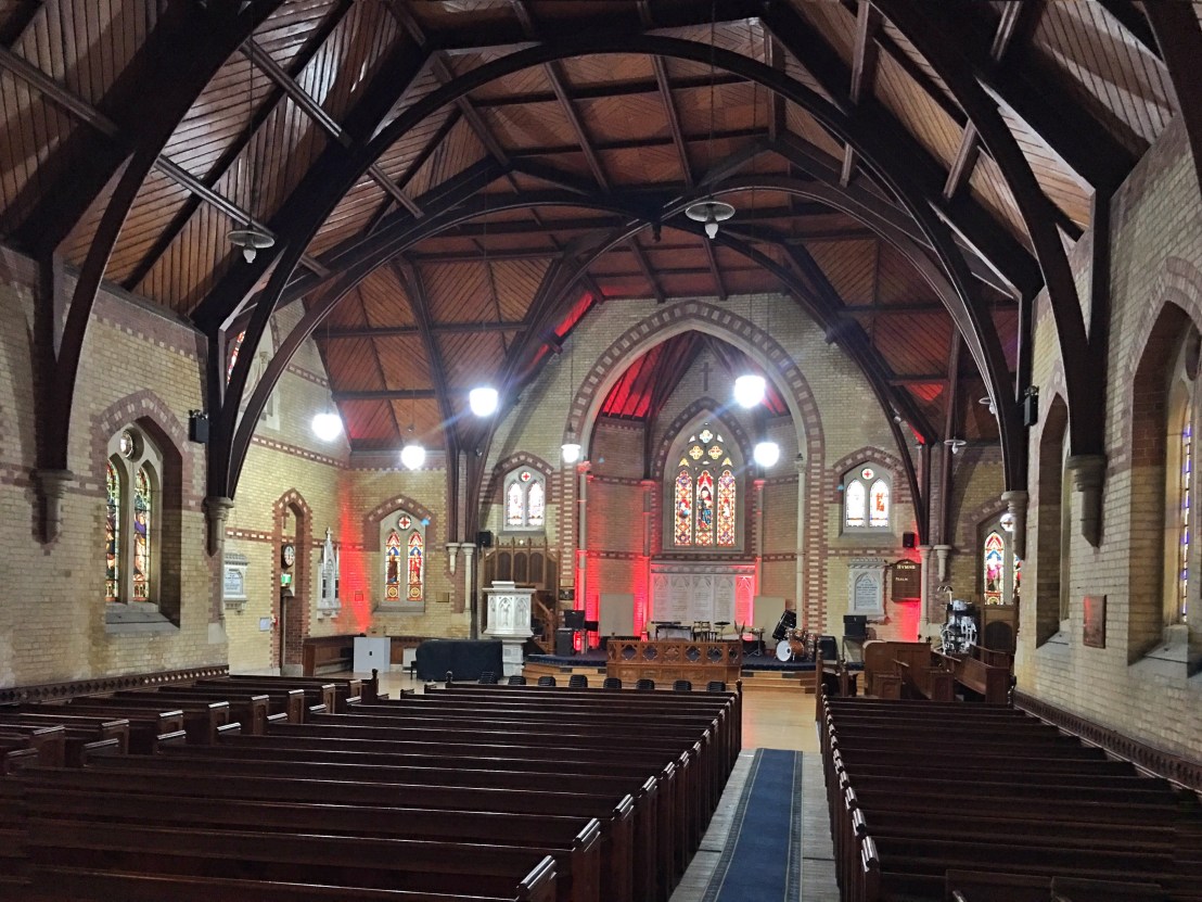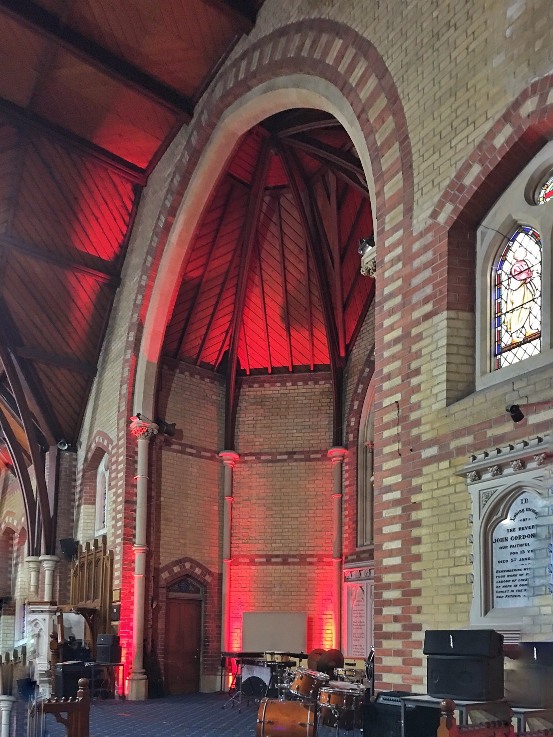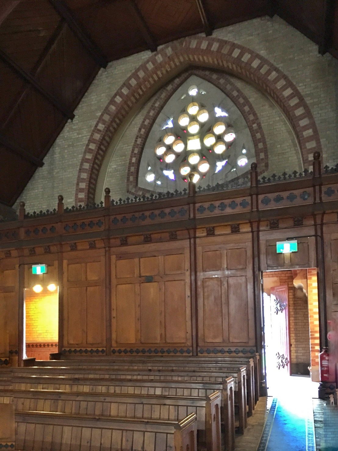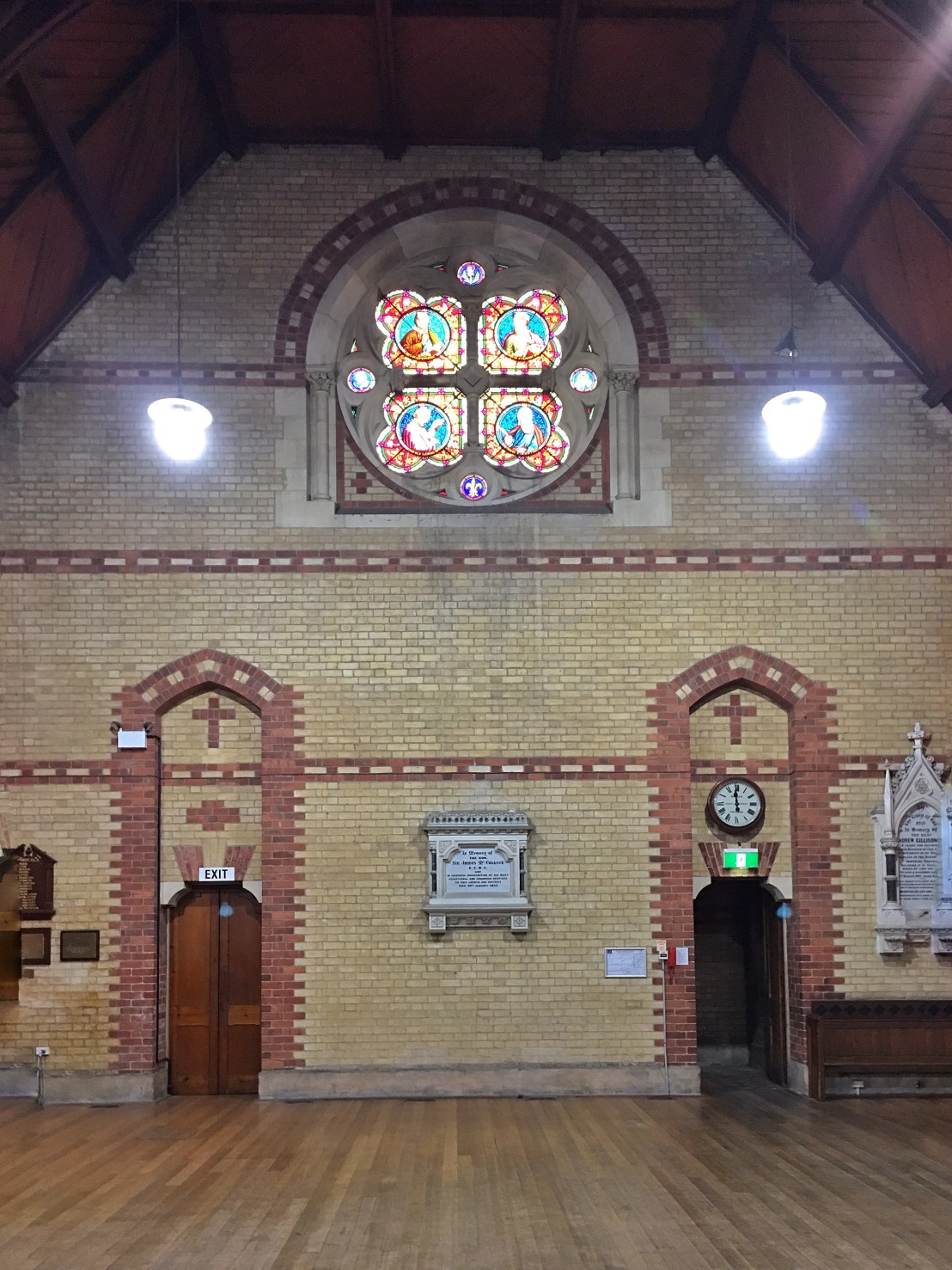 Here he’s taken Joseph Reed’s #LombardicRomanesque and applied it to a #GothicRevival form, but with the stripes that Butterfield liked, and a spire that is maybe his own invention, as is that great stubby #stairtower-buttress on the other side, and using #facebrick inside. Dont think any other late 19thC church here is brick on the inside. It’s also got no aisles, no chancel, and a raked nave, all very #noncomformist features. Also means it babes a fairly good auditorium, which is what it’s used for by #StMichaelsGrammarSchool, since 1990.