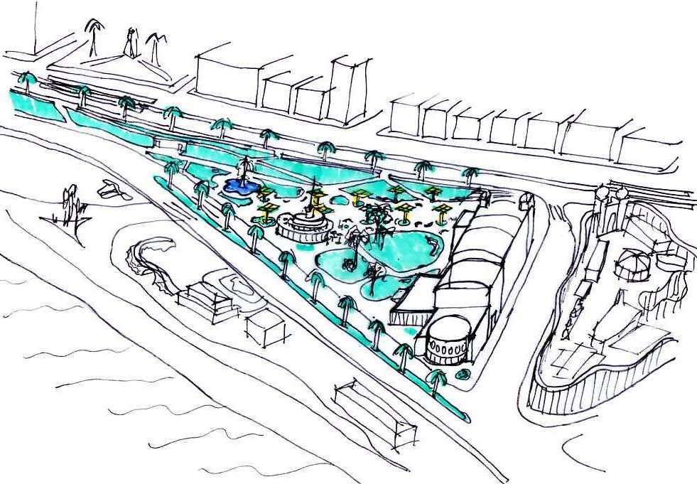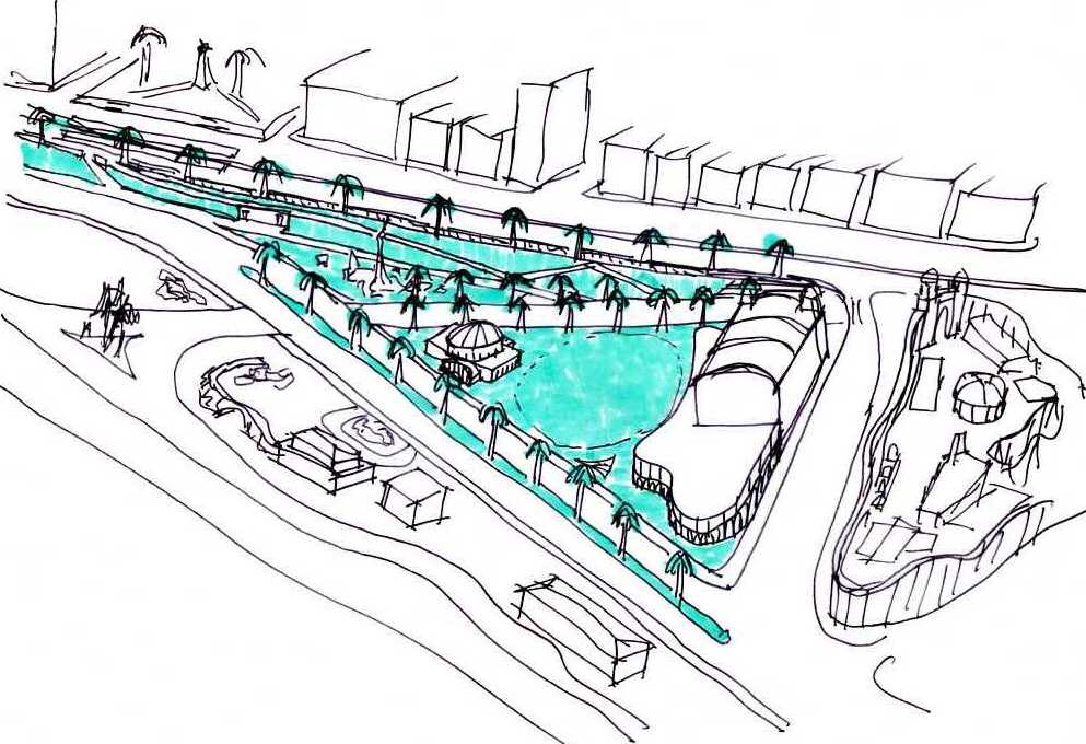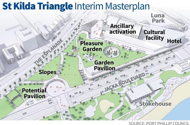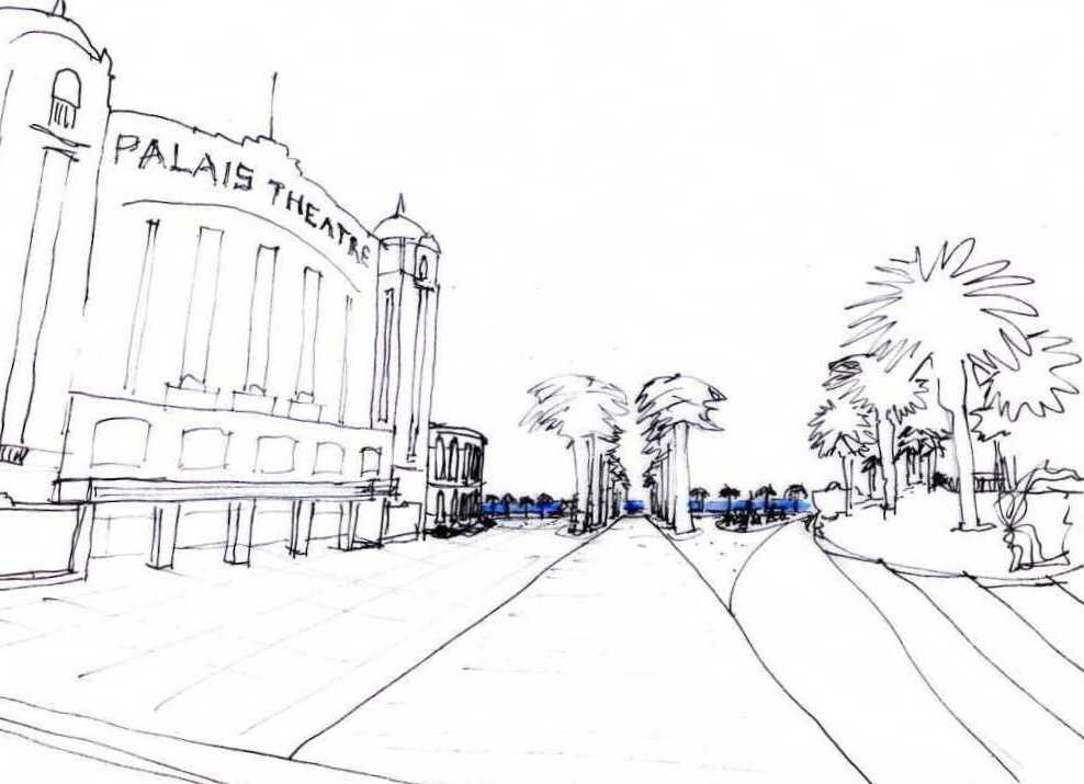 Having gone to a number of sessions, hearing that most people wanted green space, I came up with a #CarloCatani-style palm tree avenue linking a forecourt in front of the Palais straight to the beach. Grass, fountains, paths, kiosks in the rest, with function centre /cabaret attached to the Palais (because why not ?). And widening Jacka Blv a bit so there could be a median with trees. And an alternative with more hard landscaping, like sculptures, art, interactive stuff, even artificial ‘trees’ that provide shade, light up etc. Oh, and carparking goes underground, I don’t seem to have drawn that in….
