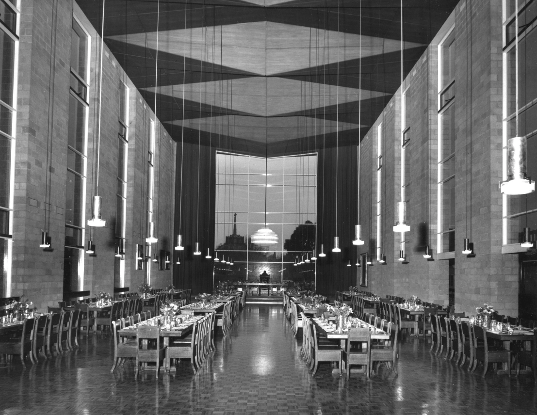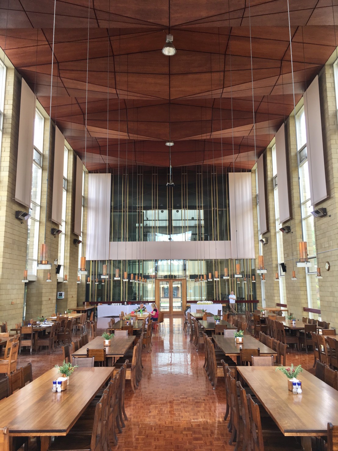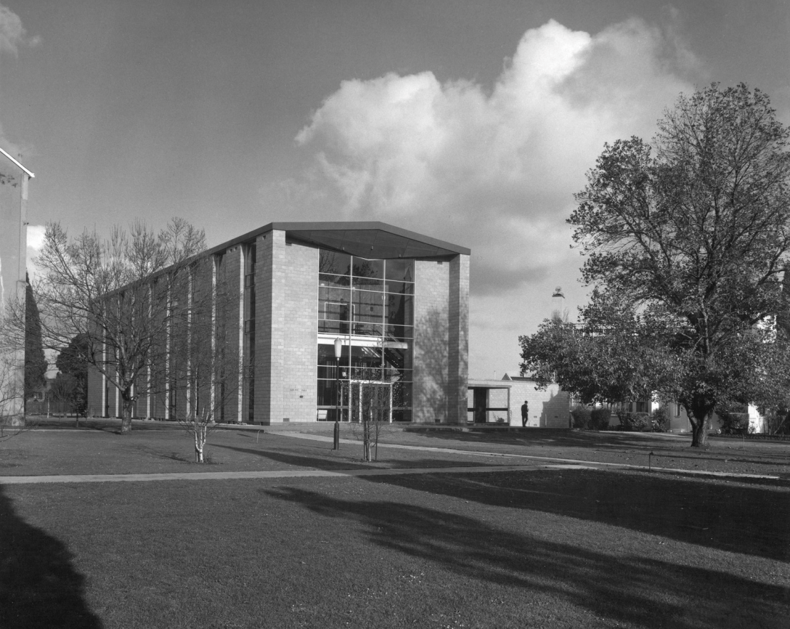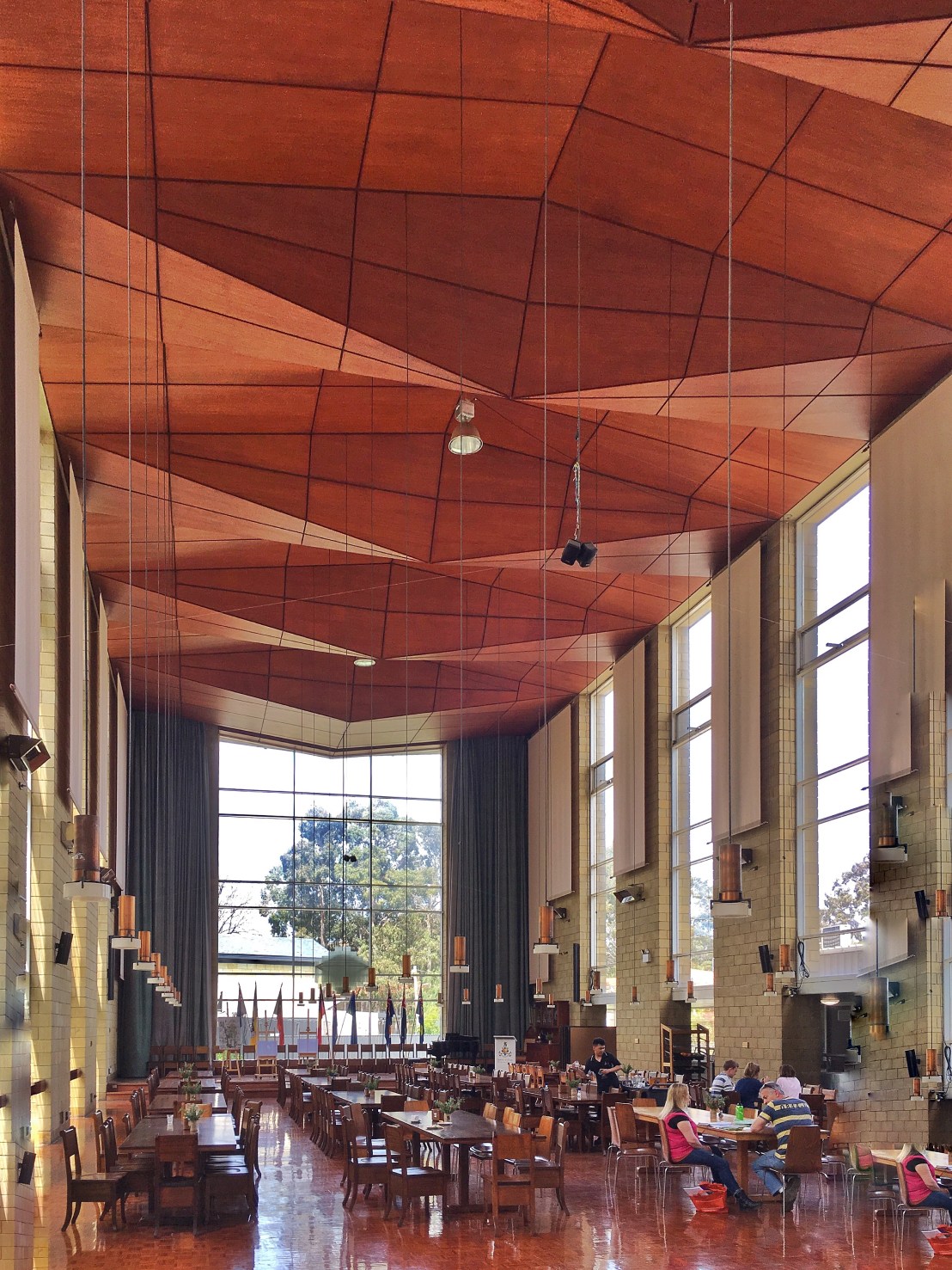 The speccy #EakinsHall at #QueensCollege #Melbourne University was built 1964. Love that folded timber ceiling, presumably cladding some interesting trusses. Designed by #BatesSmartMcCutcheon, it makes and interesting comparison with their Wilson Hall of a few years before; more modern, but less fine materials. The walls are #concreteblock, perhaps meant to emulate stone (which they don’t). Great low hanging copper #canisterlights, and a rather mad glass reed chandelier thing over the stage. The exterior is rather underwhelming. Old photos Wolfgang Sievers 1965 @library_vic