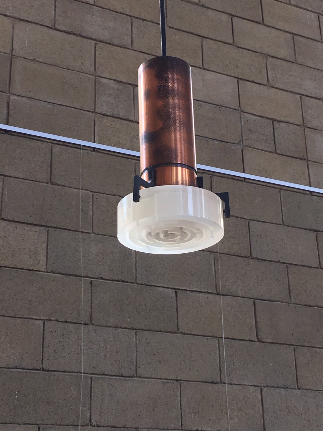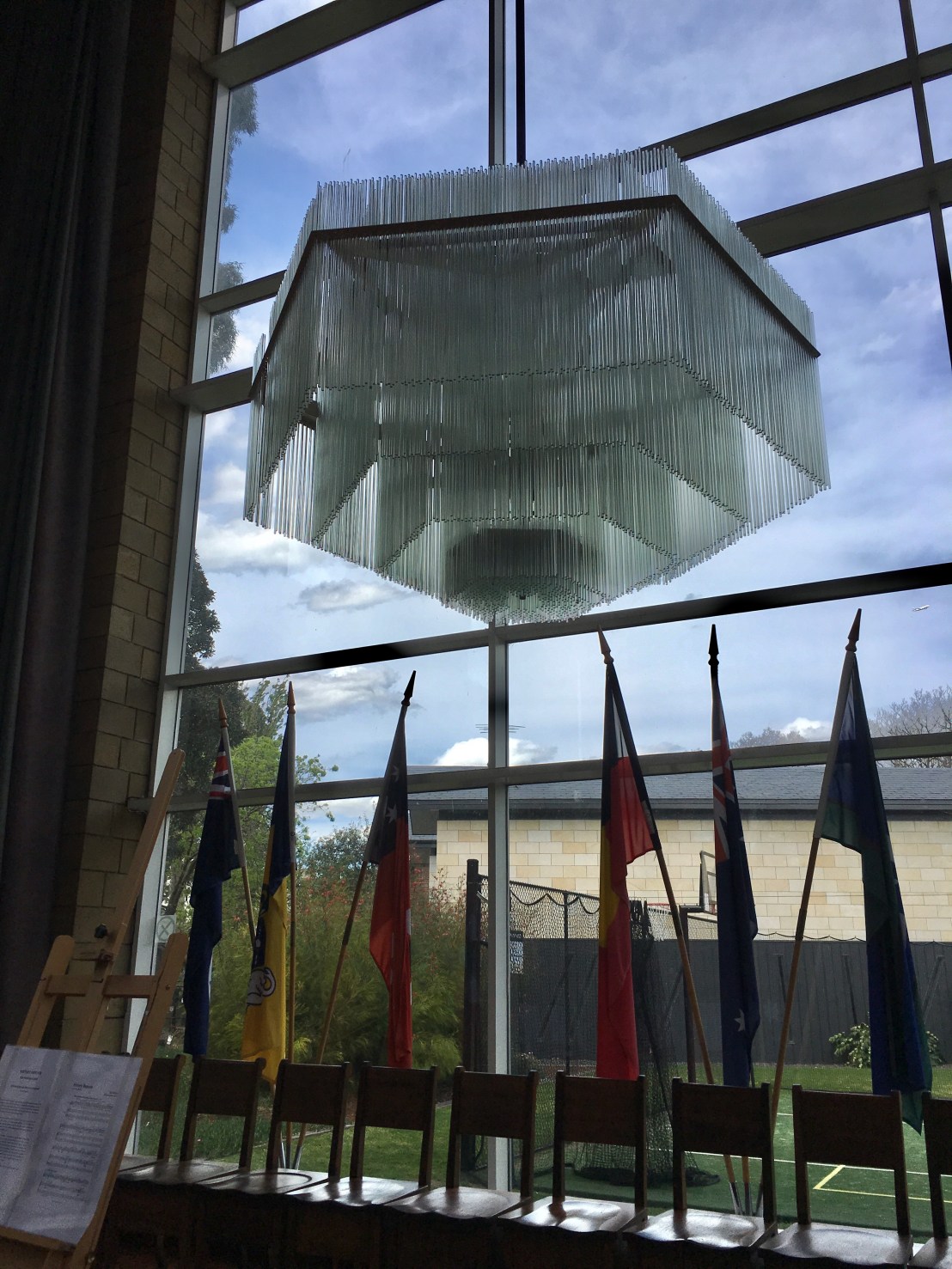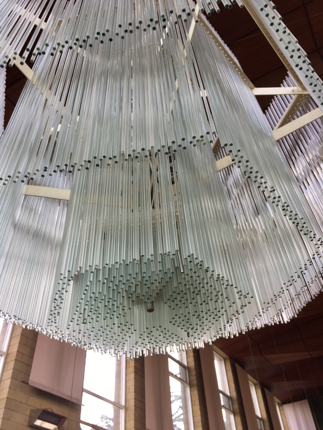 The speccy #EakinsHall at #QueensCollege #Melbourne University was built 1964. Love that folded timber ceiling, presumably cladding some interesting trusses. Designed by #BatesSmartMcCutcheon, it makes and interesting comparison with their Wilson Hall of a few years before; more modern, but less fine materials. The walls are #concreteblock, perhaps meant to emulate stone (which they don’t). Great low hanging copper #canisterlights, and a rather mad glass reed chandelier thing over the stage. The exterior is rather underwhelming. Old photos Wolfgang Sievers 1965 @library_vic