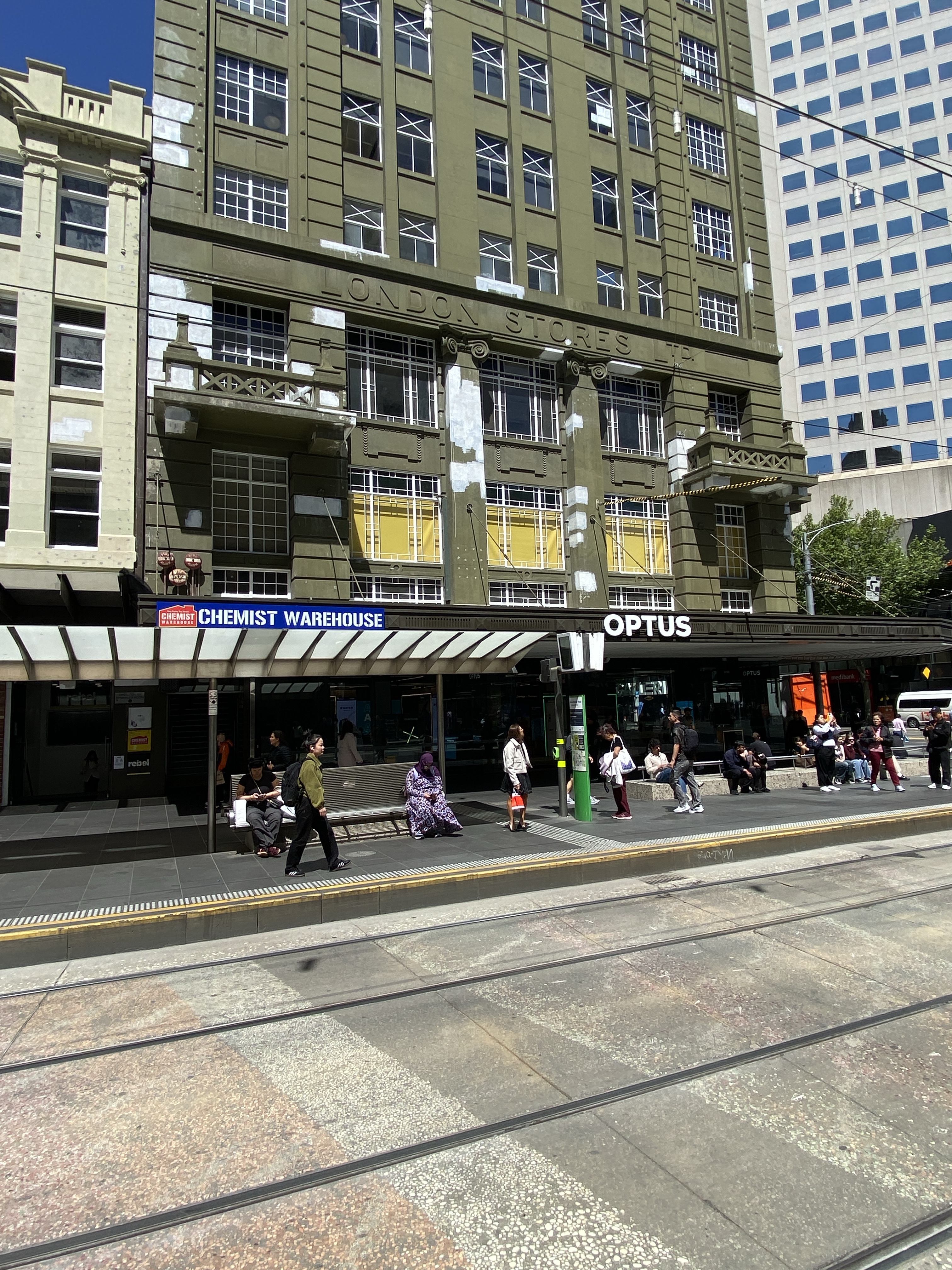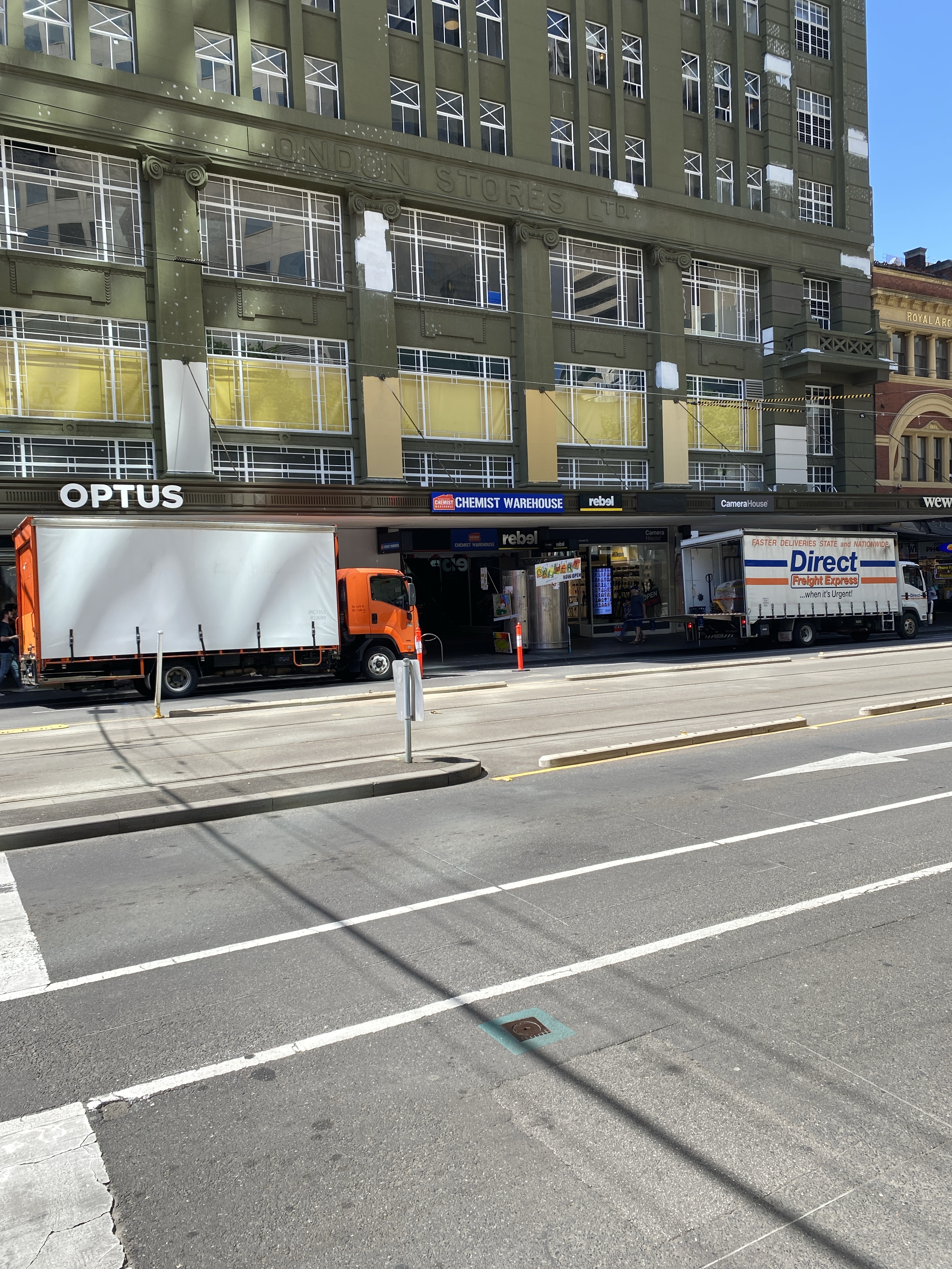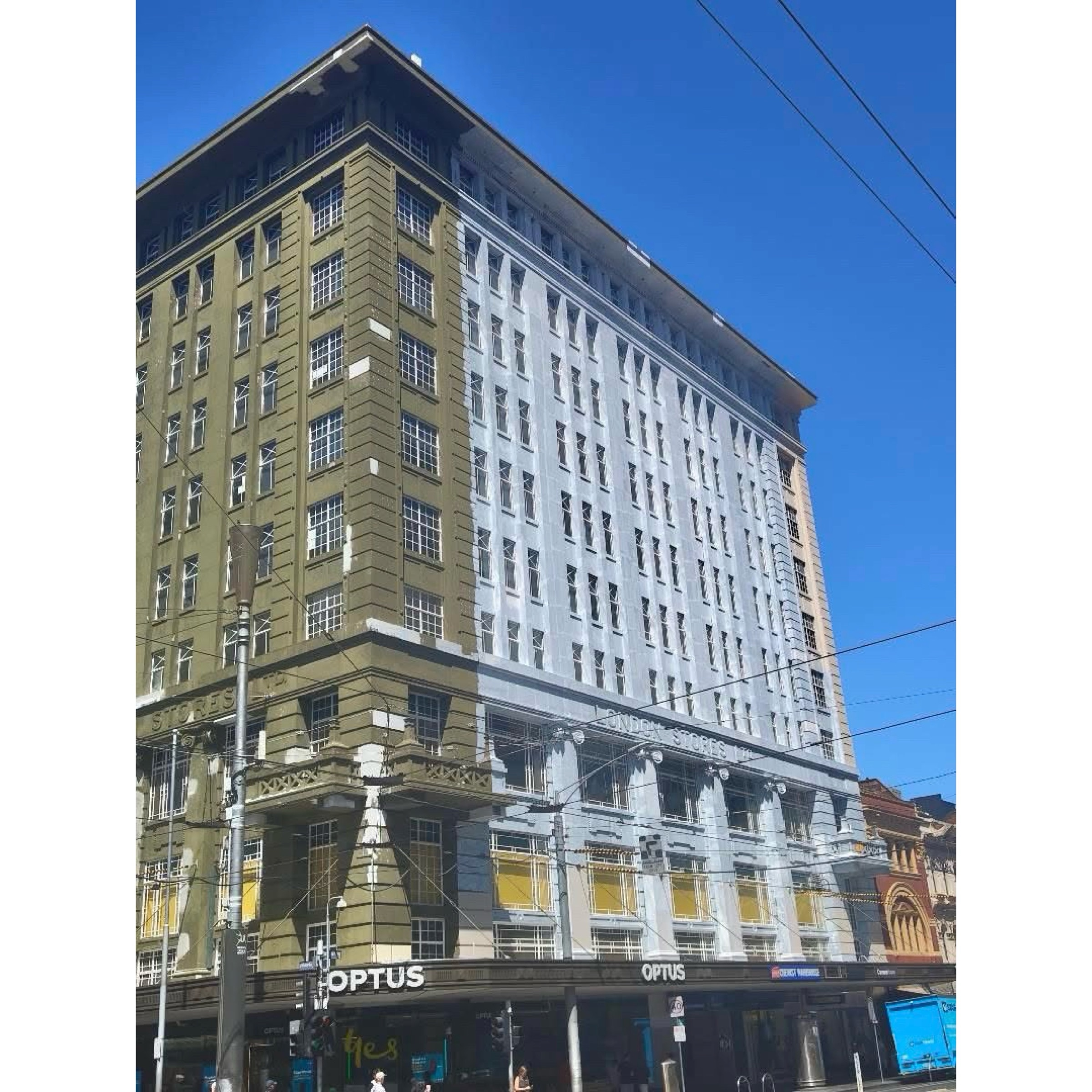 The great huge London Stores on the corner of Bourke & Elizabeth is being repainted (thanks @tristan_davies for the current pics). It’s been all patchy for a while and there were some test colours on the side, off white and a deepish cream, which seems to be the chosen one (my pics Oct last year). It’ll look vastly different I think.