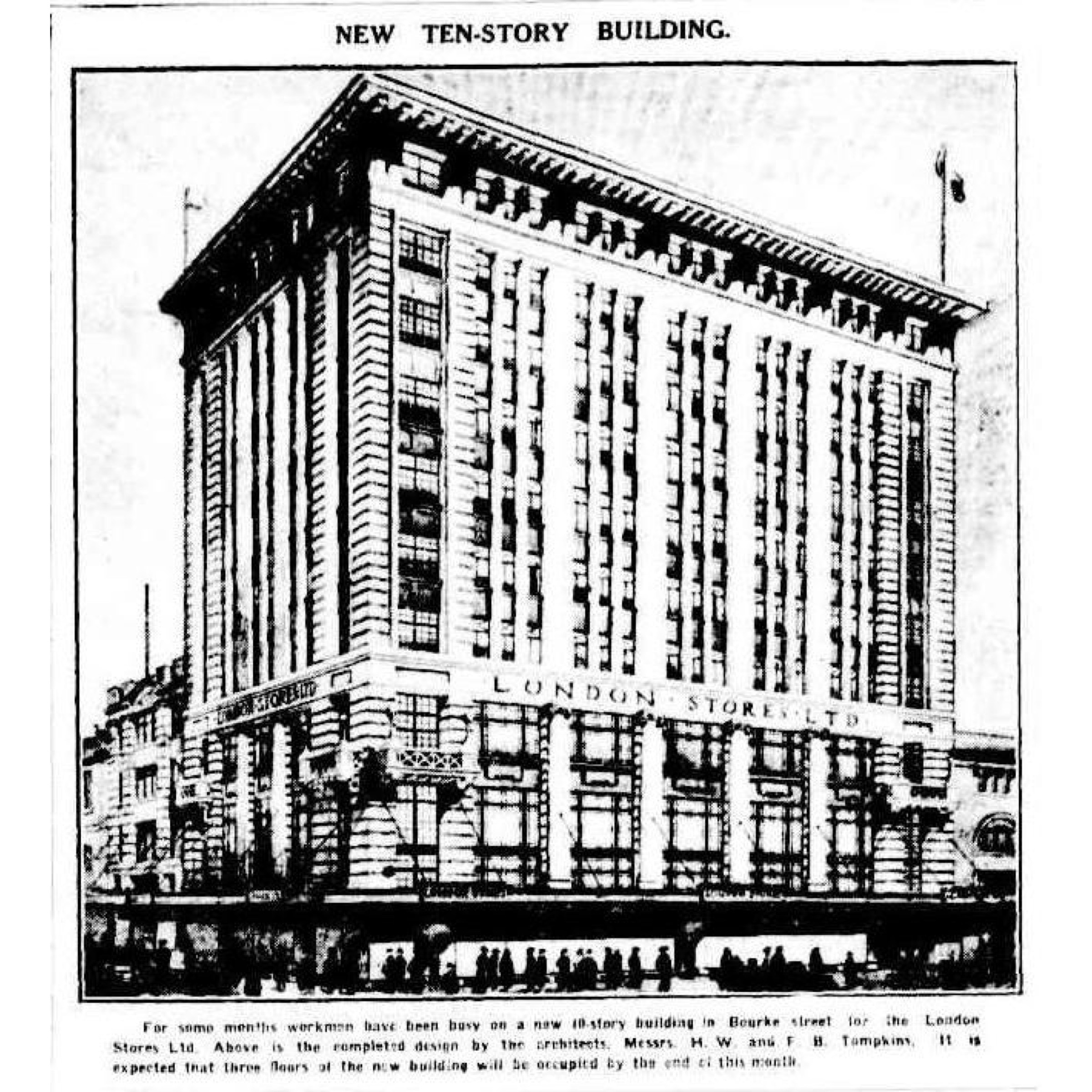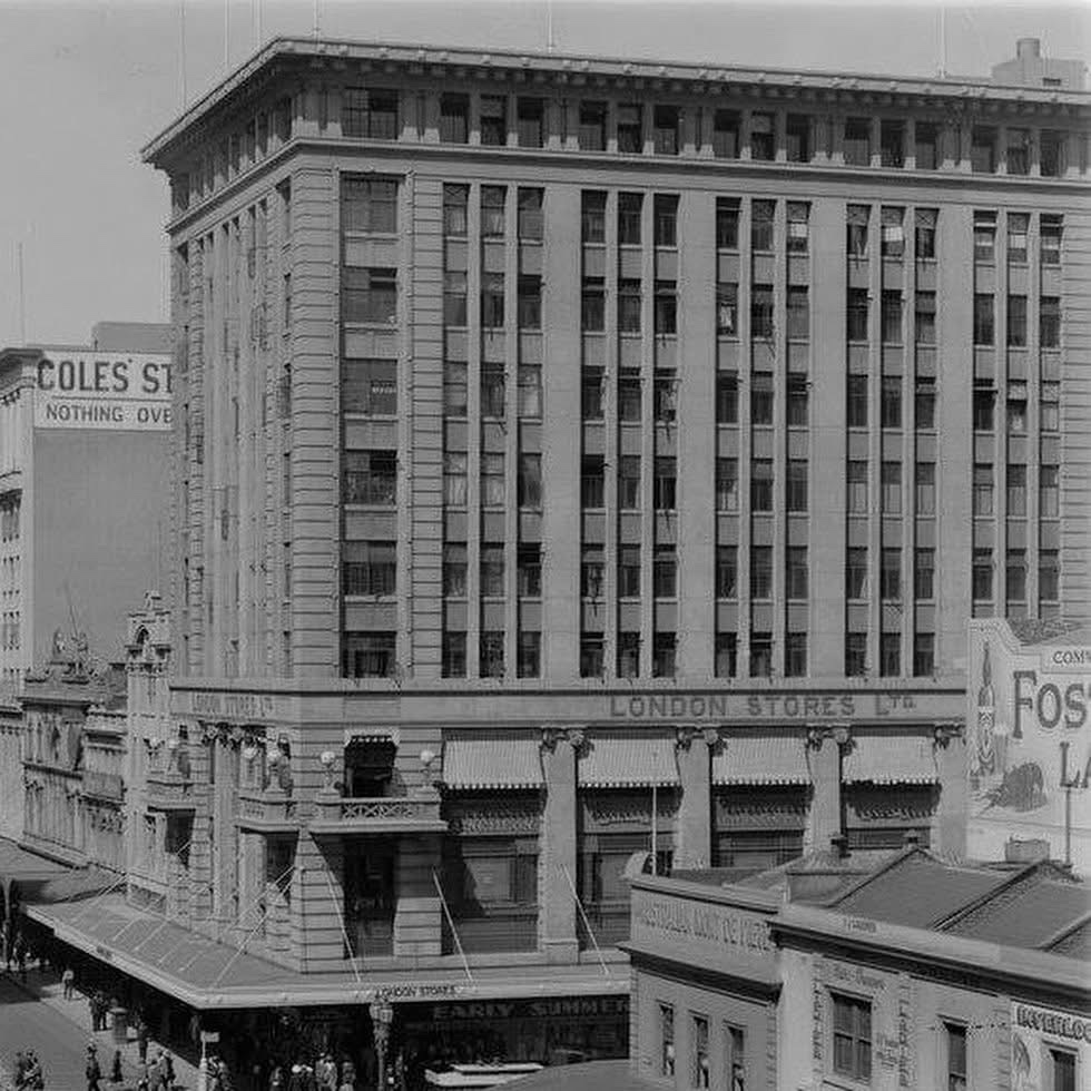 London Stores 1925 by the prolific Tompkins brothers #tompkinsandtompkins (who also did Myers Bourke Street opposite 10 years later). Excellent example of #CommercialPalazzo, an idea straight from US really, sometimes called #beauxarts, the ‘base tall middle and big cornice’ formula developed by #louissullivan in the 1890s.