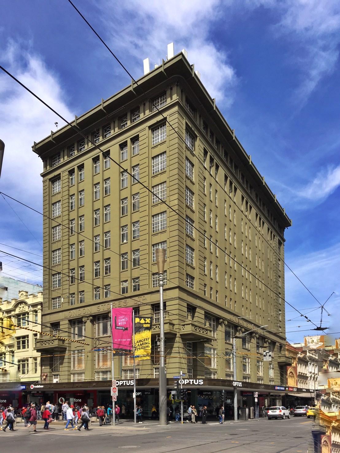 London Stores 1925 by the prolific Tompkins brothers #tompkinsandtompkins (who also did Myers Bourke Street opposite 10 years later). Excellent example of #CommercialPalazzo, an idea straight from US really, sometimes called #beauxarts, the ‘base tall middle and big cornice’ formula developed by #louissullivan in the 1890s. Behind the facades it’s actually U shaped, 3rd pic is from Myers. The Big Green Building as someone said on the tram the other day. Been green as long as I can remember- just found image from 1973, yep green. Originally probably just render grey, a bit lighter as in old postcard.