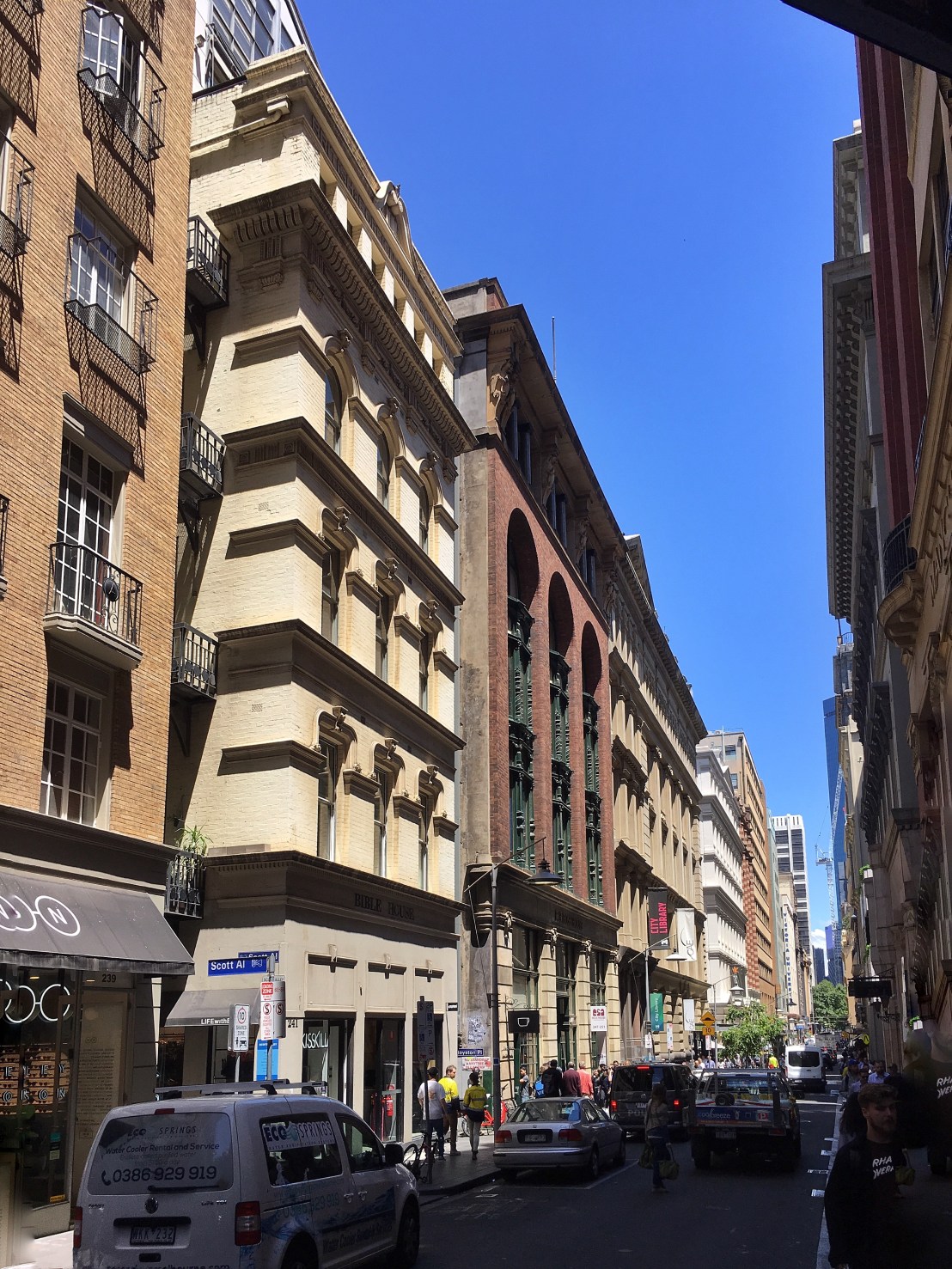 My favourite bit of #streetscape in #Melbourne, a whole strip of crunchy, masonry facades, all #ragtrade #warehouses built 1898-1940. It’s the south side of #FlindersLane looking west from #SwanstonStreet. Everything is under the 99ft #heightlimit (the limit on the big streets was higher, 132ft- that limit was reimposed in 1982 thankfully). So the north side is still low too, and in summer the sun gets right in !