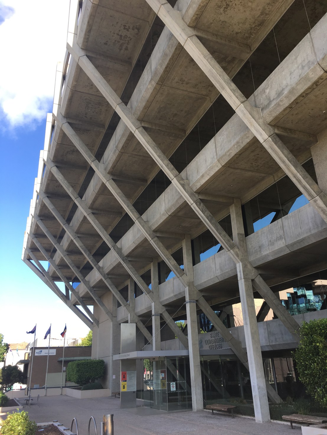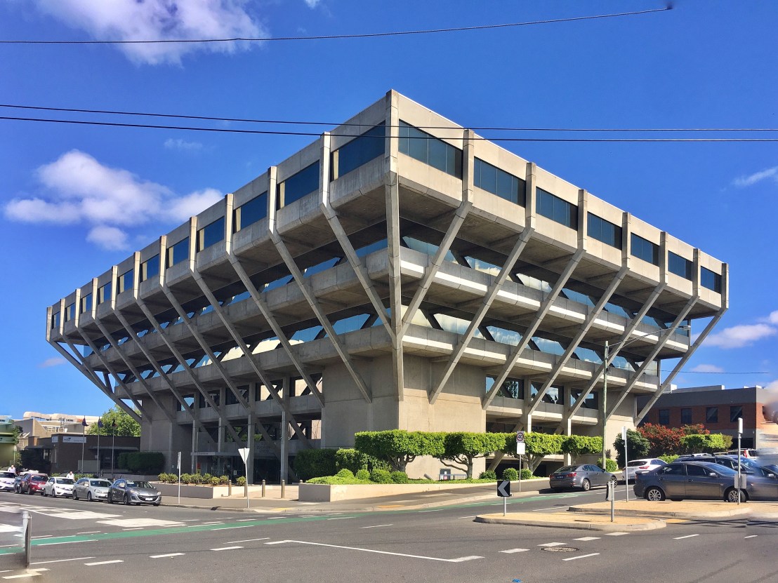 Once voted Geelong’s ugliest building (I think) Ive always always liked this one, the #GeelongStateOffices, completed 1979. Or rather, I’ve always been impressed by the chutzpah required to actually design it and build it – and it was the State Government ! Guess they wanted to make a splash. Plus the Victorian #PublicWorksDepartment was totally into #Brutalism from the mid 70s into the early 80s, though this is more about structure than chunky, rough concrete forms, in fact the structure seems a bit light, it’s like ‘how does it stay up?’. They were clearly inspired by the #GeiselLibrary, completed 9 years before, much more complex and the structure much more dominant.