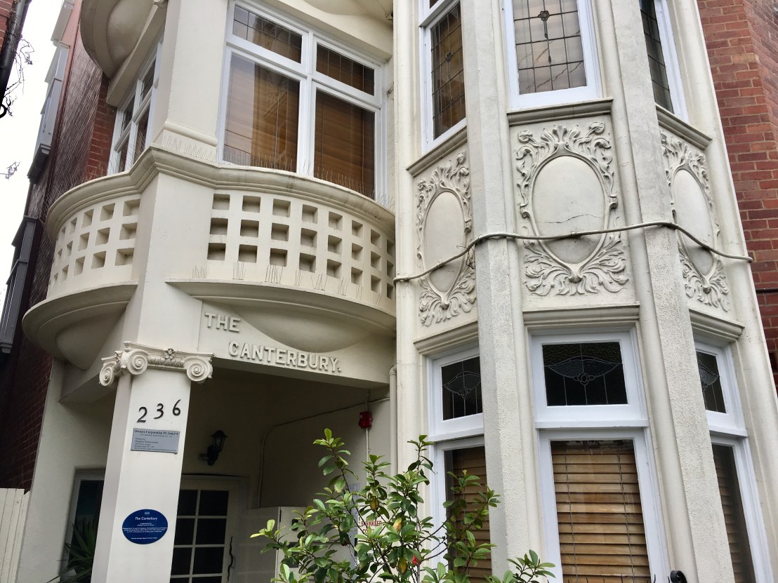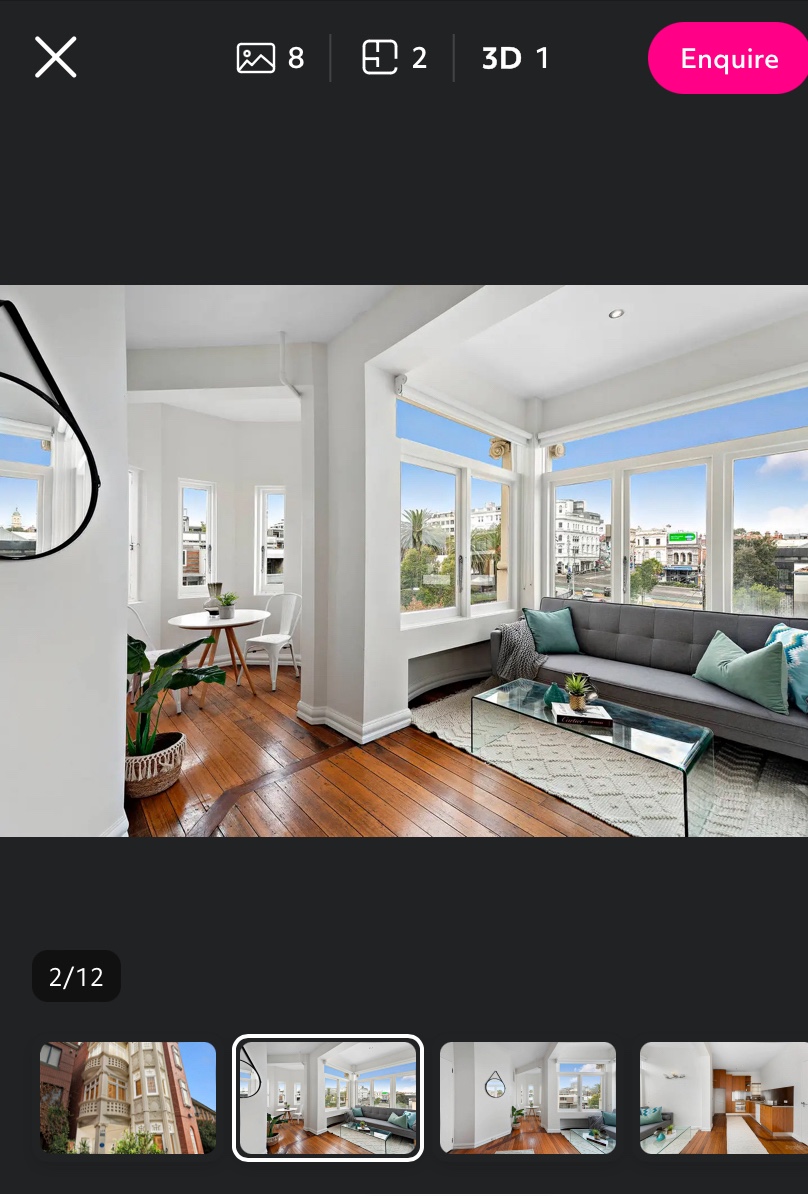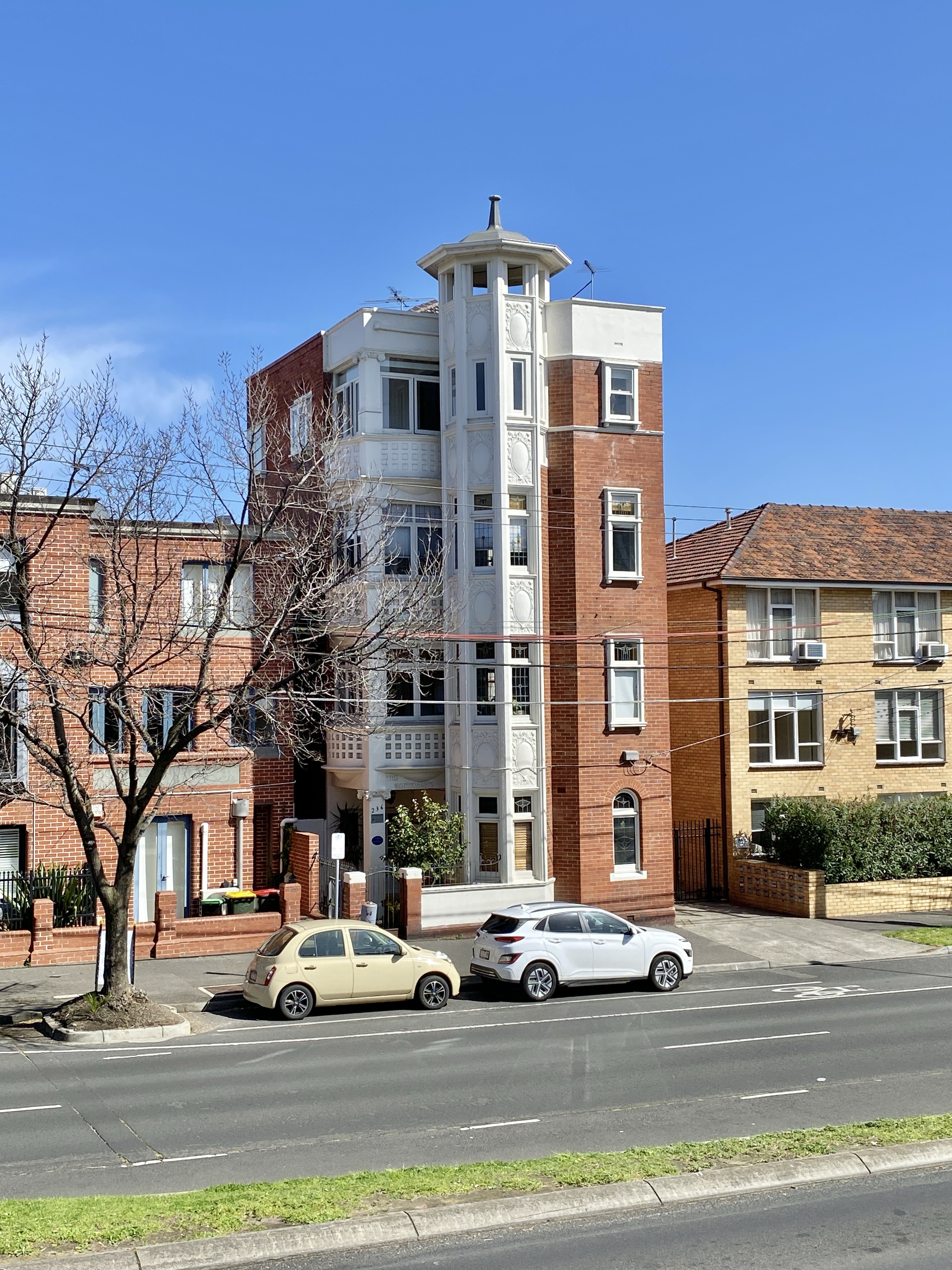 The Canterbury, on Canterbury Rd, #StKilda, weirdly tall and skinny, built 1914, amongst the first wave of flats built in Melbourne, when still at the experimental (for Melbourne) early stage. This was built like 3 single storey terrace houses on top of each other, though it’s a tiny site, smaller than the average terrace house. The top floor was added 5 years later in 1919, with two one bed flats, a long way up, but a good view. Designed by #TompkinsandTompkins (brothers HW and FB), a rare residential design for them, in whats called #EdwardianFreestyle, ie a style freely composed of various Edwardian bits like the bellied balconies with gridded pattern, an Arts&Crafts tower/turret with flat roof, and overwrought baroque #cartouche things, and of course #redbrick. I snuck in a pic of the lobby. Plans and view from the top front flat from real estate ads. Also note that I think the place next door to the left built in the 90s perhaps sets back on the corner, not blocking the corner view like it might have.