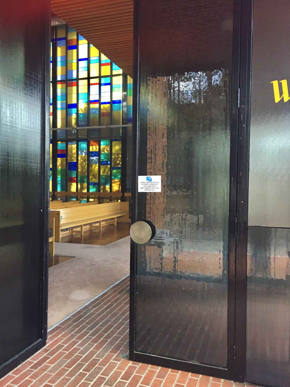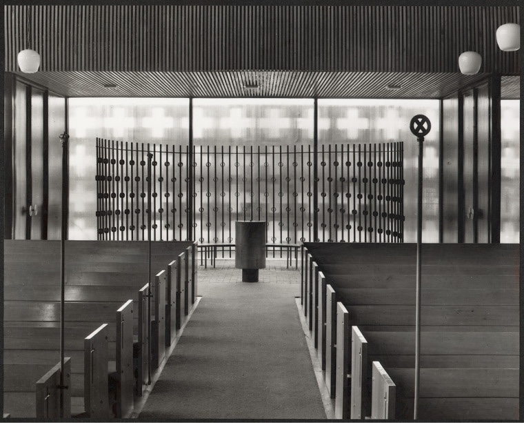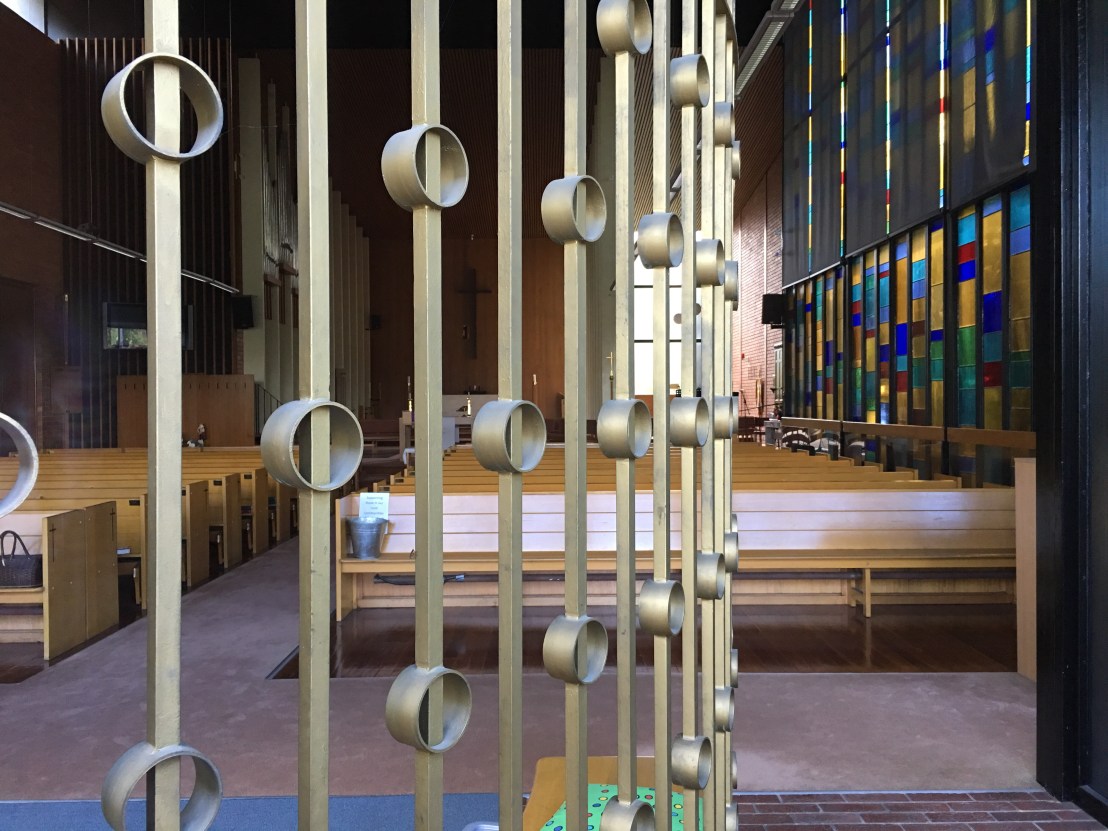 #StJamesGlenIris, #BogleBanfield, 1959, interior; strictly #symmetrical, with this delightful semi-circular screen around where the font was originally; there’s a chapel off to one side, divided by vertical sticks, with a window of translucent glass behind. Very high ceiling, which slopes down over the sanctuary creating a forced perspective. There is a full-height #stainedglass window along the nave on the east side only, which was originally vertical ribbed #translucentglass, like some of the other windows (including the one I’m looking through, must’ve been replaced by plain glass. The #altar is rather dim, and would have been even dimmer with the now gone concrete block walls that were on outside of all the windows – I guess like many earlier churches, and unlike modern ones, they didn’t mind it being a bit gloomy. It all looks very original, except the pews in the chapel, and the loss of some of the pendant lights. And the window glass.