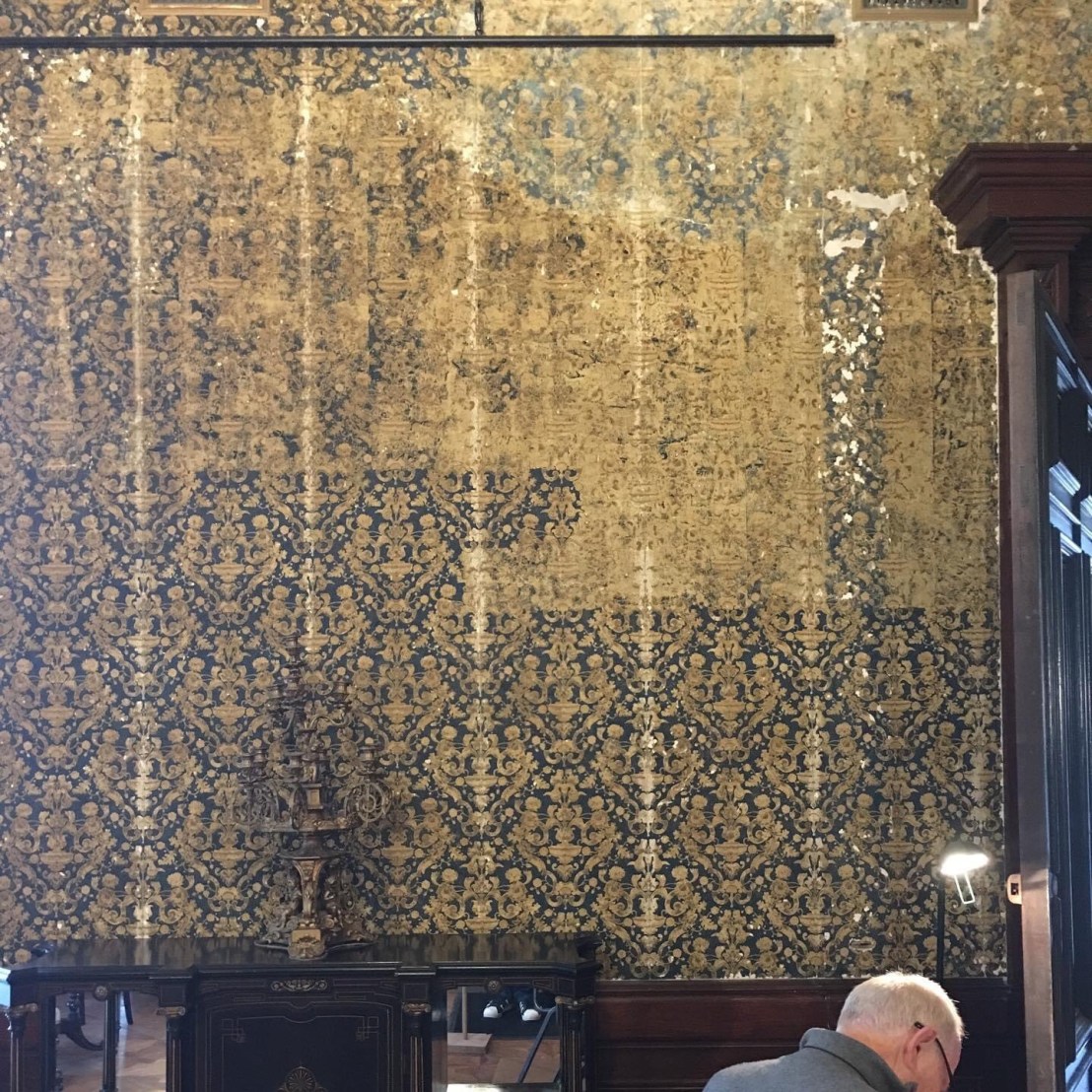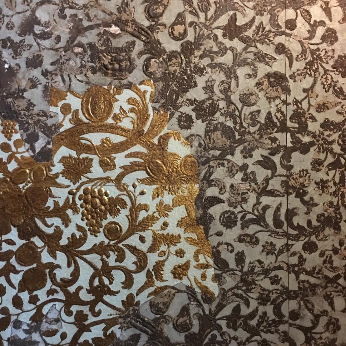 Some of the extraordinary #wallpapers at #Labassa, in fact, most of them I think, mostly variations of a gold floral swirl on a pale background, and all except one heavily embossed (or actually made like #papiermache, with a slurry of sawdust and glue). I reckon then were all more brightly coloured originally, certainly the stairhall paper was bright gold foil on odd white, partly restored in the first pic. The second one is the boudoir paper, lots of colour, but faded now. Last one is the parlour ceiling, maybe partly in plaster.