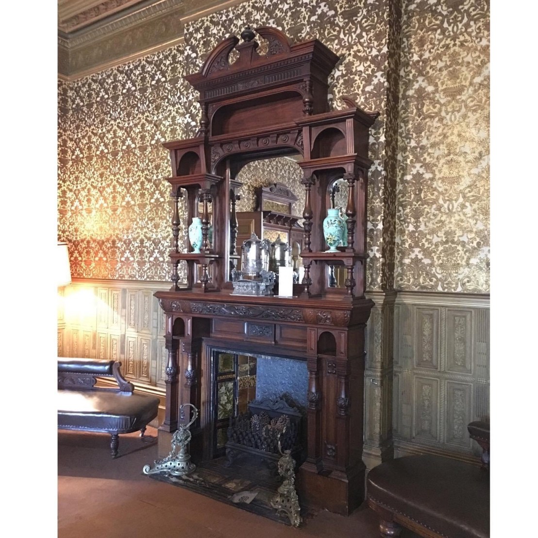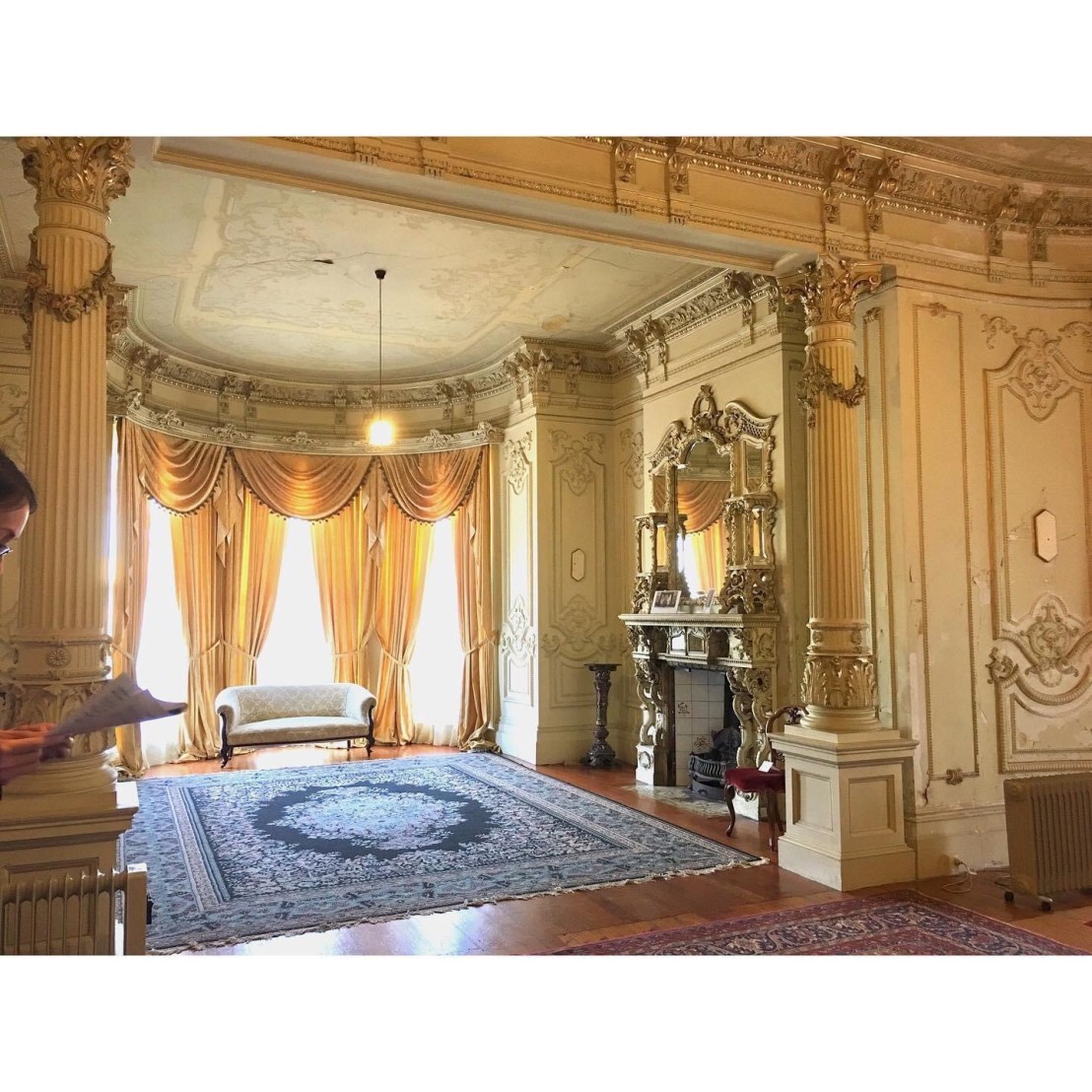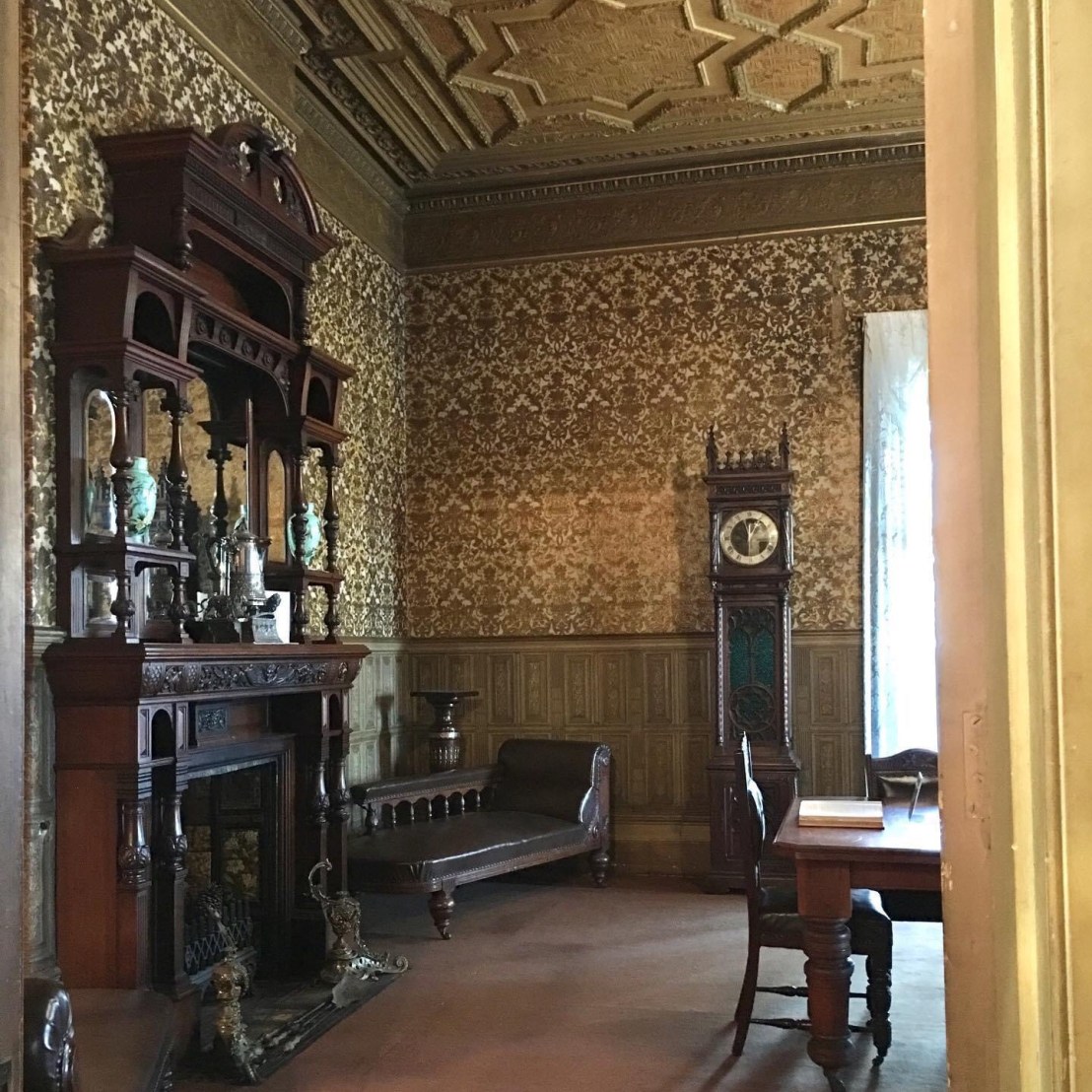 This corner of the dining room almost has enough furniture to give some idea of how it might have looked in 1890. Great huge ornate #overmantle, elaborate panelled ceiling, and cream and gold wallpaper.