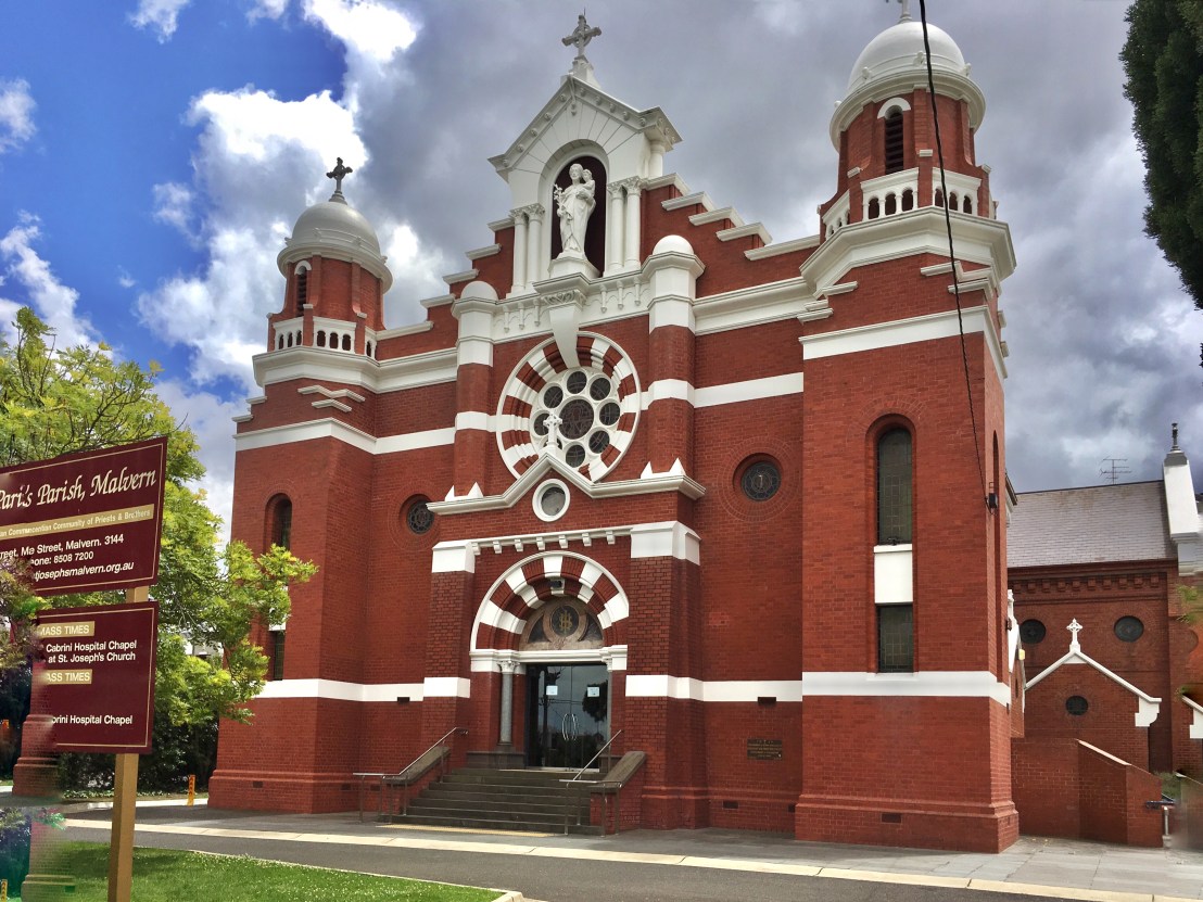 #AugustusFritsch really went to town on this one, his first major church, #StJosephsMalvern, built 1908-8. He did at least one earlier design that was boldly red & white (‘#bloodandbandages’), a bit more Edwardian, this one a mad combo of #Romanesque with stepped Flemish gables and #Baroque domed turrets; the @nationaltrustvic listing notes it’s part of the anti-Gothic approach of the Catholic Church at this time. Love it ! (Interior not my pic).