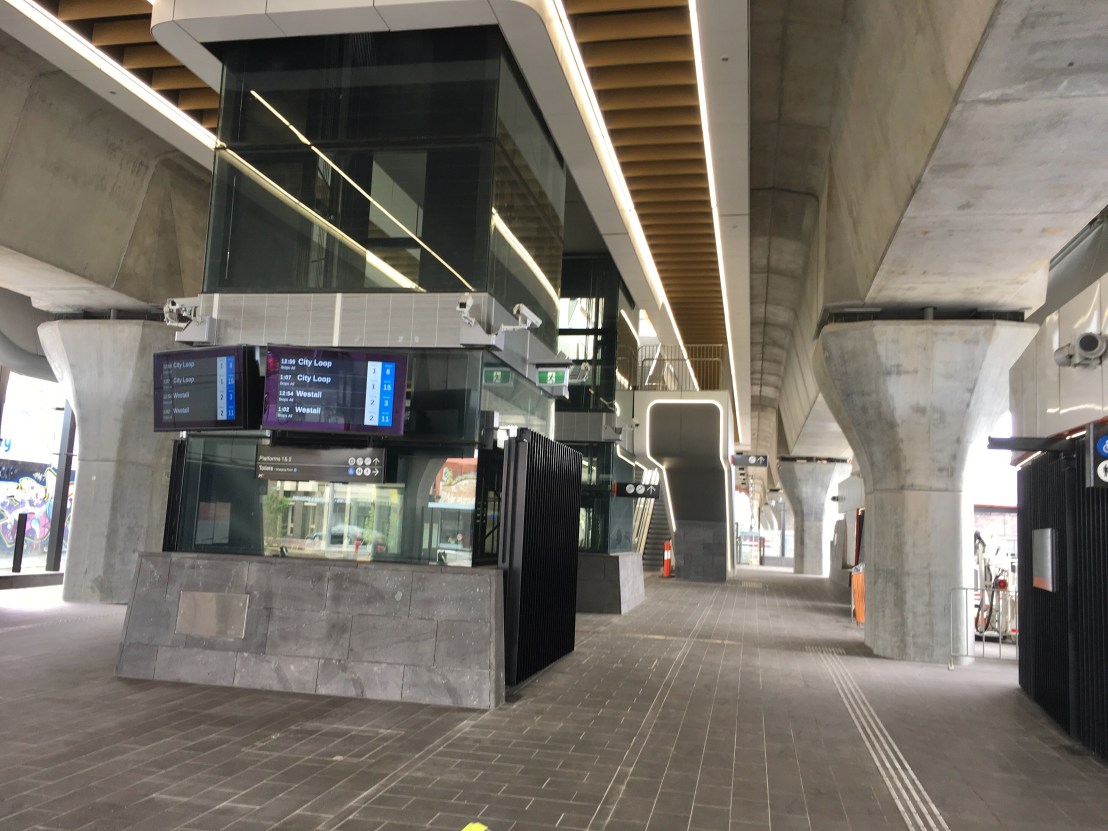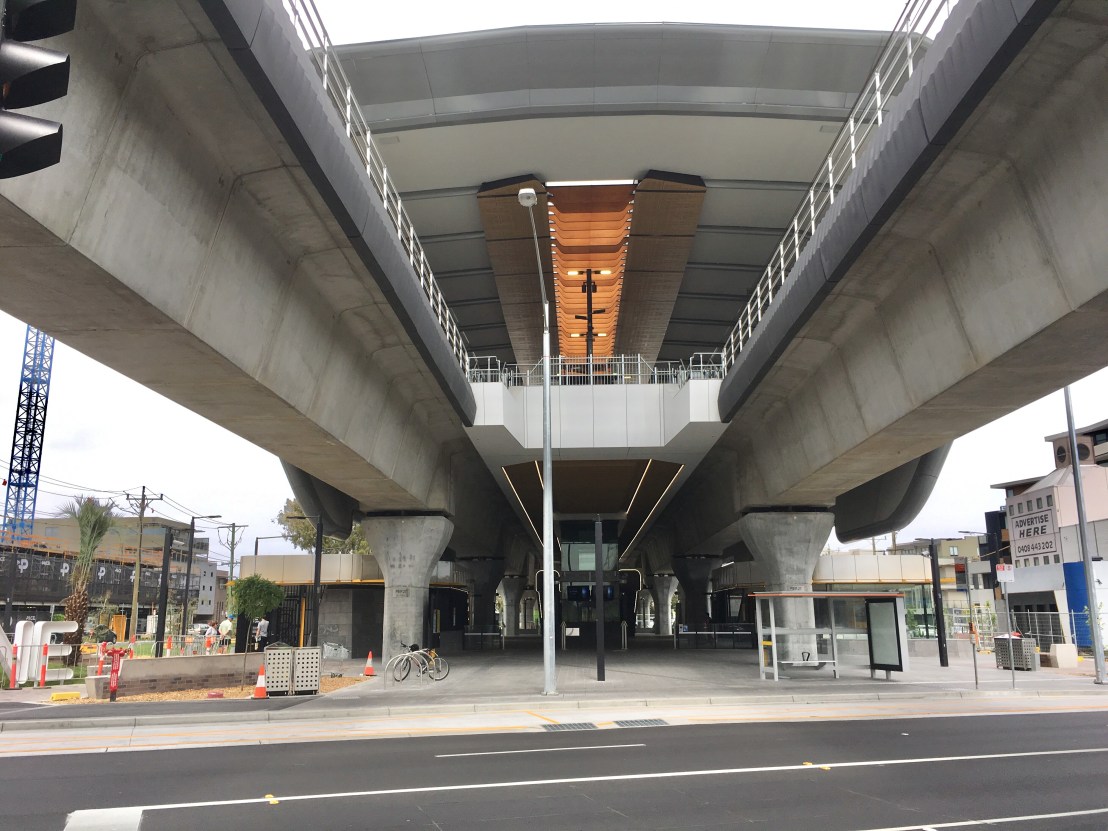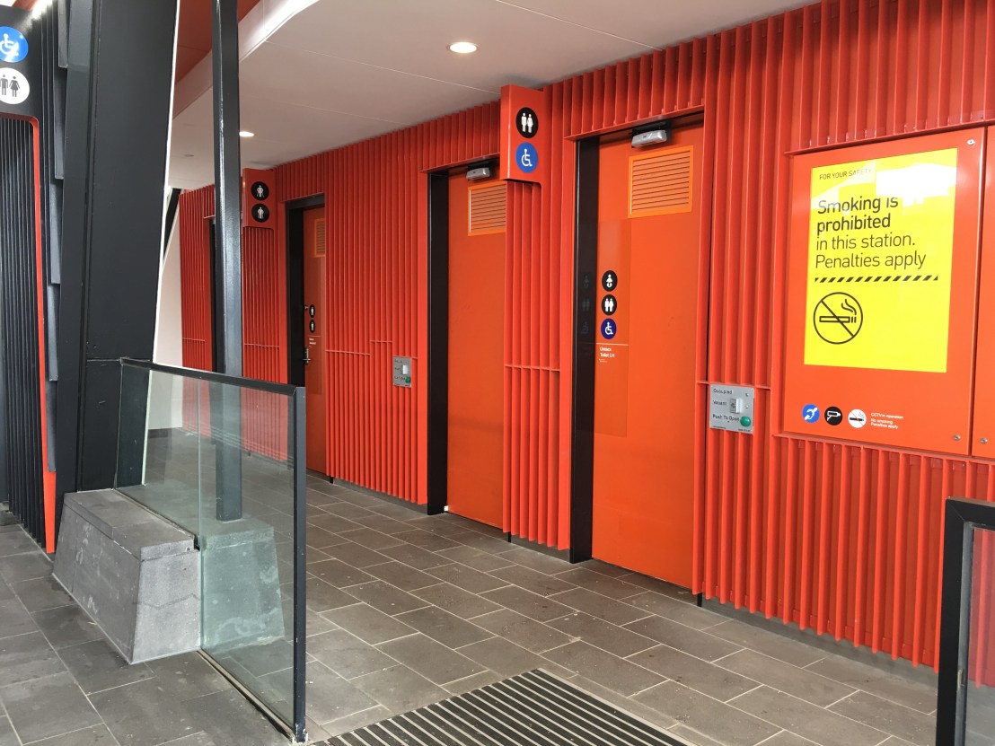 The #Skyrail stations are actually huge compared to the crappy 30s-60s shops next to them (in one case less than a metre!), but it doesn’t feel bad, or cramped it even ‘under’ probably because it’s so high, that you tend to sort of look under it, and the station itself is off to one side. Lots of grey, but that’s ok, feels nice and solid (but maybe will age badly ?), big fat beams and viaducts, still not sure why so huge, engineers being overly safe I suppose. No graffiti (yet). I like the huge beam at #HughesdaleStation that allows one leg to go off to one side, increasing the spaciousness. A splash of colour with the toilets, but otherwise everything is grey, black whirs and rounded, with lots of #LEDstrip lighting, looks vaguely #spaceage, wonder how long it’ll last ?