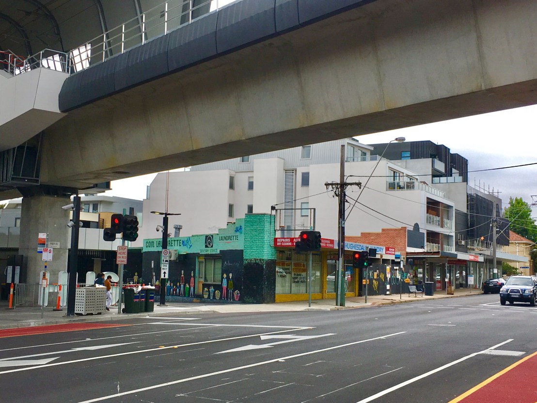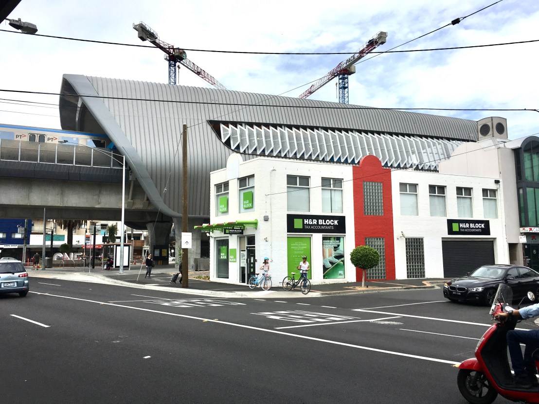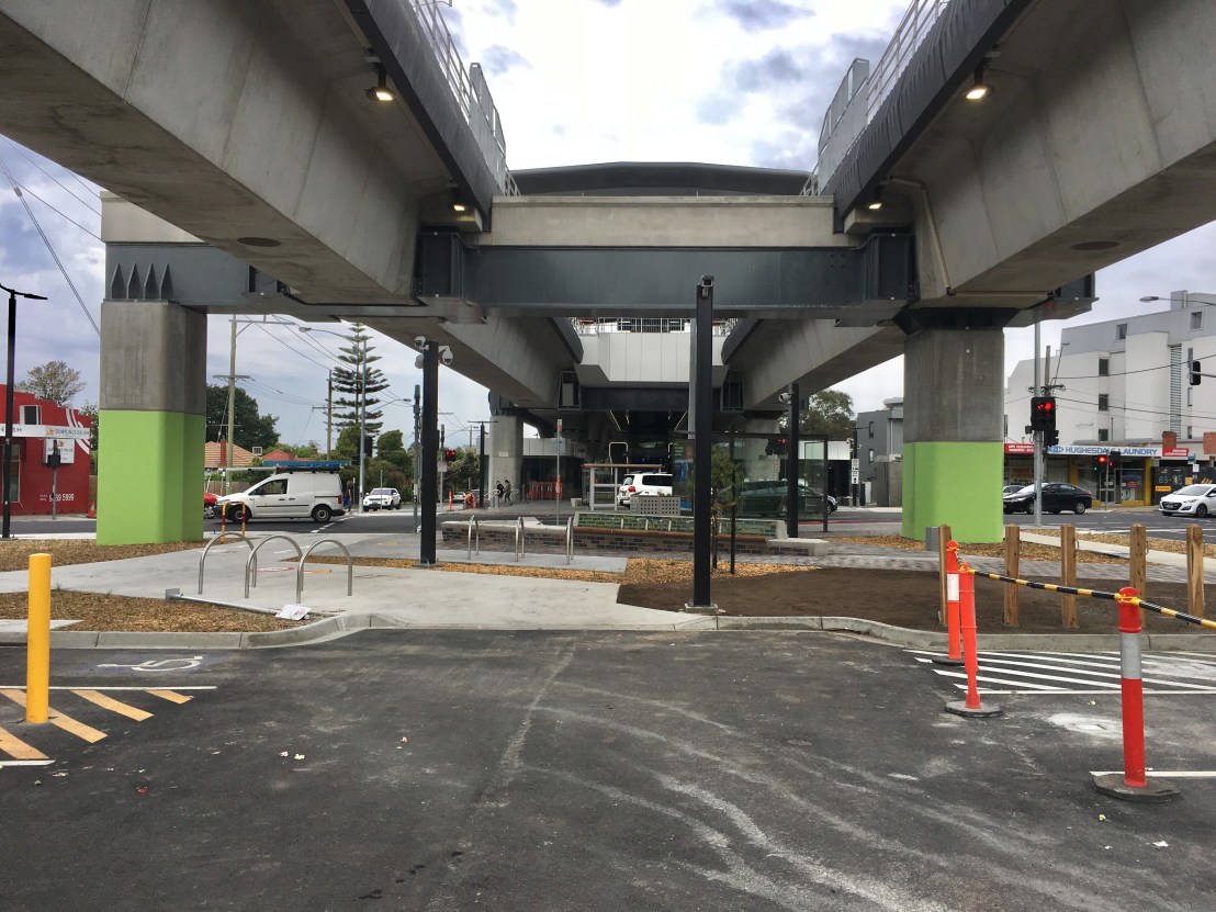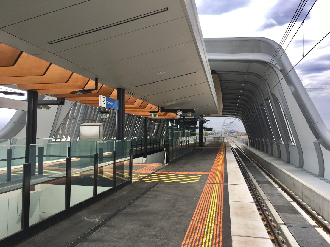 The #Skyrail stations are actually huge compared to the crappy 30s-60s shops next to them (in one case less than a metre!), but it doesn’t feel bad, or cramped it even ‘under’ probably because it’s so high, that you tend to sort of look under it, and the station itself is off to one side. Lots of grey, but that’s ok, feels nice and solid (but maybe will age badly ?), big fat beams and viaducts, still not sure why so huge, engineers being overly safe I suppose. No graffiti (yet). I like the huge beam at #HughesdaleStation that allows one leg to go off to one side, increasing the spaciousness. A splash of colour with the toilets, but otherwise everything is grey, black whirs and rounded, with lots of #LEDstrip lighting, looks vaguely #spaceage, wonder how long it’ll last ?