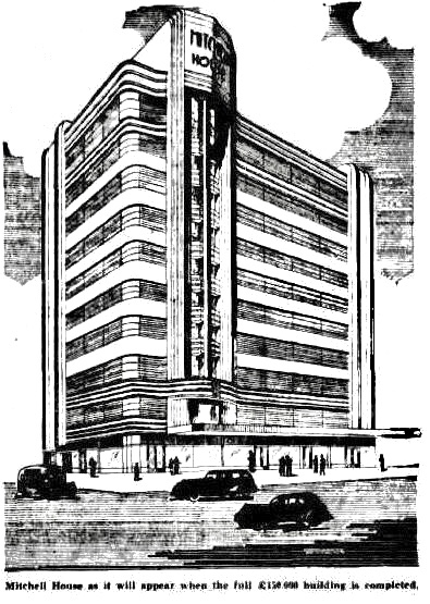 #MitchellHouse, found the original #HarryNorris design, from a 1937 Herald article when the current building was completed “in only five months”. So if the second stage had happened, it would have had more floors and more on the right, and a taller top to the vertical bit, which also looks more angular.