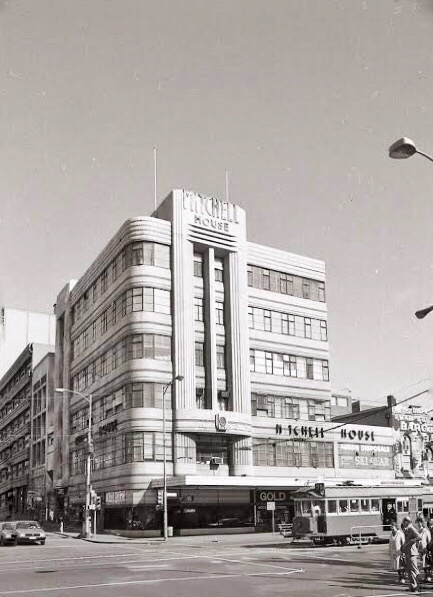 The article was quite effusive : “Essentially modern in design…the building is notable for vast expanse of glass – 10,000 feet in total area…In place of conventional windows, walls of transparent glass about 10ft high sweep around the entire frontages of each floor…”. “The main entrance to the building is from Lonsdale Street, and at once a modern note is struck by the high ceiling carried out in horizontal lines, and the terrazzo floor in attractive patterns.” Second photo early 1980s, Graeme Butler via Flickr.