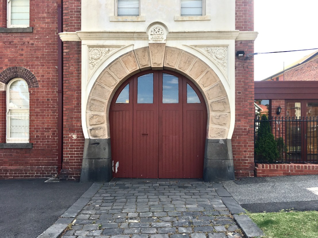 The #FlemingtonFireStation, built 1896, across the road from the 1891 #FlemingtonCourtHouse, almost but not really a civic precinct. Love the #horseshoearch (note it’s not a #keyholearch, slightly different), no architect listed, but this arch pretty much the same as the #ElsternwickFireStation, same date, so prob same architect, #JTKelleher. It stopped being a fire station in 1961. B&W photo, State Library Victoria, 1962. Update : I’m told it was definitely Kelleher. Also, the windows above the arch had been turned into a rectangular one some time ago, recently restored, not quite as good as original.
