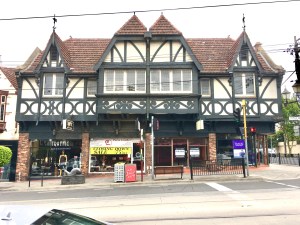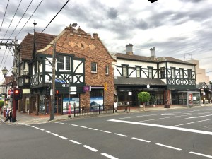 #Picturesque but actually #symmetrical – the 1934 #MockTudor shops on the corner of Toorak Road and Grange Road. Designed by Leslie Reed (not #RobertBellHamilton as previously thought), they were built in front a Victorian house, you can see the chimneys round the side, where they just plastered the walls with #halftimbering. The front much more creative, with paired #jerkinhead roofs, the central bay #jettying out twice, and very steep #gables either side, like #HanselAndGretel ! I think he was trying to outdo the 1932 Tudor across the road which was by Robert Hamilton, but those ones just a little more nice detail. The ones next door on #Toorak Rd are quite good too, rough brick, and slightly wonky timber work, complete with #adzing marks.