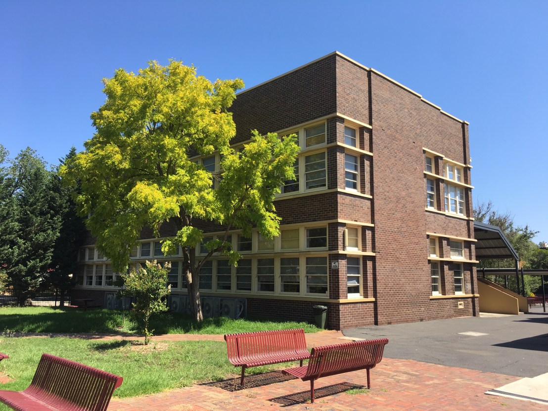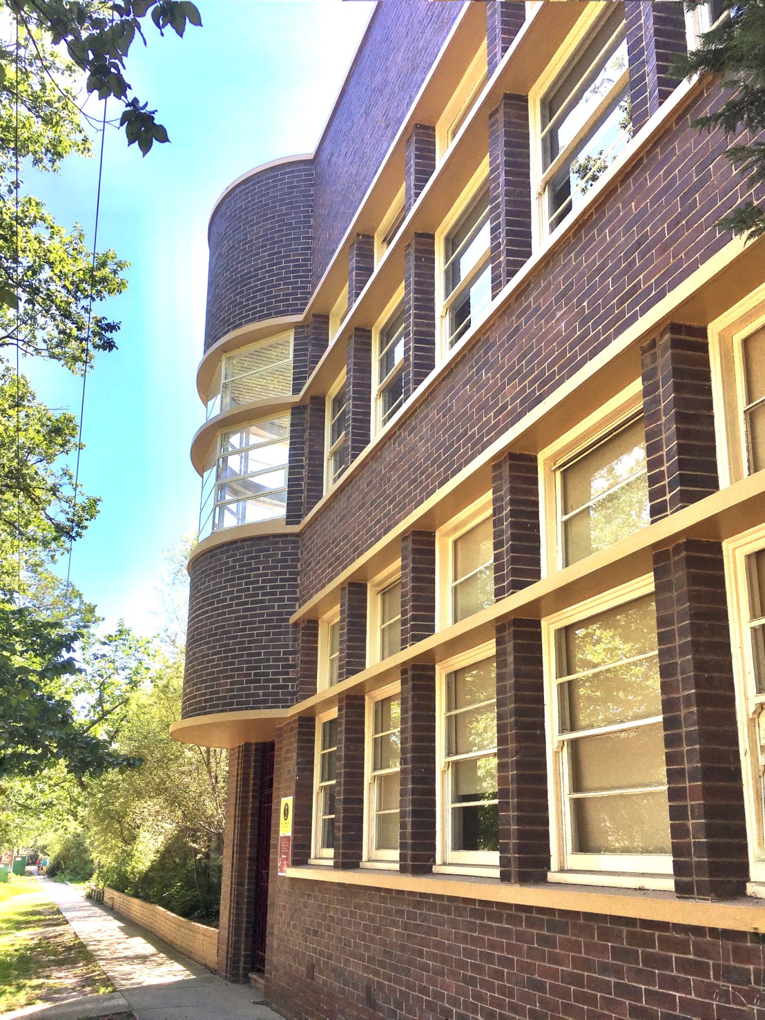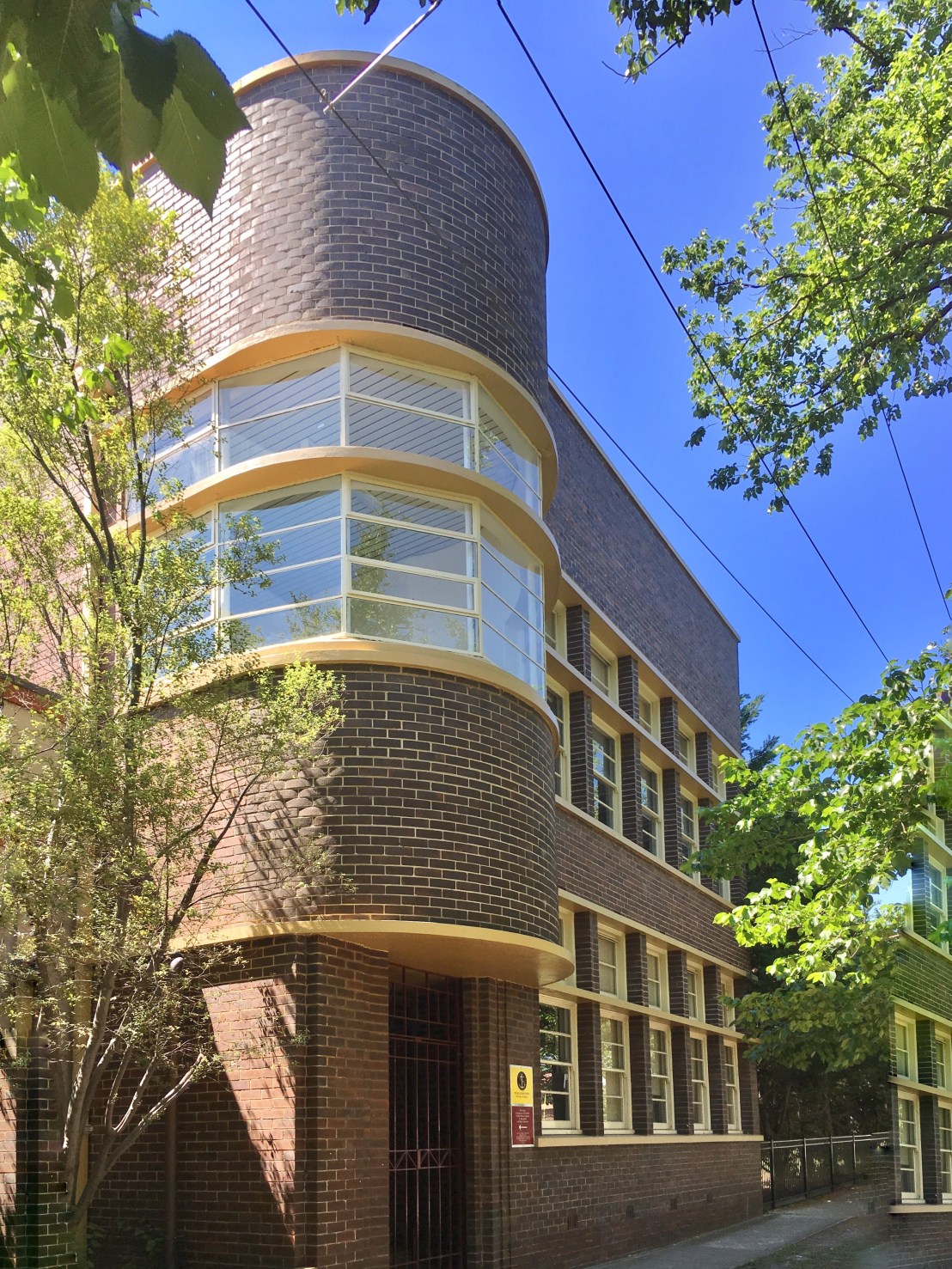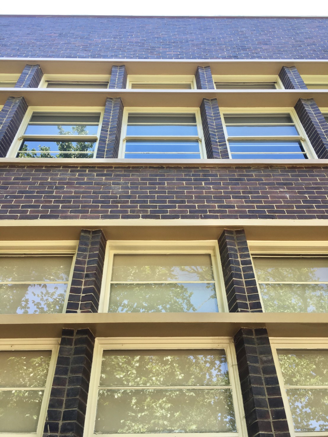 Lunch in #Williamstown, so had to have a look at #PercyEverett’s addition to #WilliamstownHighSchool, and excellent as always, looking like a superior 1930s office block almost, but it’s actually 1948 – Percy seems to have ignored modernism almost completely (#RobinBoyd etc must have been shaking their heads in disbelief). But it’s very nice, well built too despite post-war restrictions, with a semi-circular bay over the entry, and long horizontal windows, on the front subdivided by vertical angled brick piers, on the side a curious shallow zig-zag ‘eyebrow’ (not much shading for this north-east side though); this block of 6 classrooms was added in front of the original 1867 building, which had been built as Williamstown Grammar, which moved out in 1914 when the High School was established. Percy put his block just to one side of the old main facade – bet he was thinking to do another symmetrical one eventually, but instead someone plonked one right in front, looks like 80s postmodern.