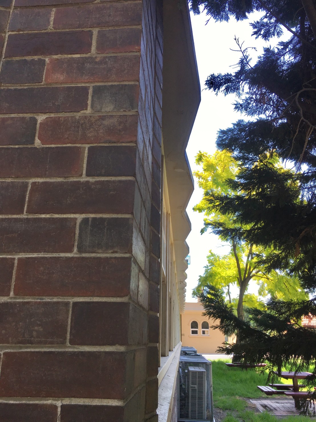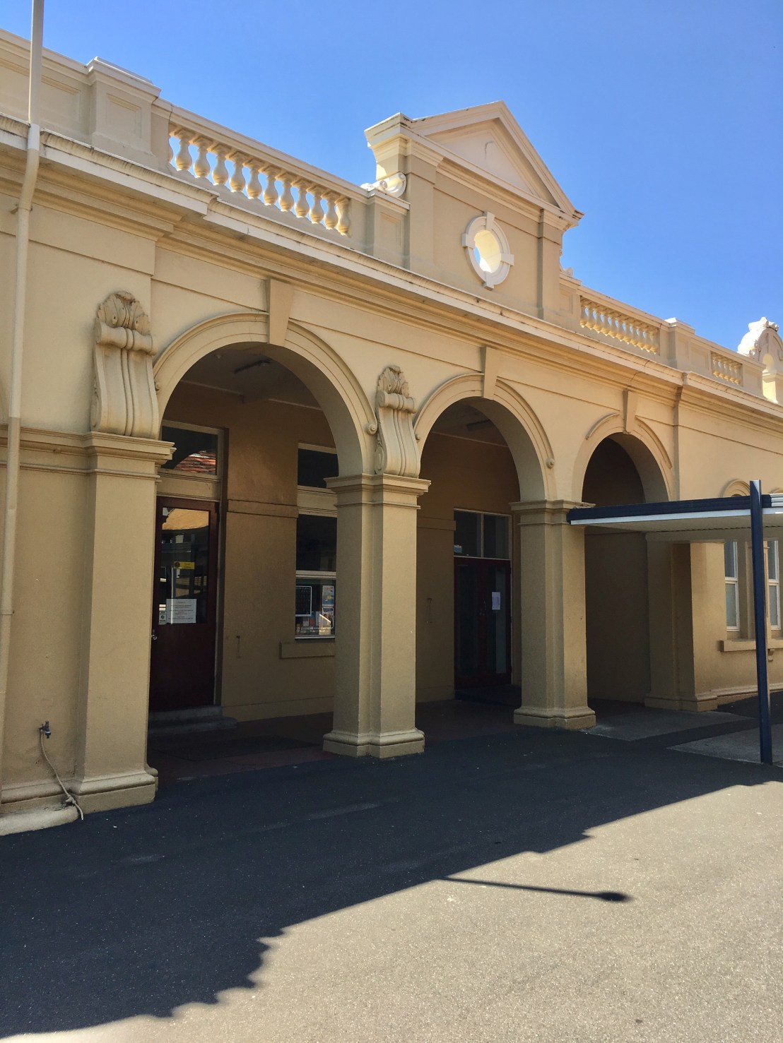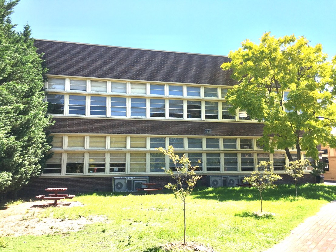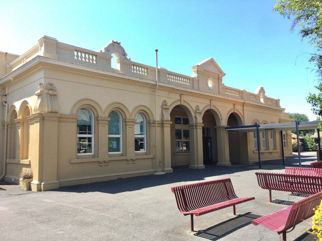Lunch in #Williamstown, so had to have a look at #PercyEverett’s addition to #WilliamstownHighSchool, and excellent as always, looking like a superior 1930s office block almost, but it’s actually 1948 – Percy seems to have ignored modernism almost completely (#RobinBoyd etc must have been shaking their heads in disbelief). But it’s very nice, well built too despite post-war restrictions, with a semi-circular bay over the entry, and long horizontal windows, on the front subdivided by vertical angled brick piers, on the side a curious shallow zig-zag ‘eyebrow’ (not much shading for this north-east side though); this block of 6 classrooms was added in front of the original 1867 building, which had been built as Williamstown Grammar, which moved out in 1914 when the High School was established. Percy put his block just to one side of the old main facade – bet he was thinking to do another symmetrical one eventually, but instead someone plonked one right in front, looks like 80s postmodern.