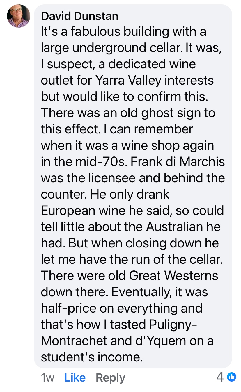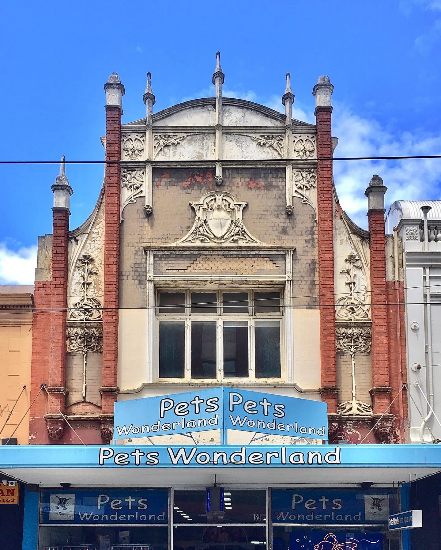 #FabulousFacade to a shop in #ChapelStreetPrahran, so vertical and spiky, with lashings of #ArtNouveau; sadly some of the (red?) tiles falling off, the rest painted out beige. Can’t find much about it, but looks c1910; in 1905-8 there was an #OysterSaloon, raided for gambling, and for “horribly offensive” oysters (!), then by 1912 it was #Boberski’s high class grocer and wine shop, still there in 1937, and then in the 70s it was a Franeva’s specialist wine shop, which closed in 1977.