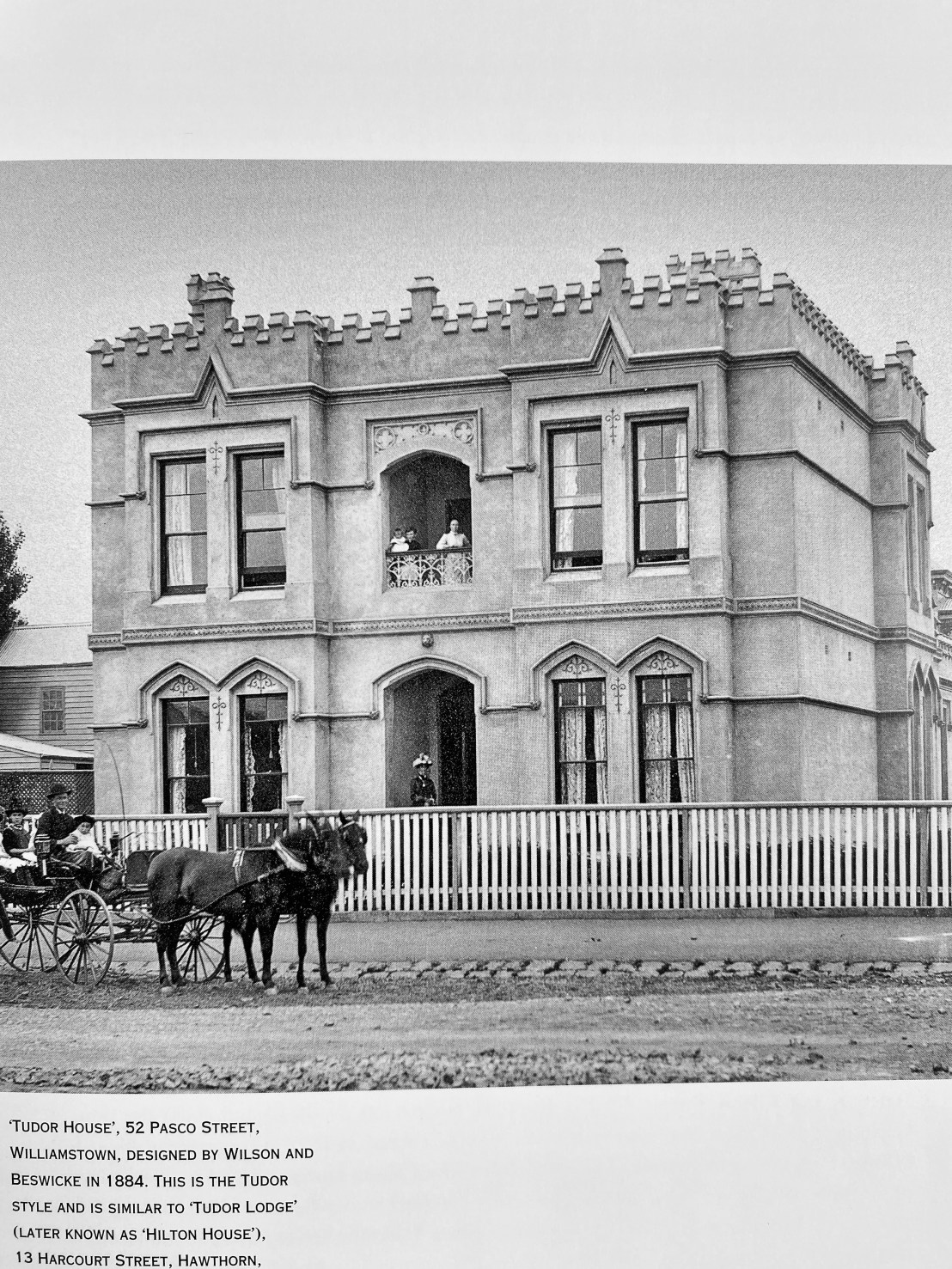 IRepost 2019: Everymans home is his Tudory castle. Built in Pasco Street, Williamstown, in 1883, this impressive house was designed by #JohnBeswicke, and it’s one of the best things he did. Also quite unusual for the 1880s, when nearly everything was elaborate #Italianate, or polychrome brick- this is chaste by comparison. It’s called #TudorHouse (surprise !), as seen on the #frontdoor, which is #woodgrained, in imitation of oak. I once saw a photo spread of the inside, where lots of stencil patterns on walls and ceilings remain. Beswicke wasn’t averse to repeating designs, and this is very similar to Tudor Lodge, in Harcourt Street Hawthorn (2nd last image), which he built in 1873 for his father. Early photo from an excellent book on Beswicke by grandson K Bethell, published in 2011 (when he was 92!); lots of great family photos as well as plenty of buildings and plans.