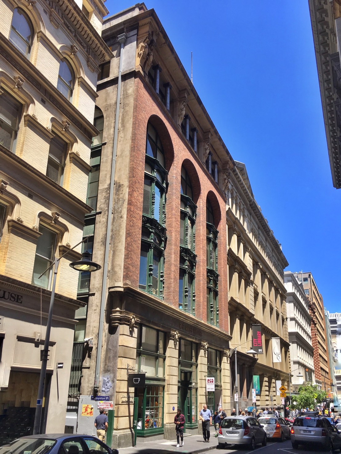 Hmm might have been better with wide angle and not strong sunlight…. anyway, this is the terrific #SargoodWarehouse in #FlindersLane, terribly important as one if the earliest and the most inventive #TallArchedRedBrickRomanesque building in #Melbourne, built 1899 (check out the spindly timber framed bowed windows Iberia 3 floors !). A local version of the American #RomanesqueRevival that dominated the next 10 years of #citybuildings especially #warehouses, especially in Flinders Lane, then the centre of the #ragtrade. Curiously this was designed by Sydney architect #JohnSulman (as #SulmanAndPowers, and of the #SulmanMedal and the #SulmanPrize), one of only a few of his bigger buildings to survive – the man is more famous than his buildings, since he was later a lecturer and committee man. FunFacts: this is only half, it used to go right through to Flinders Street (that half replaced by the 1931#SECbuilding now a Unilodge), showing how great the fabric import/export business was for #FrederickSargood, who built the fab #RipponLeaEstate on the profits, and the co kept going for ages, building another Sargood Warehouse further up the lane in 1928, now apartments. Since 1987 it’s been owned by the #RossHouse charity whose main deal is leasing affordable office space here to community groups.
