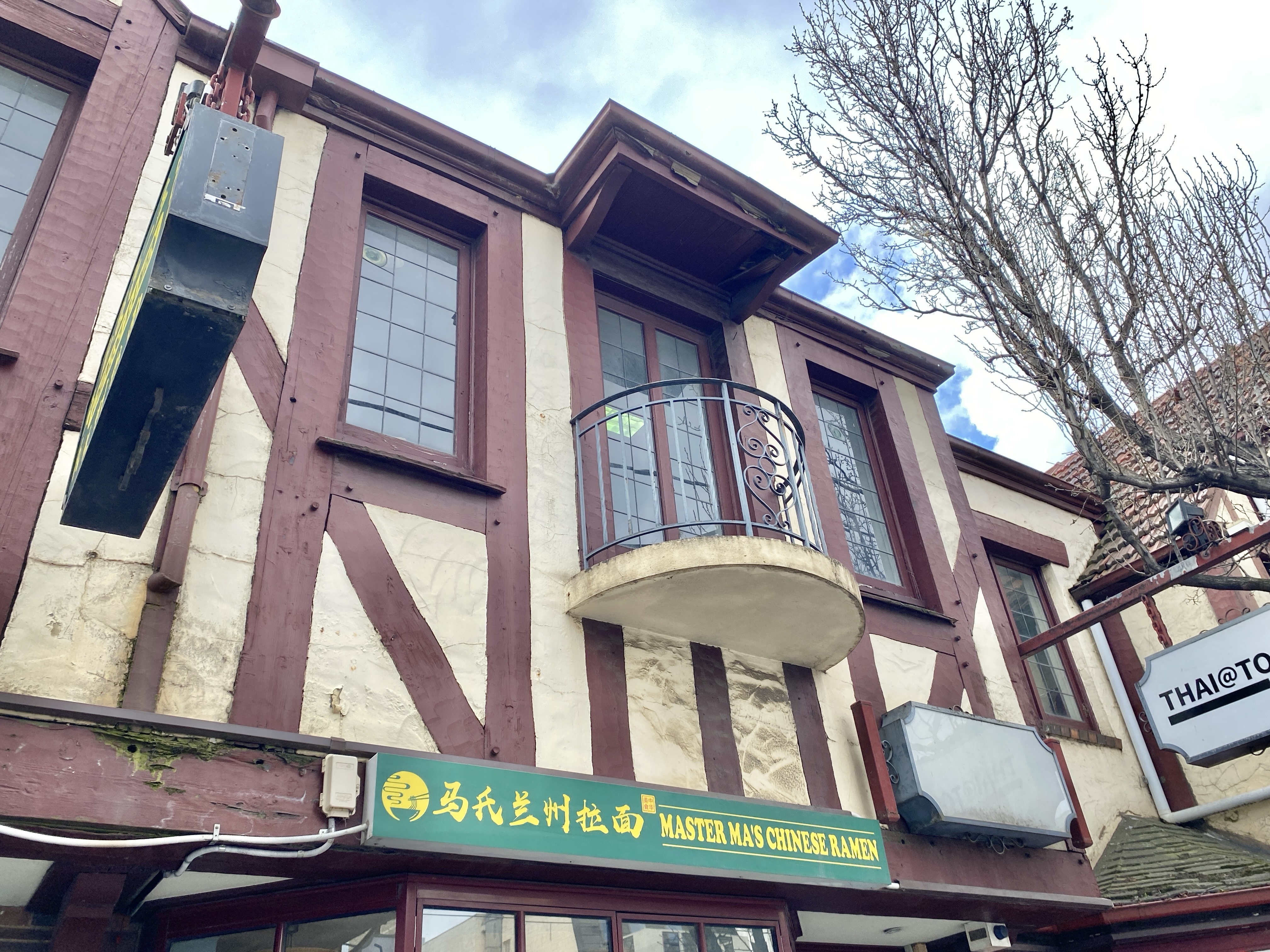 It has interesting asymmetrical gables and windows in the central section, which unusually is setback creating more footpath, but the main gables are rather plain. The render is a bit rough and so is the face of the timbers, as if hewn by an adze, for that medieval flavour. Original shopfronts. Seen better days though.