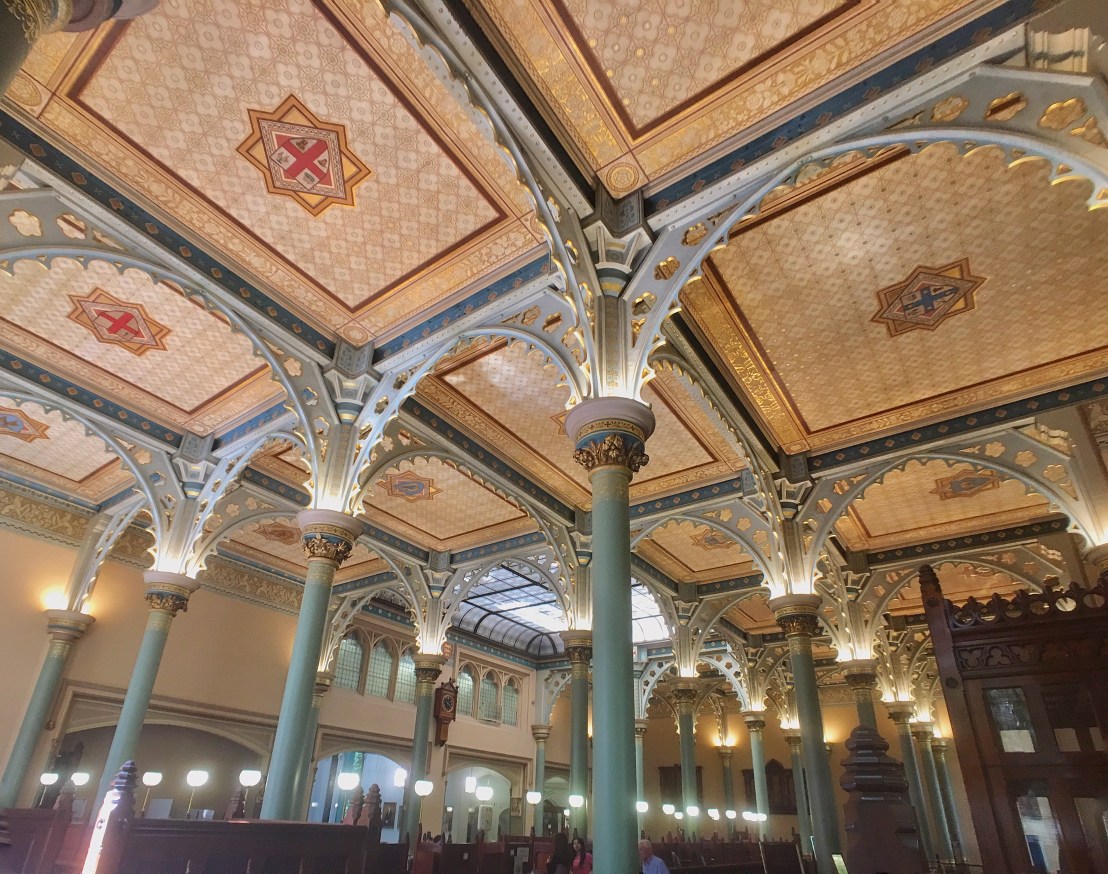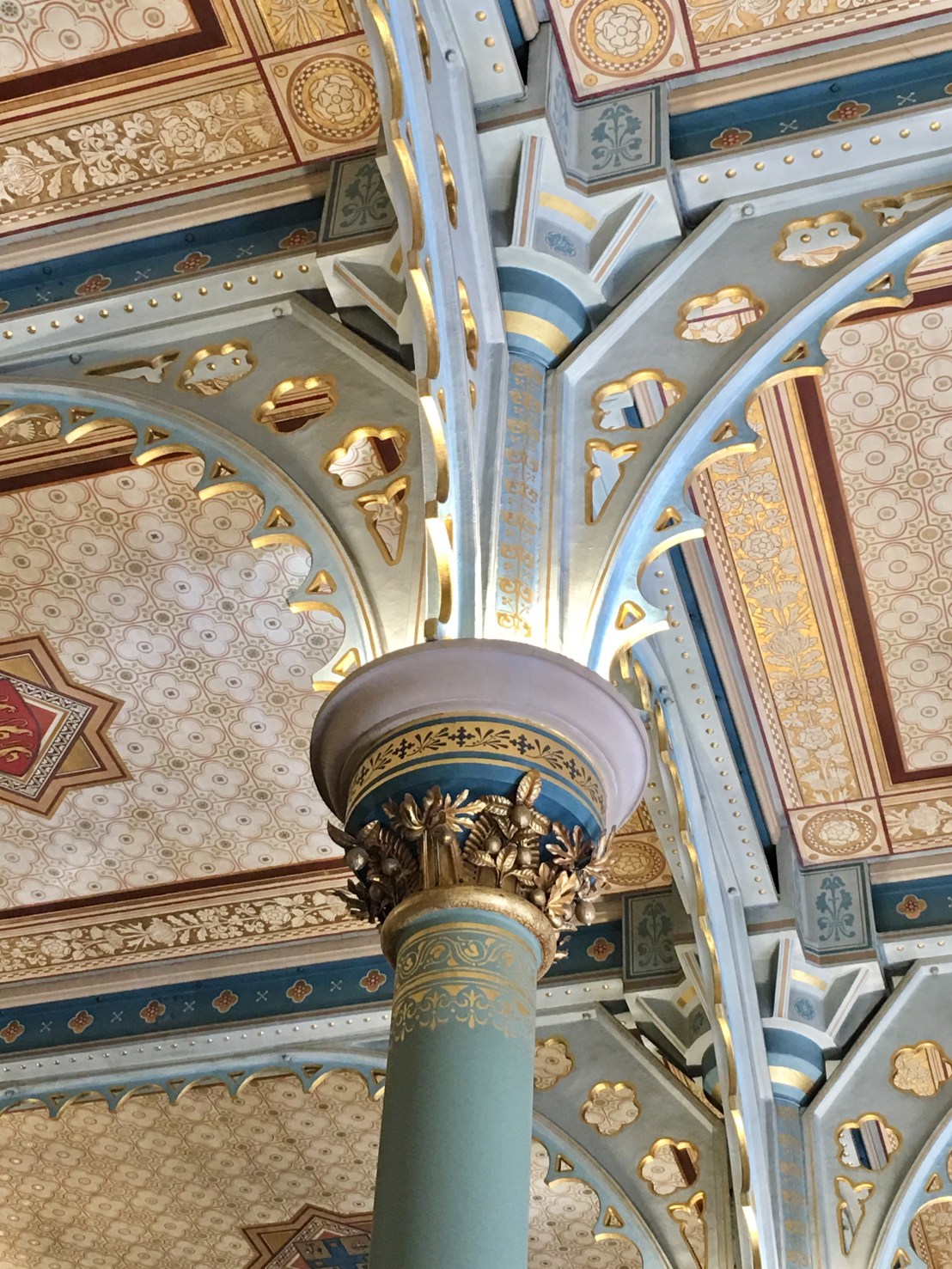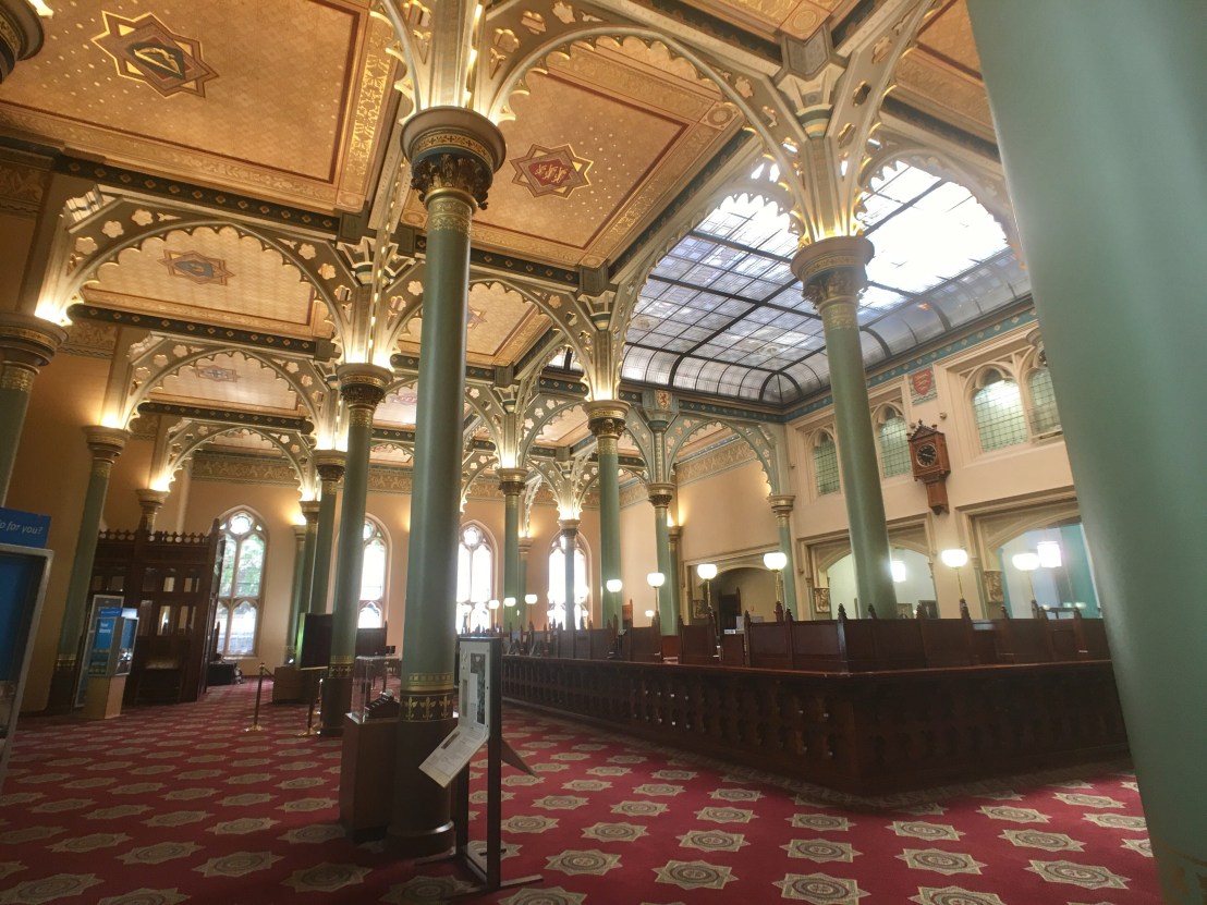The #GothicBank chamber details are just amazing; each capital is finely sculpted ‘fruits of Australia’ (in beaten copper) each one different (I like the ferns, and there’s figs and wheat too), and there’s coats of arms for all the bits of the UK, eg the #harpofireland, and that great internal entry door-box-thing. Its not only delightful, but ‘proto-modern’- the #castiron and #wrought iron structure is clearly visible, posts and beams, even the #rivets are picked out in #goldleaf ! I guess the angled struts / #pointedarch things arnt that structural, but they’re great. #WilliamWardell was a genius, or possibly it was bank chair #SirGeorgeVerdon who is often credited as co-designer who cane up with that detail. Very #Ruskinian.