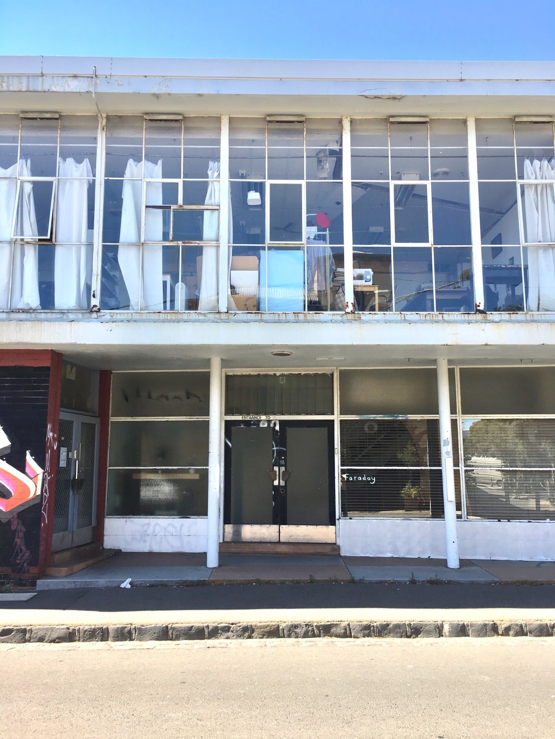 In Ballarat Street #Brunswick, this stylish #Modernist #factory was built in 1955 for #YAKKA #brand overalls ! Later #FletcherJones, then #PerrucciShirts. By the long-named #AKLinesMacFarlaneandMarshall, pretty intact, just the tiles on ground level painted; love the external skinny posts and long #steelframedwindows, with opening bits, and angled ground floor. I think even doors original ! #heritagelisted, phew….but sold in 2015, there’s a large area of #sawtoothroof, but can’t see any planning app…the (large area) factory across the road had approval for 147 flats over 8 floors ….☹️