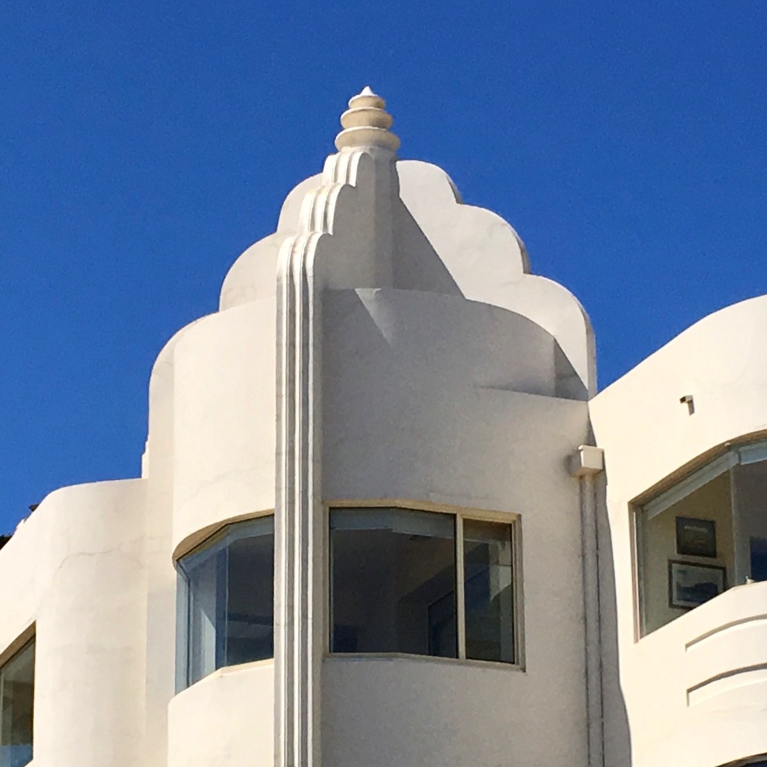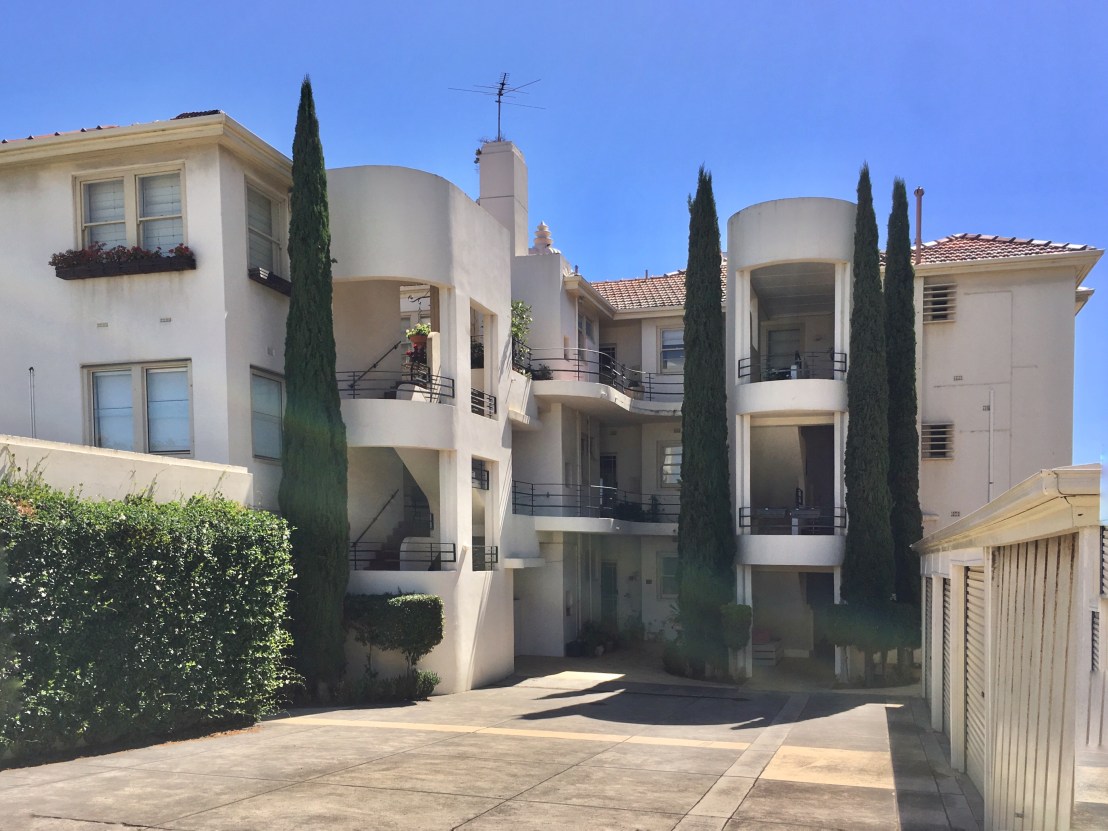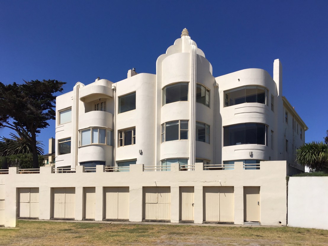 Another #IGAnderson creation from 1935, possibly the best one, #OstendFlats, sits boldly on the ‘golden mile’ of #BrightonVictoria, the only bit where properties have beach frontage, and this is the only #blockofflats. Great series of horizontal curves, opposed by the vertical stepped feature of the ‘tower’. Those things at the bottom were #boatsheds, not sure if anyone uses them for boats now. Most of the balconies have been filled in, but still looks great. Not on the #VictorianHeritageRegister but should be, but then not in any danger.