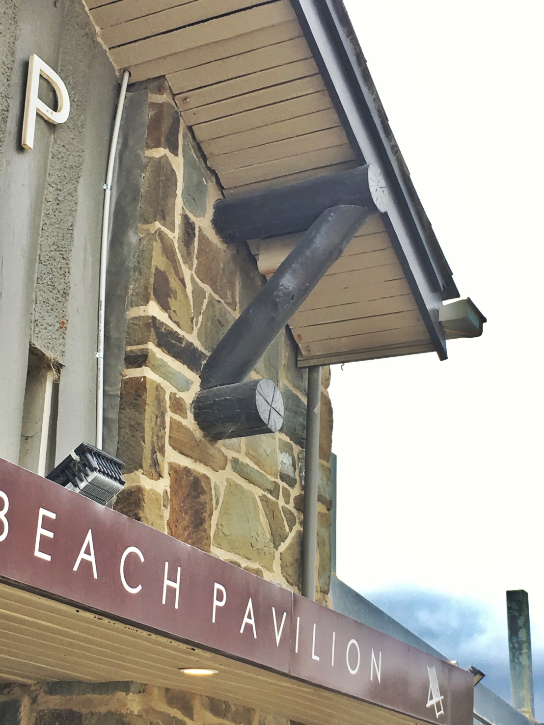 The very rustic style #LorneBeachPavilion was built in 1939, and (probably) designed by the #PublicWorksDepartment Chief Architect #PercyEverett – who normally did very stylish Moderne /ArtDeco stuff but was perfectly capable of doing Rustic, Tudor or Georgian if the use seemed to call for it. This style prob straight from the US #newdeal stuff built in their National Parks in the 30s, often called #parkitecture 😁 Not sure what this was originally, possibly just a picnic pavilion, it’s been expanded a lot and it’s now a restaurant /bar, a bit overpriced I thought, but where else can you have lunch right on the beach ??