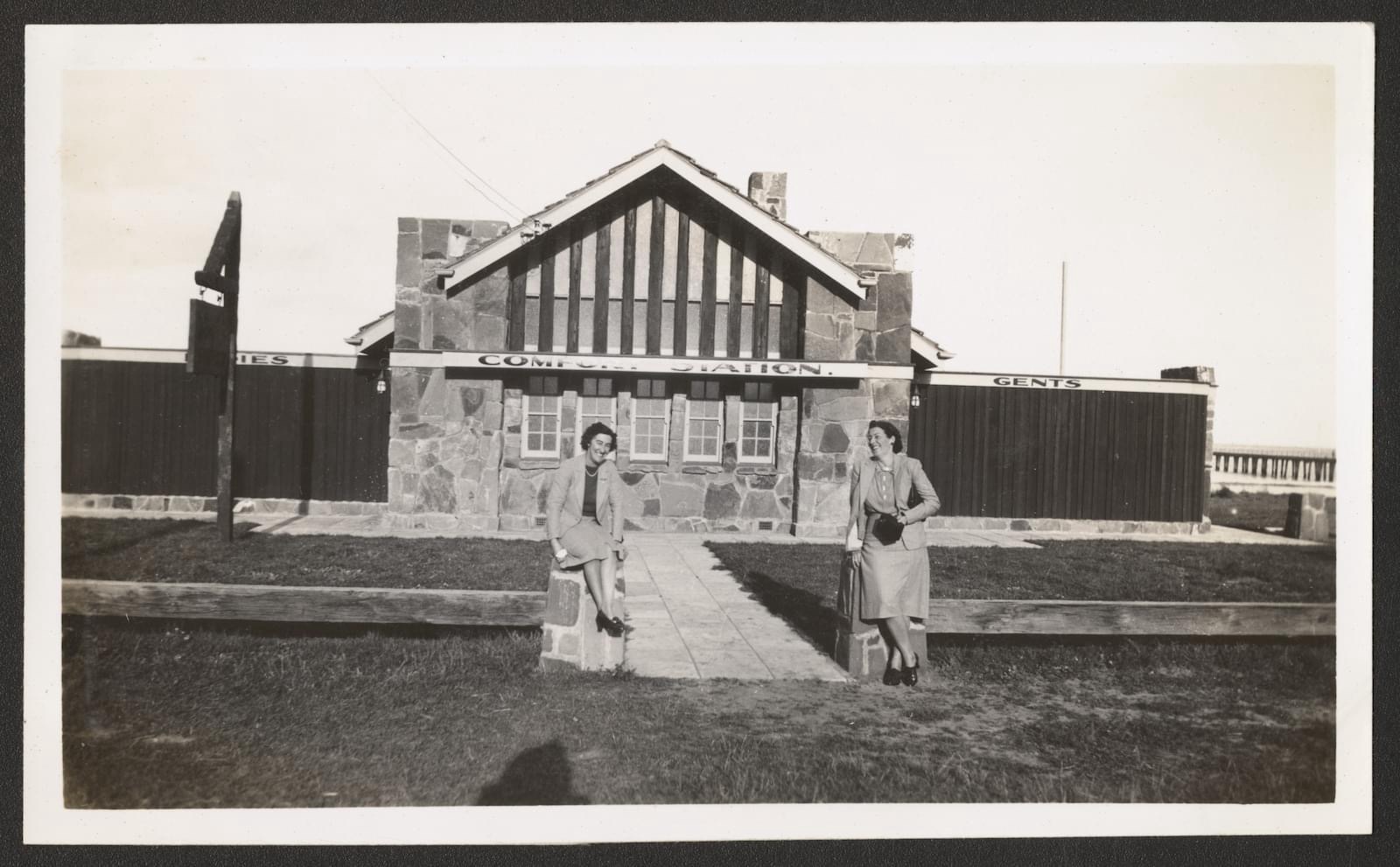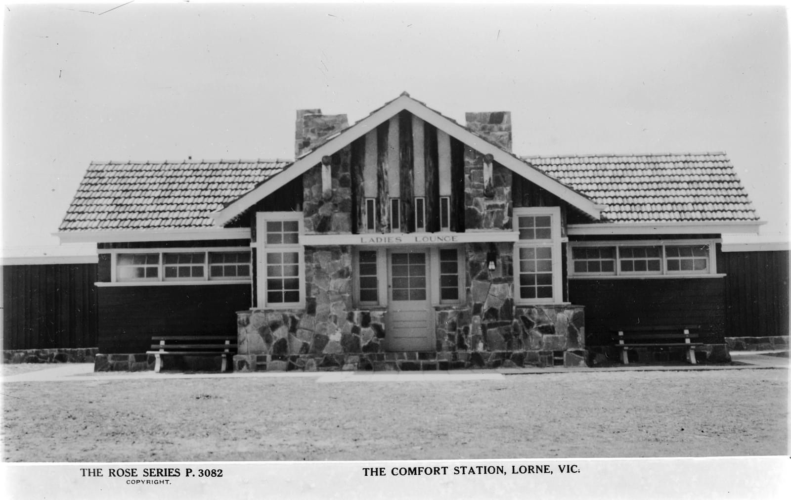 Today’s discovery : I came across a photo of the ‘Port Campbell Comfort Station’ which looks very similar, and was reported in the Age Monday 11 April 1938 as “Australia’s first”, and noting that it was by Percy Everett of the PWD. And then searching for comfort station instead of pavilion, I found a photo of Lorne as a ‘ladies lounge’, so thats all proof enough for me that he also did that one. A comfort station not only had toilets but a place women could freshen up, or change nappies. As far as I can tell from google maps, the Port Campbell original is long gone. I think the photo of Lorne is the land side.