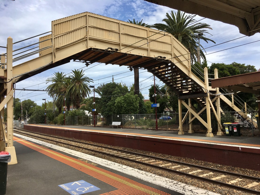 I love these old railway #footbridges, all that no frills heavy timber construction, with a bit of bracing – though I see this one has steel too, the actual bridge part being on #haunched beams, with that annoying high solid fencing so you can’t linger and lean over to watch the trains (but was prob mostly so that you didn’t get smothered in smoke from steam engines).