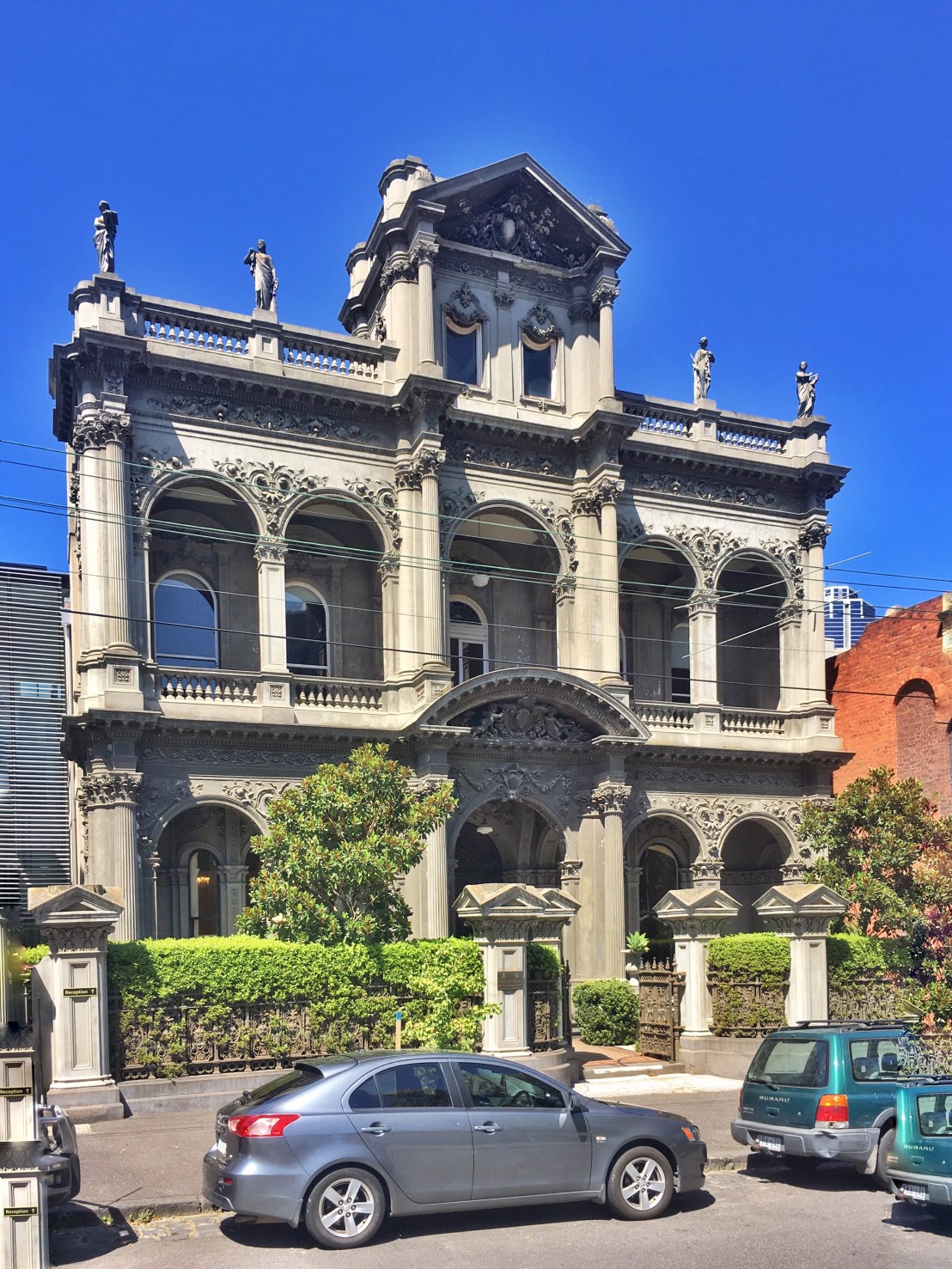 The impressive, delightful, yet odd, #Benvenuta on#DrummondStreet, Carlton, designed by Walter Scott Law, crazy extra Belvedere thing up top, layering of attached #corinthian columns, arcading, that extraordinary floral decoration (nothing else like it here), and great interiors too. Built for Mrs Leah Abrahams, widow of a ‘small arms manufacturer’. Its very #highvictorian, from the last of the #landboom period, built 1893, just as the boom crashed, so she mustve been cashed up.