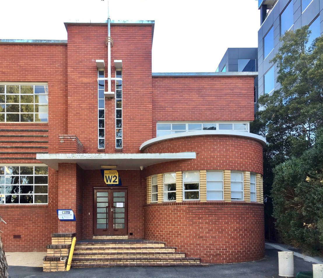 The super stylish #BoxHillGirlsTech, completed 1937, one of the earlier works by #PercyEverett, appointed Chief Architect of the #PublicWorksDepartment in 1934, and immediately most of the work went #Modernist/#ArtDeco; there’s streamlining here, with long Modernist #stripwindows, terminating in a vertical feature complete with flagpole, and a semi-circular element drawing you into the entrance, all in brick. It’s all a bit American and a bit European too. This is a formula he used quite a few times, creates a great dynamic composition without too much fuss.