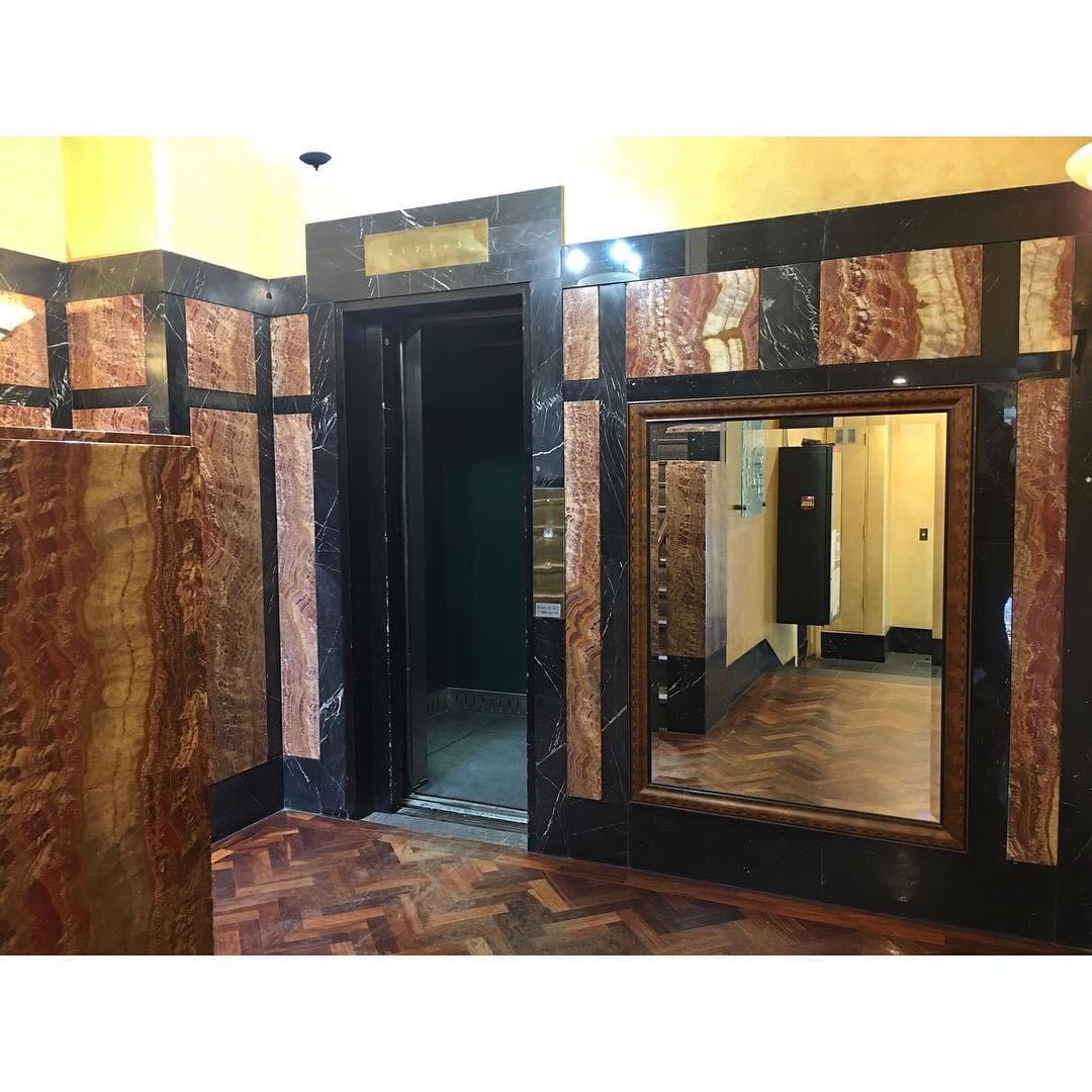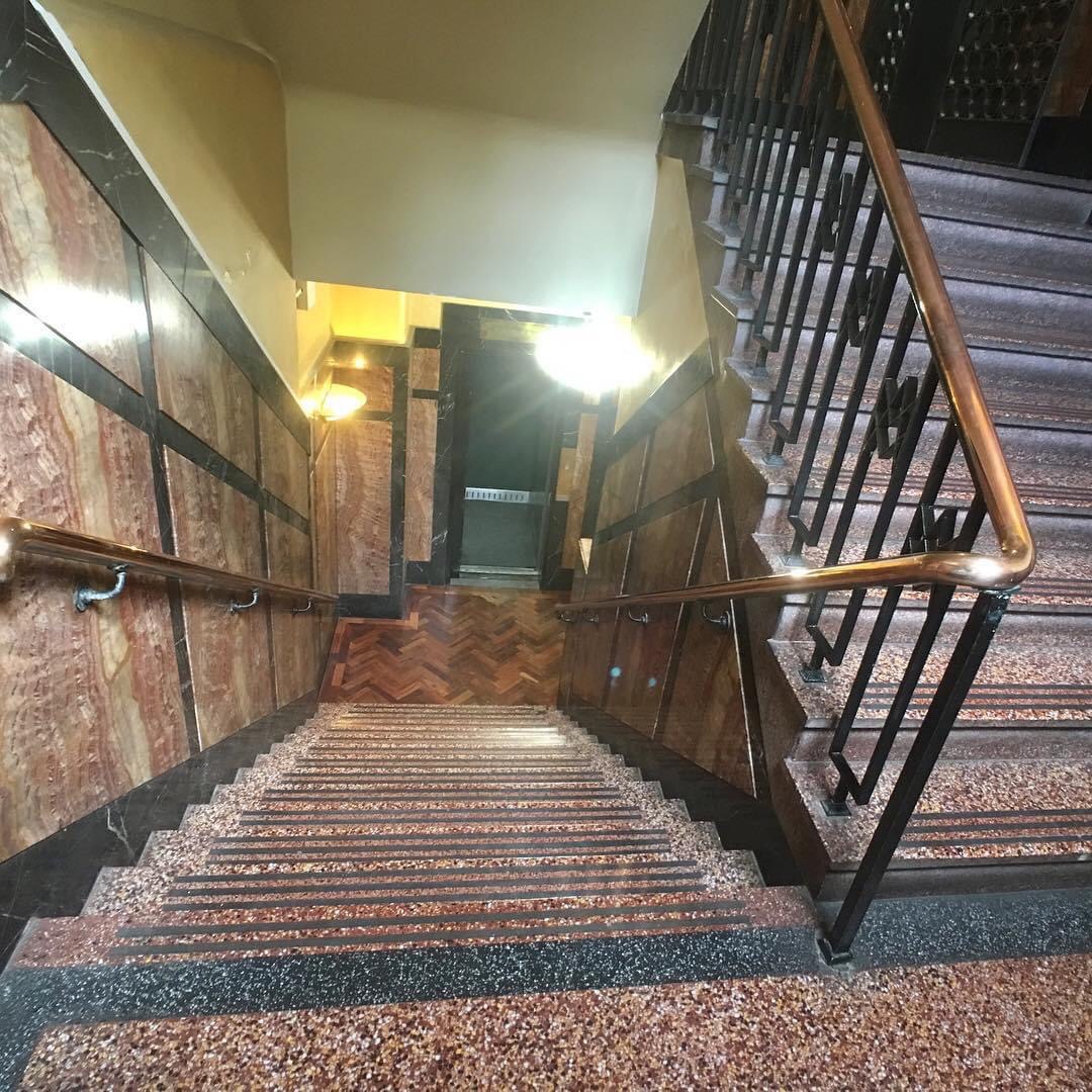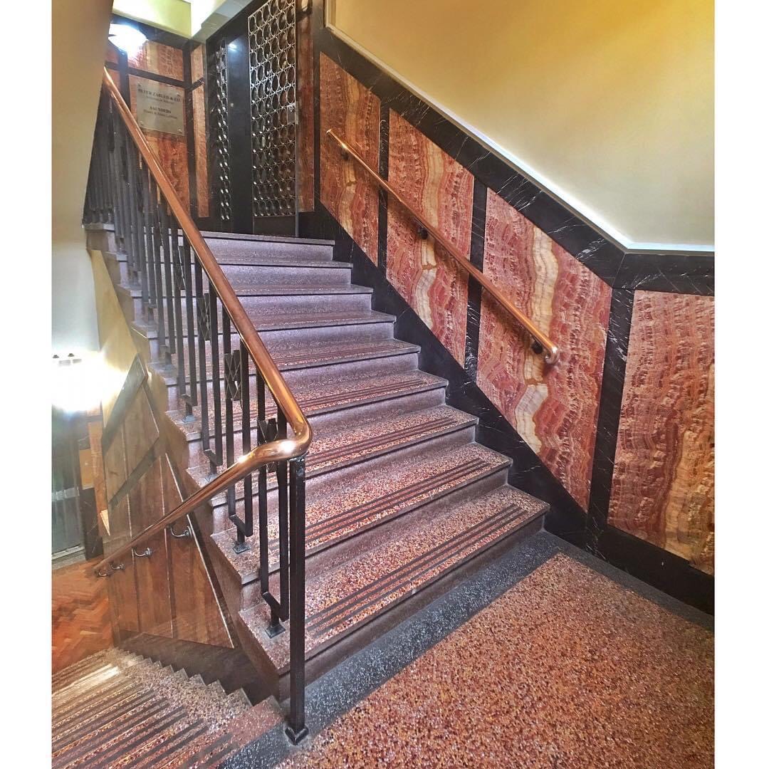 #EvansHouse in #BourkeStreet (now #charlesrosejewellers) was built in 1930 for the co that sold canvas and blinds and is now @evanevans_au flags, designed by Hare Alder Peck & Lacey; the lobby features gorgeous deep red veined #marble and matching red #terrazzo, with black borders, going right up to the first floor lobby – I guess because the ground floor was all shop. Nice balustrade too, with a very #Masonic looking pattern….
