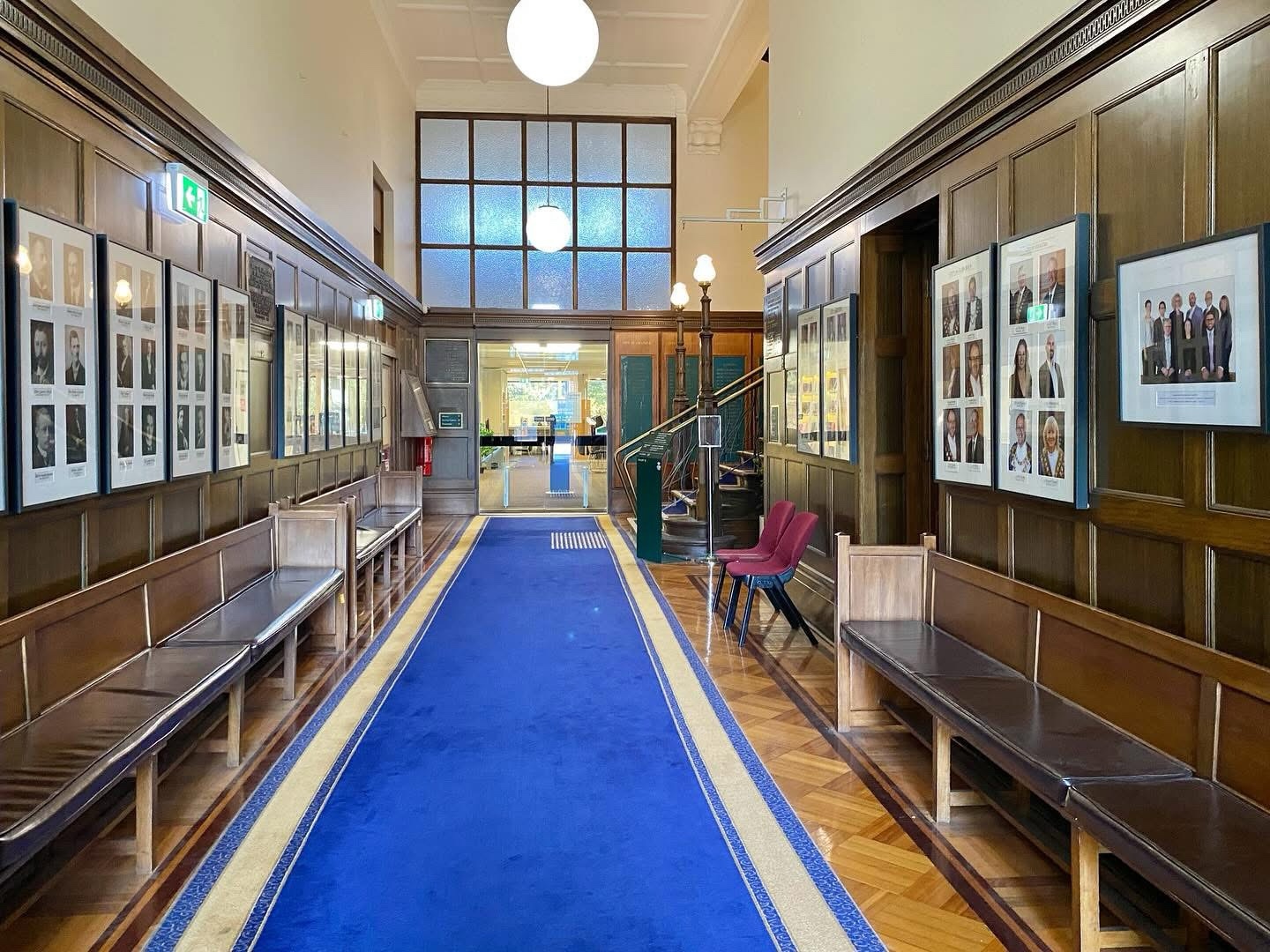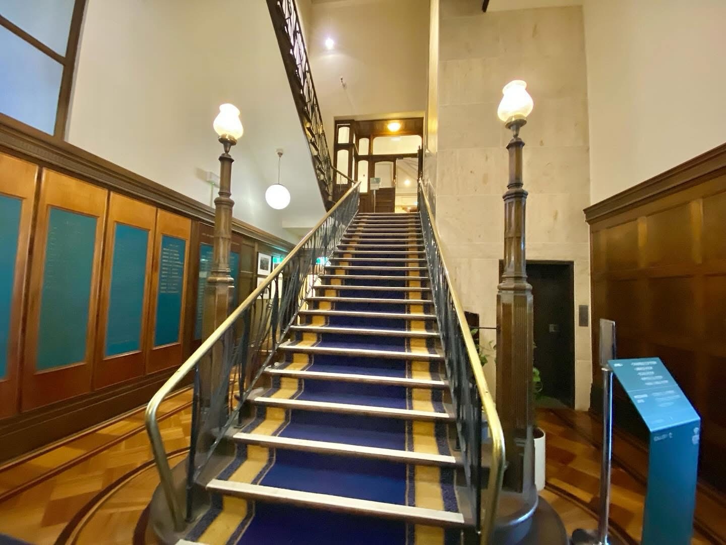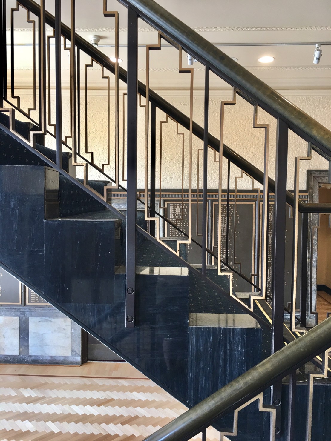 Caulfield Town Hall is an amalgam of an 1884 design by Sydney Smith, built but not rendered and without the tower, then a partial first floor was added in 1890. It was finally finished off in 1931 with more first floor, rendering, and the portico and the hall itself added, all in a nice #StrippedClassical style, designed by Goldsmith and Jenkin. The hall foyer is lined with bronze tablets forming a WWI memorial. The hall was horizontally subdivided in 1987 with that rather nice stair that looks maybe earlier but isn’t. Great leadlight ceiling in the hall, should’ve taken a closeup.