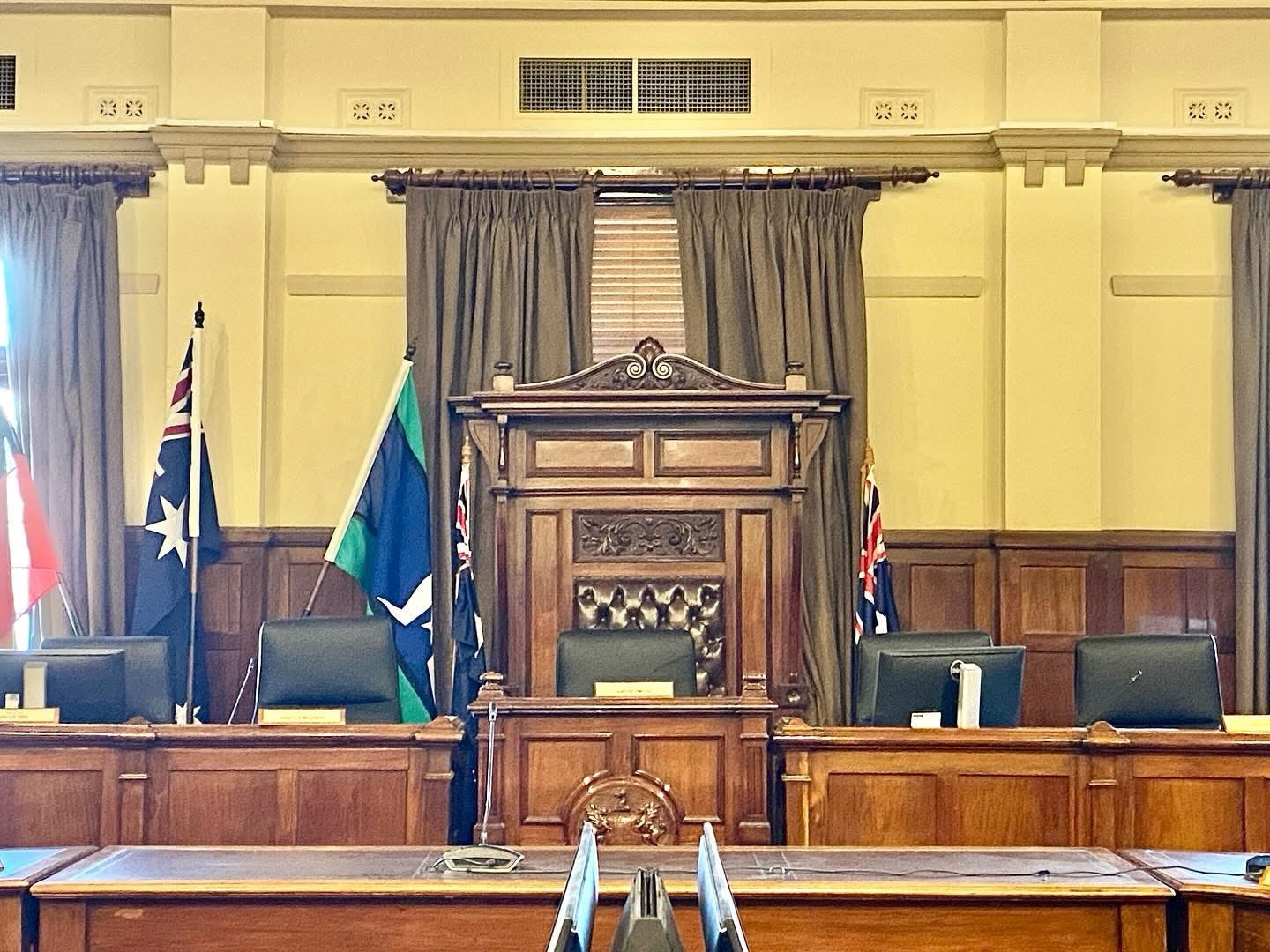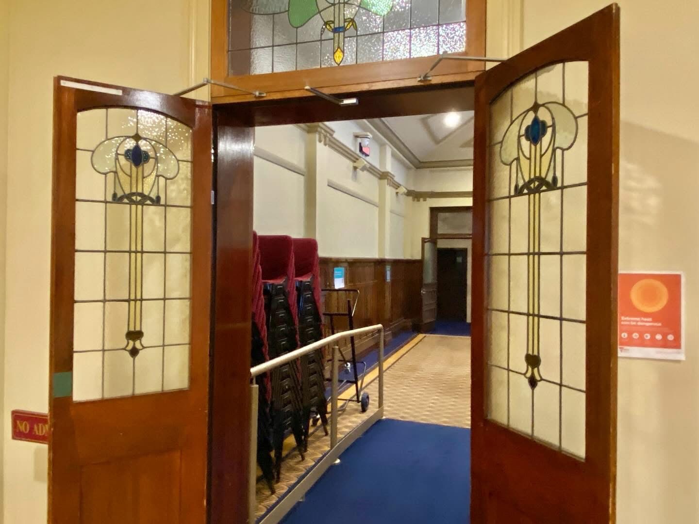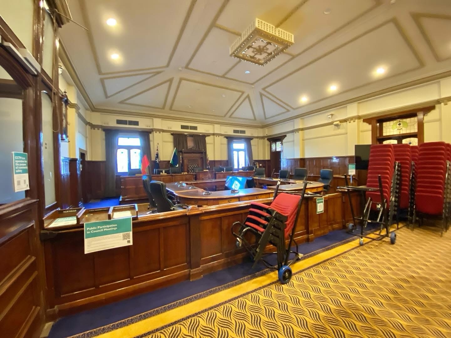 At Caulfield Town Hall, I discovered a side door that led to a lovely wood panelled hall, then to a rather grand stair, flanked by torchere, and with a wild curly balustrade. It led up to the Council chamber, which looked all original, though not sure what date that would be. But probably 1931, when what had been a small unfinished Victorian design was greatly extended and rebuilt, designed by Jenkin & Goldsmith. Heritage listings say the work was undertaken then to alleviate unemployment in the depths of the depression, but many contemporary news articles suggest it was planned just before. Council then worked to go ahead but on a lower budget, against some misgivings, acting as their own builder, but using day labour to ensure locals were employed – which didn’t seem to work out exactly, since there was a protest by the local unemployed. But they did use Australian materials, but I can’t find which wood it might be, possibly Blackwood ? Anyway, lots of nice woodwork.