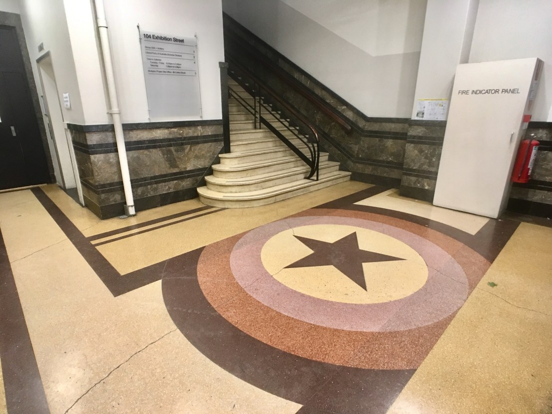 That’s not just any star, it’s the star of the #LoyalOrangeOrder, the Irish Protestant association. It’s in #CentenaryHall in Exhibition Street which has been the home of the Victorian #LiberalParty since they bought it in 1976 from the Protestants who built it in 1935, replacing an earlier hall. There’s a big auditorium on the first floor that could seat 450, still there, hence the grand stairs. It was designed by Philp & Bottoms who must’ve been Protestants, never heard of them. There’s also a #crownandseptre On the front, guess it’s a reference to Britain being a United Kingdom. Sold to @rolexaustralia last year, I suppose they’ll use the hall to display / sell their watches.