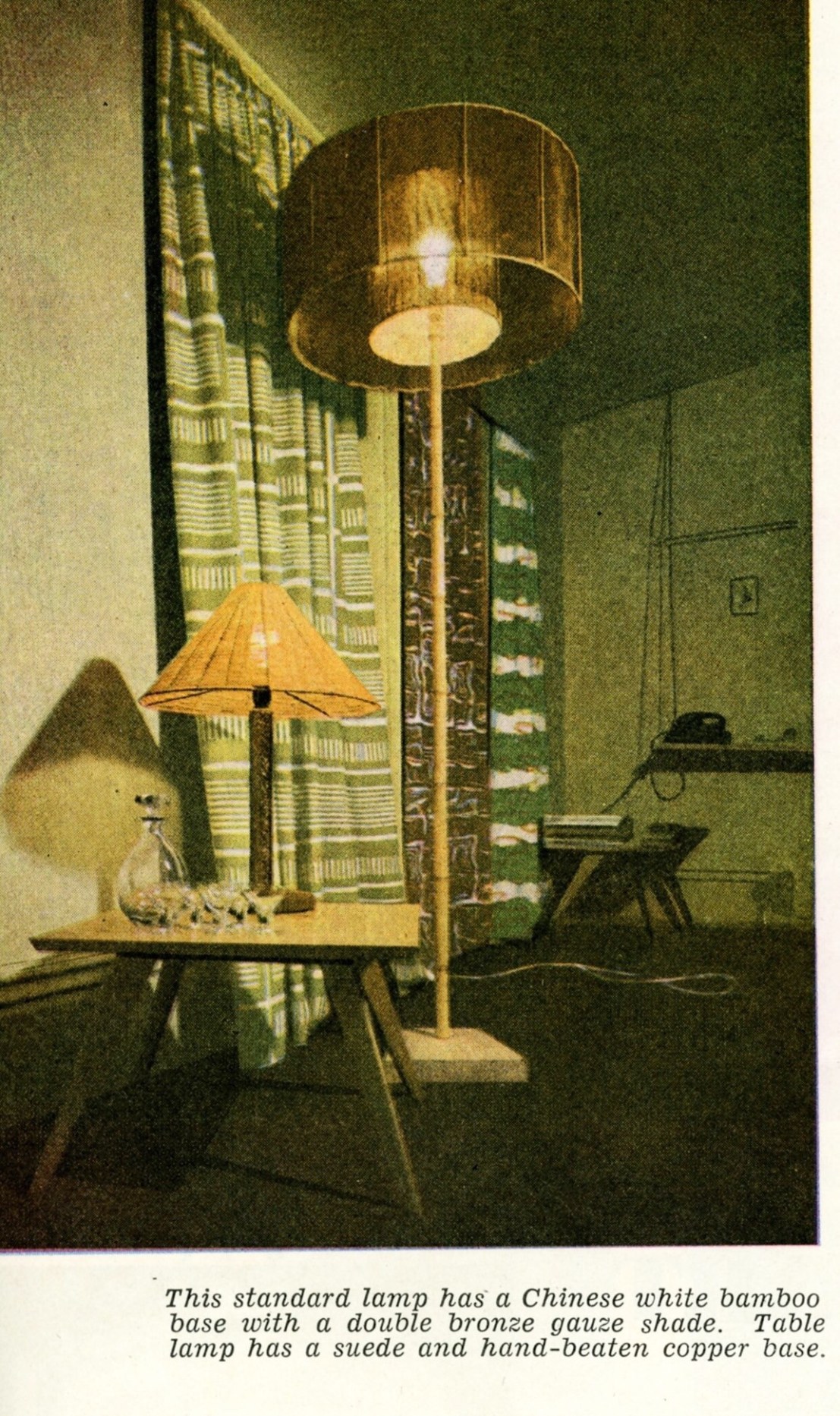 She was obviously well into design in the 50s, with this feature being about Gabriela Matves, a postwar Polish refugee herself. So many different lamps, made of wood, bamboo, string, wire, beaten copper, raffia, bronze mesh, leather, buckram…why have one when you can have 10 ? There was also furniture by Robert Rosh, and sculpture by Tina Wenscher.
