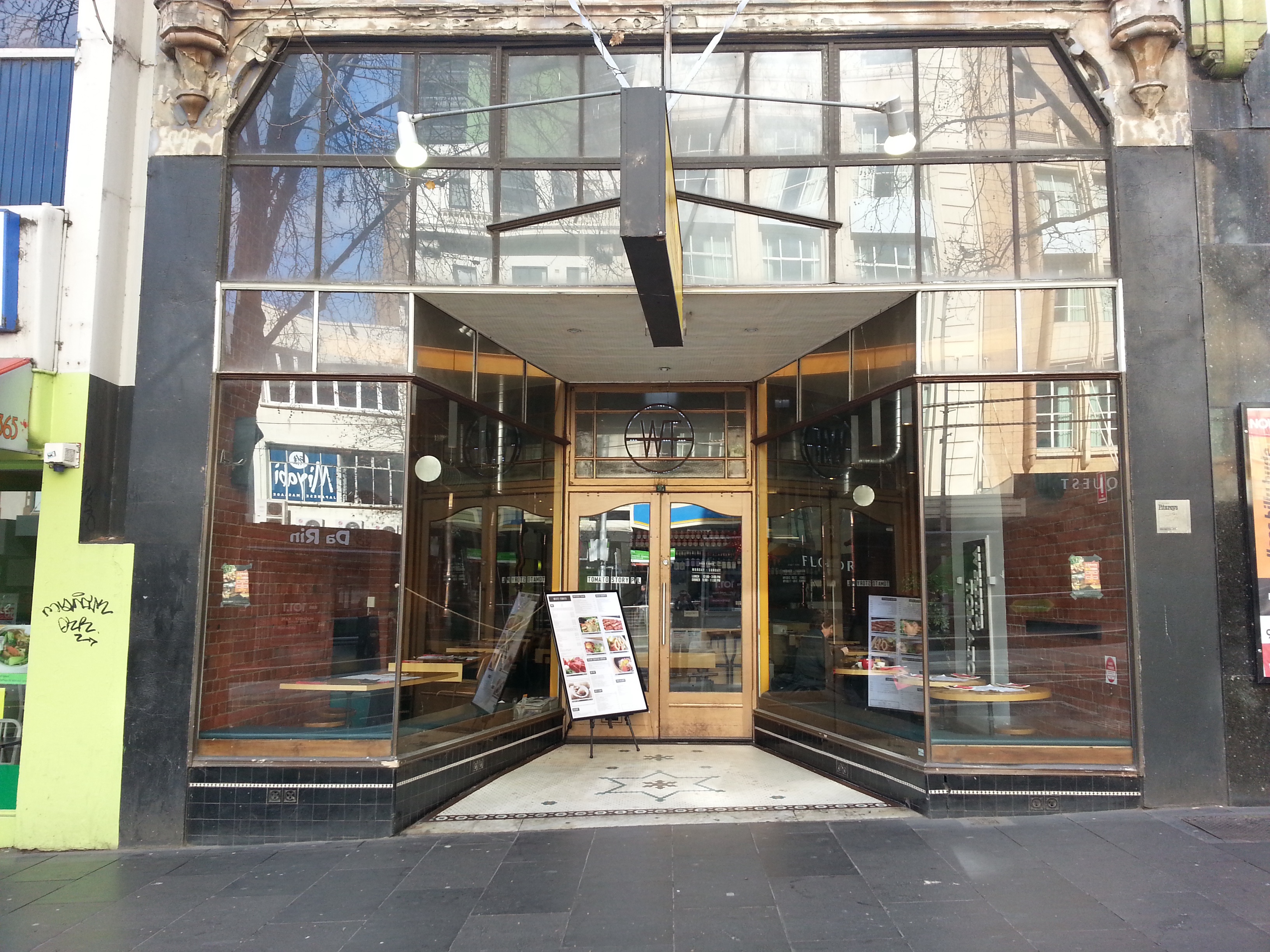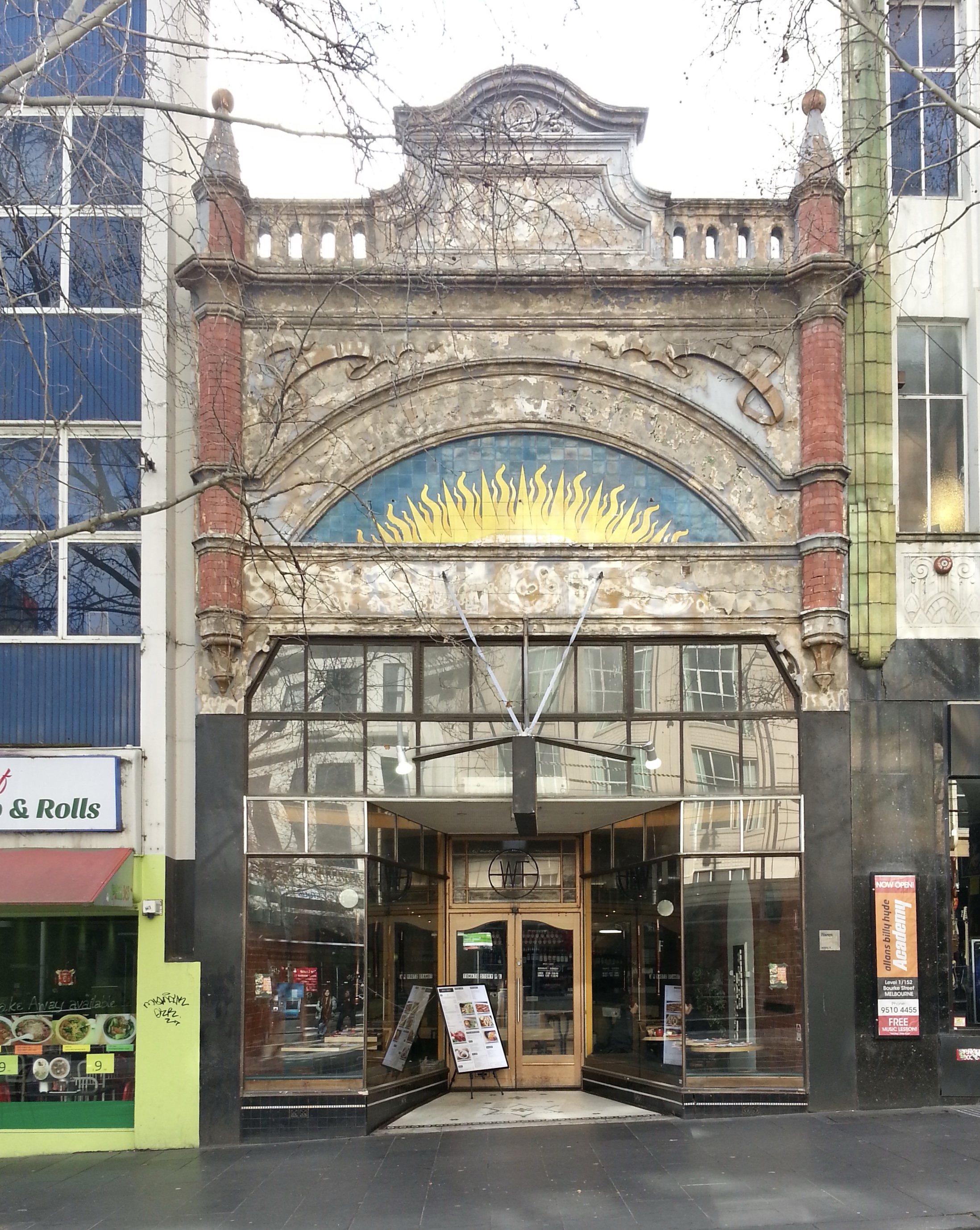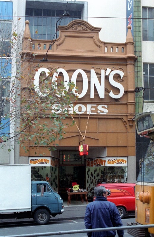 Delightful! The Exhibition Boot Co in #BourkeStreet, near Russell, built 1904, designed by William Webb, with that fantastic sunburst motif – is it an early Australian #risingsun ? nothing to do with shoes anyway.Became Coons Shoes by the 20s, all painted white by 1937, then brownish (Graeme Butler, 1984), restored by Mariana Hardwick when she was starting out in 1987, thankfully still the same.Also, not only is the big copper framed shopfront intact, with the doors, and floor tiles, but so is the great huge old school skylit interior, like some county town general store, complete with pressed metal details (but sadly painted black).