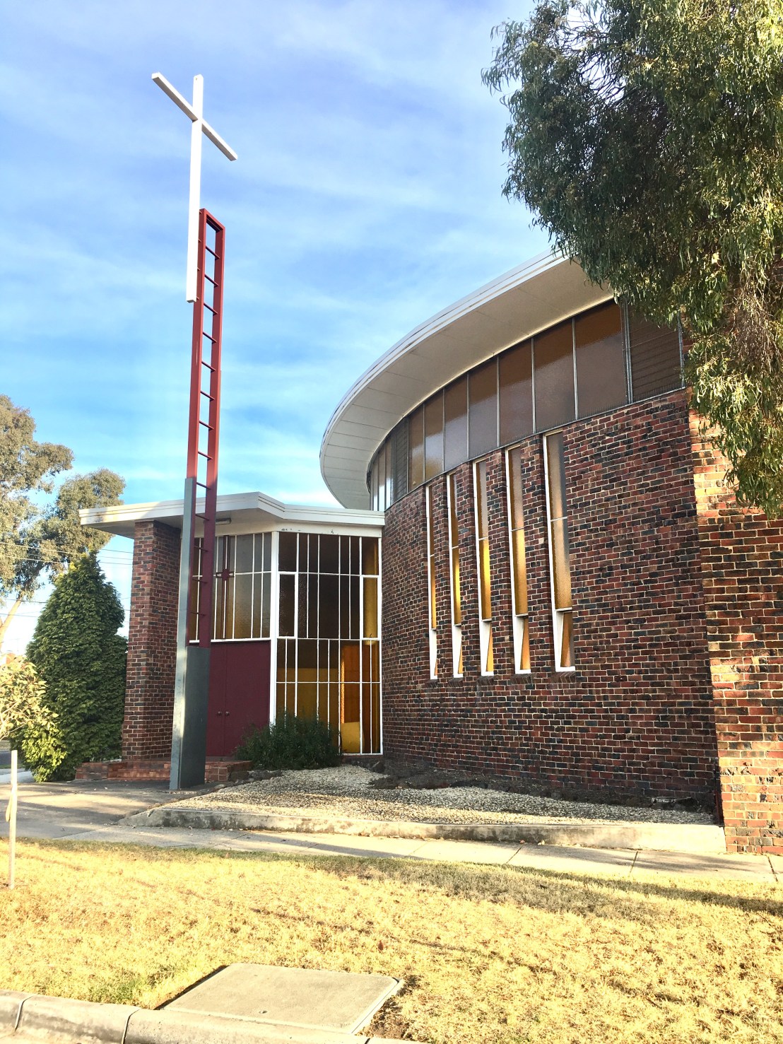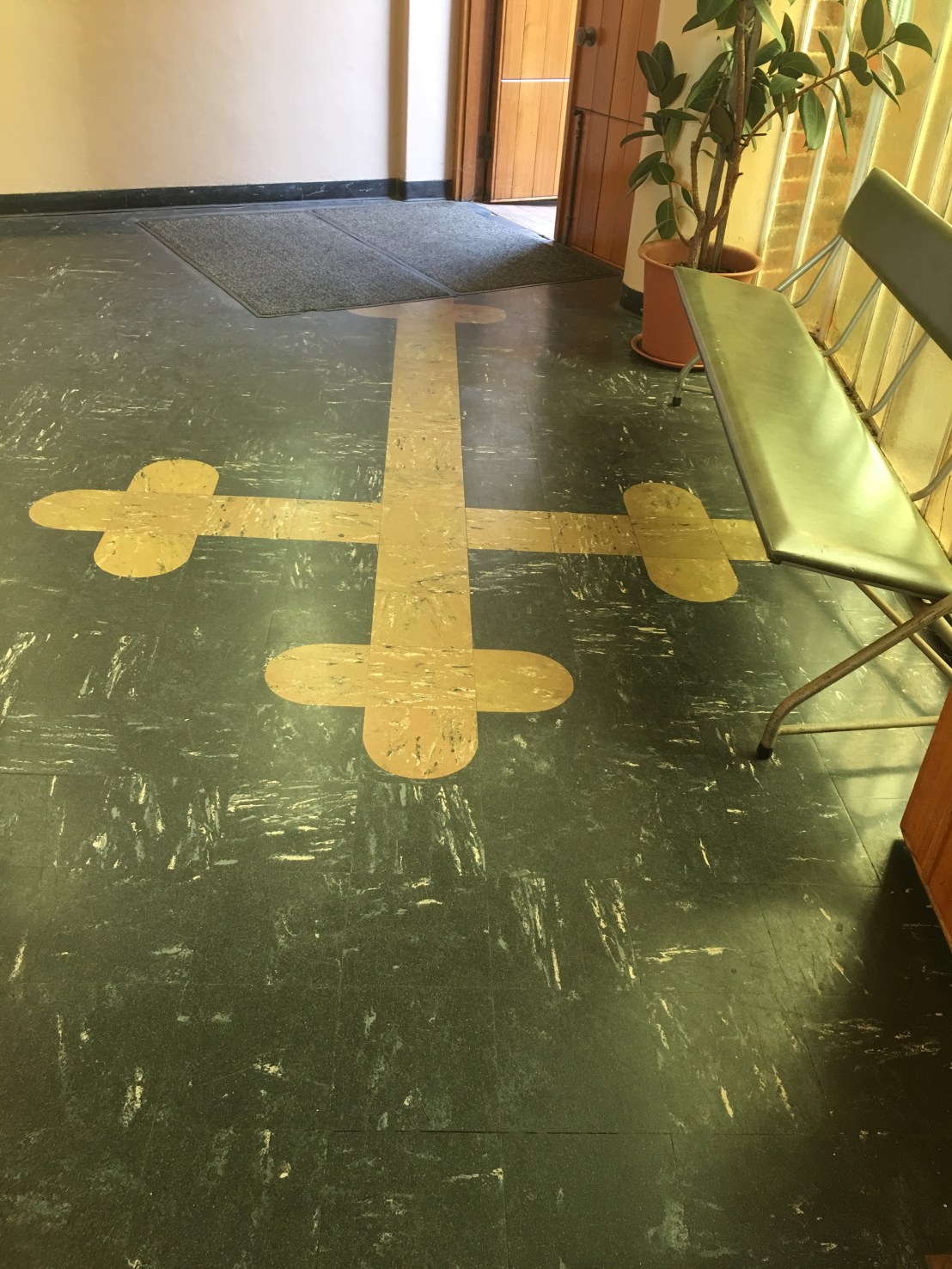 Tall, sweeping, simple yet grand, no complicated stained glass but lovely light, and all original including the #pews and the #linoleum floor with a cross ! I like the row of posts around the outside edge and the highlight windows, facing east. This very non-traditional layout is waaay before #VaticanII. Here is the City of Moreland heritage listing (its a bit short).  Designed by a Jewish Romanian #emigrearchitect by the name of #GregorHirsch, who arrived in 1949 after spending the war in Kolkata, where he apparently converted to Catholicism. He named his firm CONARG (Contemporary Architecture Group) you can find his biography at the Dictionary of Unsung Architects. A facebook acquaintance who worked for him as a student said he was not a gruff Eastern European as I imagined, but kind, generous, and hands-on.