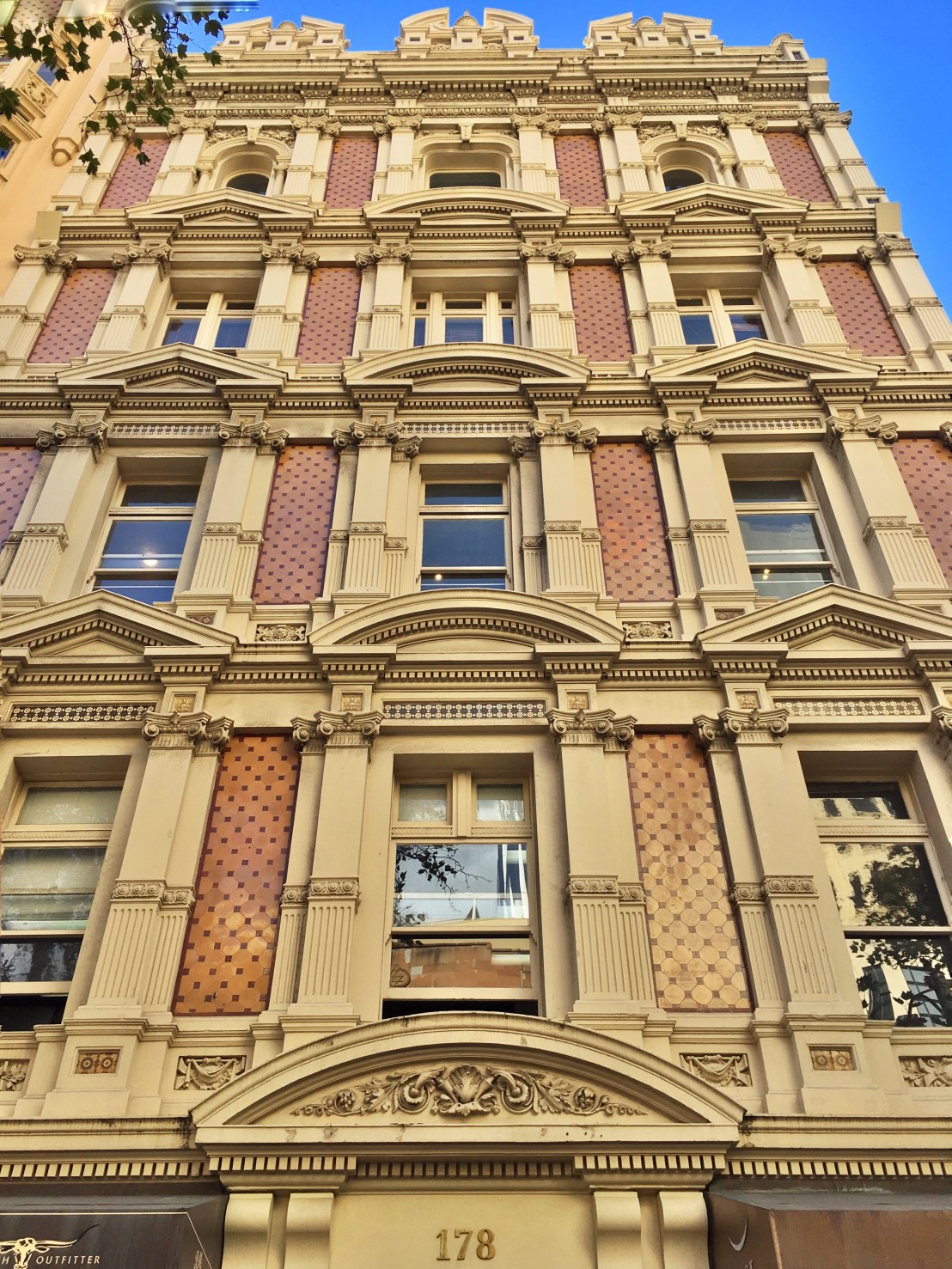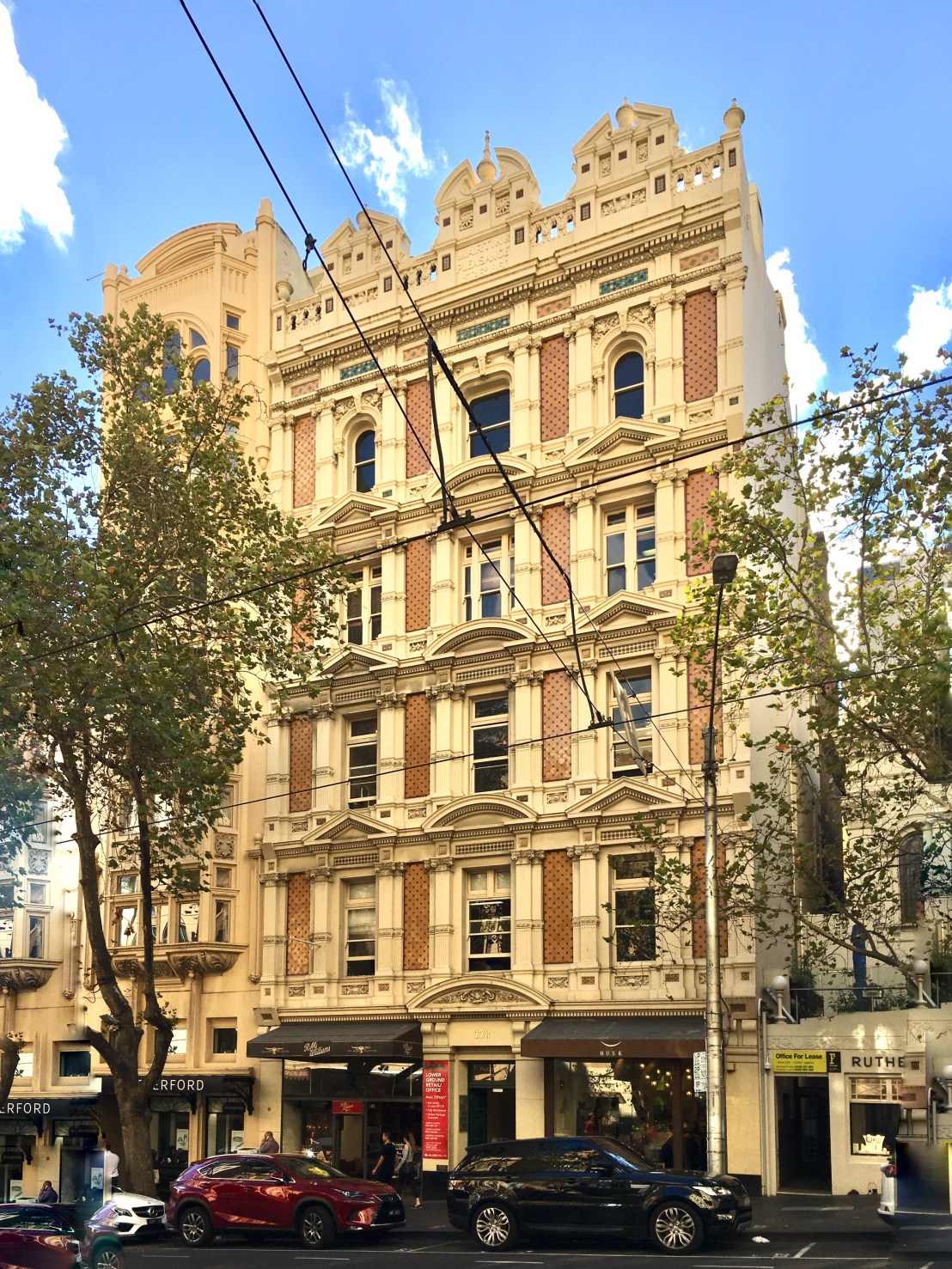 Always worth another shot, the great 1889 #MartinAndPleasance building on the #CollinsStreet hill, they were Melbs premier purveyors of #homeopathic remedies, back when that was big business. Designed by #FMWhite, who was in his late 60s by then, so maybe really the work of his son, Alfred. So much layering…..the tiles had been painted over for decades, thankfully restored in the early 2000s.