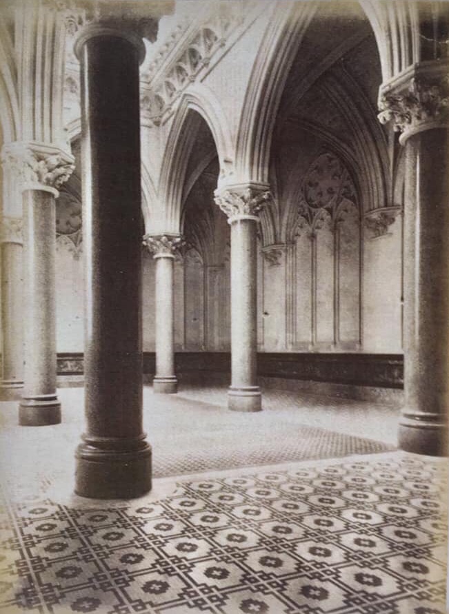 Fantastic photo recently emerged of what we now call the #CathedralRoom at the #GothicBank in #CollinsStreet, taken by Charles Bristow Walker c1897 at the @nationallibraryaus. Shows that the #floortiling done in the 1991-3 restoration by @lovellchen was not even close and how the original skylight (down a 6 storey lightwell) which was the only natural lighting, was very bright – or it might be a long exposure. Designed by #WilliamPitt as part of the very extravagant #MelbourneStockExchange, completed in 1891, as a kind of meeting vestibule/ reading room, where members could take guests. The glass floor illuminated the basement dining room (!). In the 1920s it was fitted with counters when the bank next door took it over. It’s all made of carved #OamaruLimestone, still creamy in colour. No wonder the Stock Exchange company eventually had to sell.