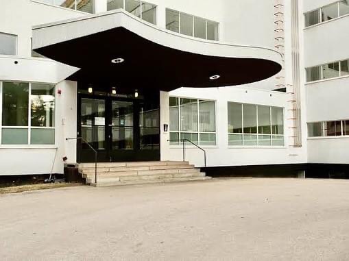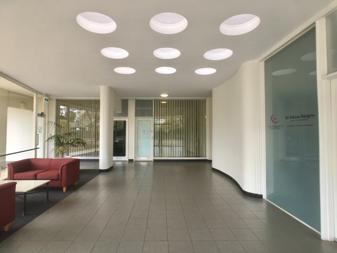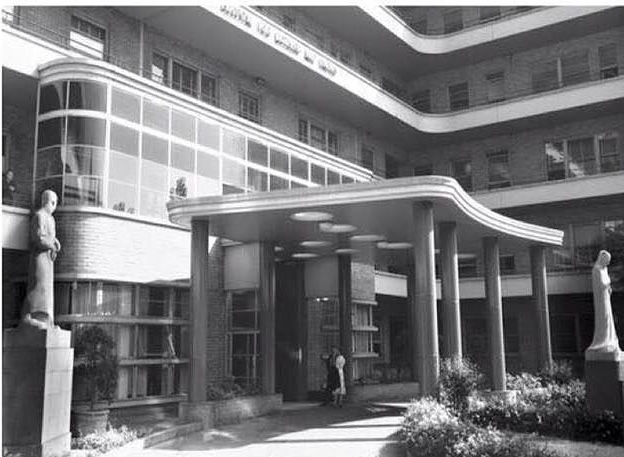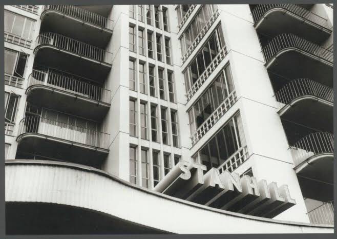 The marvellous entrance of #Stanhill in Queens Road, Melbourne’s most prominent example of pre-war European Modernism – designed 1943 though not built 1947-50, by which time it was a bit retro! The architect was German native Swiss trained #FrederickRomberg. Love the fee form, the dramatic cantilever, the all glass enclosure in very thin steel frames, and the column #fluting. Said to have been inspired by #AalvarAalto’s 1933 #PaimioSanatorium, which does have a similar canopy, and his #ViipuriLibrary has the same circular skylights – but as Harriet Edquist pints out also similar to the entry canopy of #StephensonTurner’s King George Hospital in Sydney built 1941, and Romberg had worked there… anyway it’s not a copy of either, it is I think a bit better !