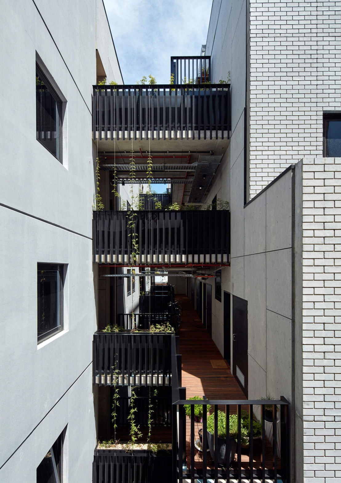 The #OxfordandPeel apartment project by #jacksonclementsburrows, completed 2016, is one of their most respectful of context, namely that Oxford Street is entirely lined with the big Edwardian #redbrick buildings of the #FoyandGibson manufacturing empire, by #WilliamPittArchitect. I might have liked it even better if it was in exactly the same #redbrick, but I guess it didnt have to be. Close up, they’re nicely varied, as if they were second hand. Only criticism is that from ads online, the apartments are pretty small and expensive and with those inset balconies, the lounge rooms don’t get that much light in winter. But then the people who live here are probably never at home. And maybe it’s part of it’s got 7 natHERS rating out of a possible 10 – I@suppose cutting down on aircon would be a big part ? (though in the not too distant future all elec will be green so we can keep the aircon on more !).