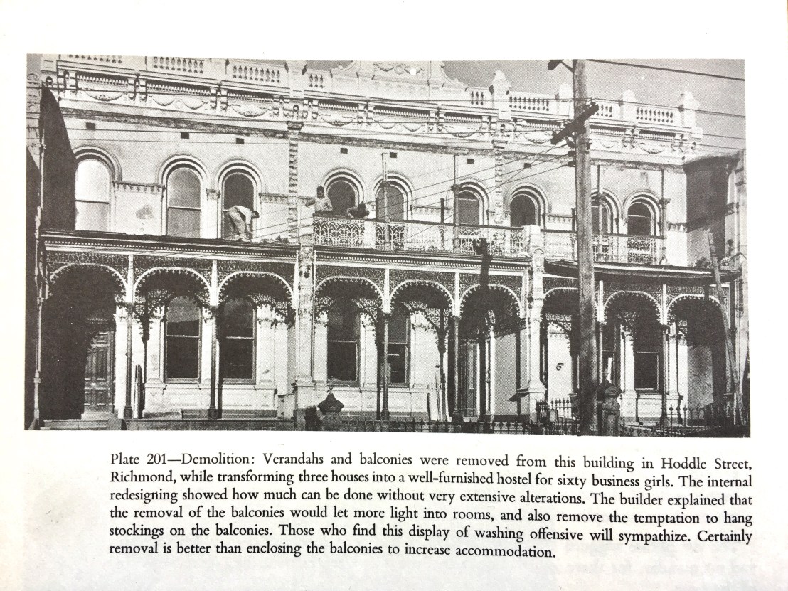 A photo from c1960 of the #castironlace #verandah being removed from Hillside, a grand #melbourneterrace thousands pass every day on #HoddleStreetRichmond, when it was being converted to a ladies hostel (and it’s still operating as #HillsideCourt). Possibly the most famous place where the verandah is obviously missing. The photo is from ‘Victorian Heritage – Ornamental Cast Iron In Architecture’, by noted neurologist #EGraemeRobertson, who in his 50s in the 50s helped create the @nationaltrustvic and then went on to publish 9 books on #ornamentalcastiron, which of course we have a lot of in Melb – and in fact all over Australia, much much more than anywhere else, im looking at you New Orleans, take that ! Admittedly theirs are better known, more delicate and more concentrated.