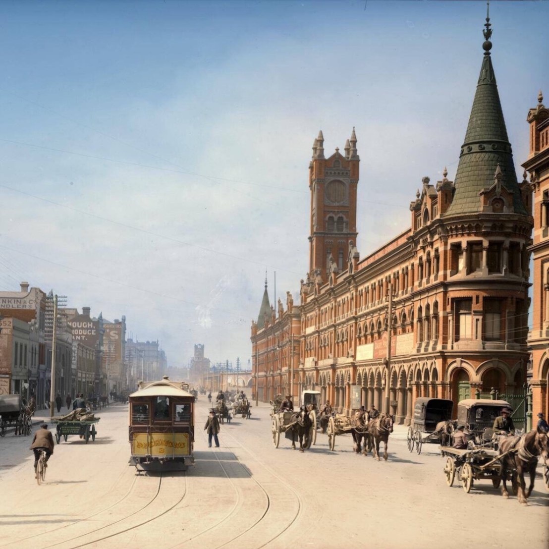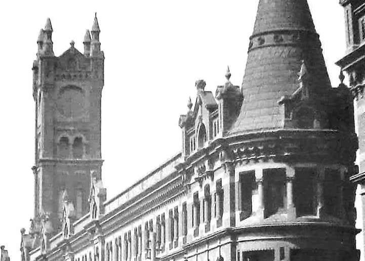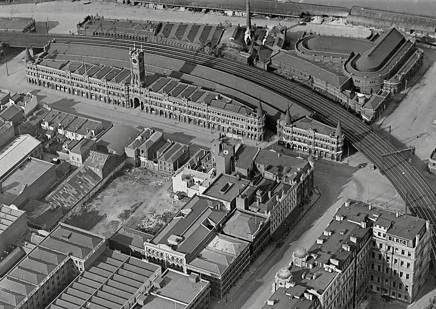 Ive collected a whole bunch of images, mainly via Facebook, mainly originally the State Library. Built 1891-2, the design by R G Gordon won a competition, and it’s an Italian Gothic fantasy of towers and turrets and arched windows. It was in two parts divided by the then new railway viaduct, with the fish market itself actually on the riverbank, the prominent Flinders St part was meat & poultry and stores. Couldn’t find a good close one of the fish section, except the riverside entrance in the 1950s, showing it all grimy and a bit cracked (from a little booklet I’ve got).