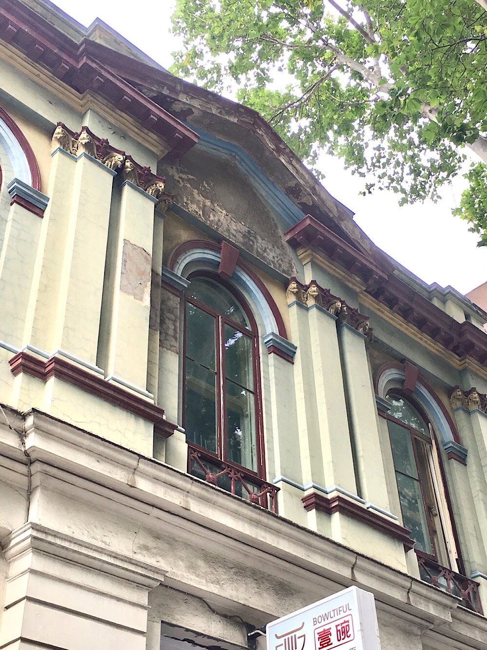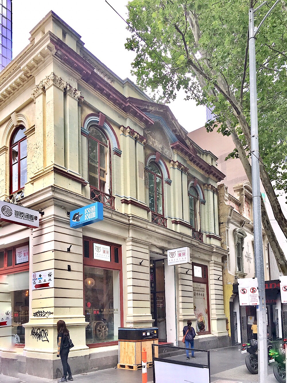 Built as a branch of the #BankofAustralasia in 1883, designed by #ReedAndBarnes, only about 8 mins walk from the grand 1876 HQ on Collins St, also by R&B, this one almost a restrained version, same completely rusticated ground level, and clustered pilasters and arched windows. Also some nice #castiron things st the bottom of the windows, unusually fiddly for a bank. I seem to remember a very fragrant leather shop there, maybe in the 90s, with big old racks. Now a noodle shop with a ‘luxurious’ residence on the top floor.