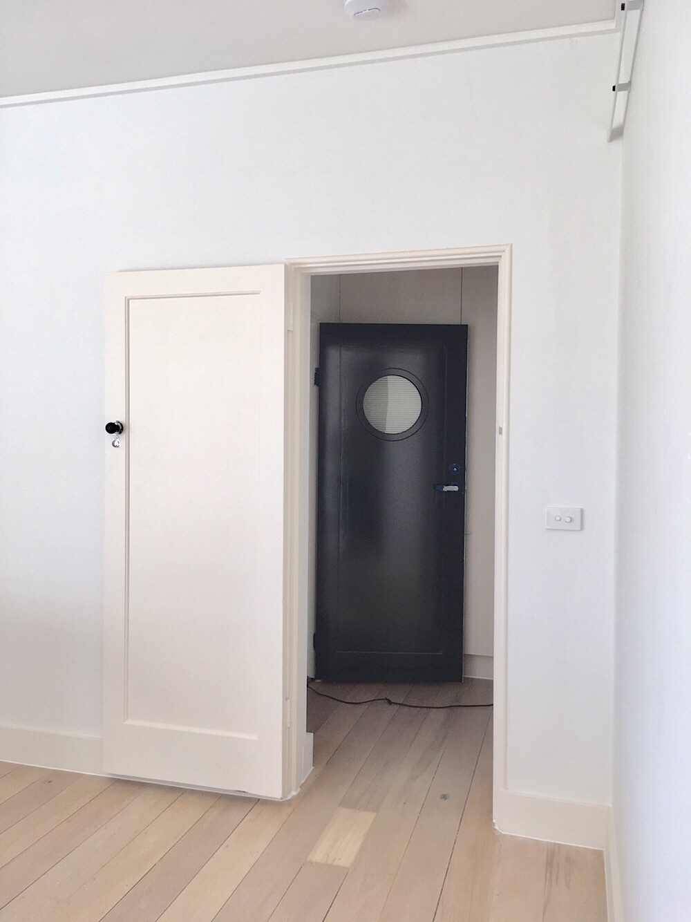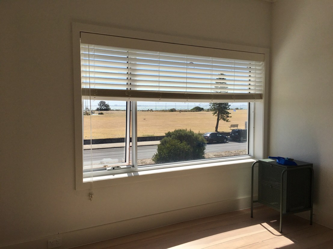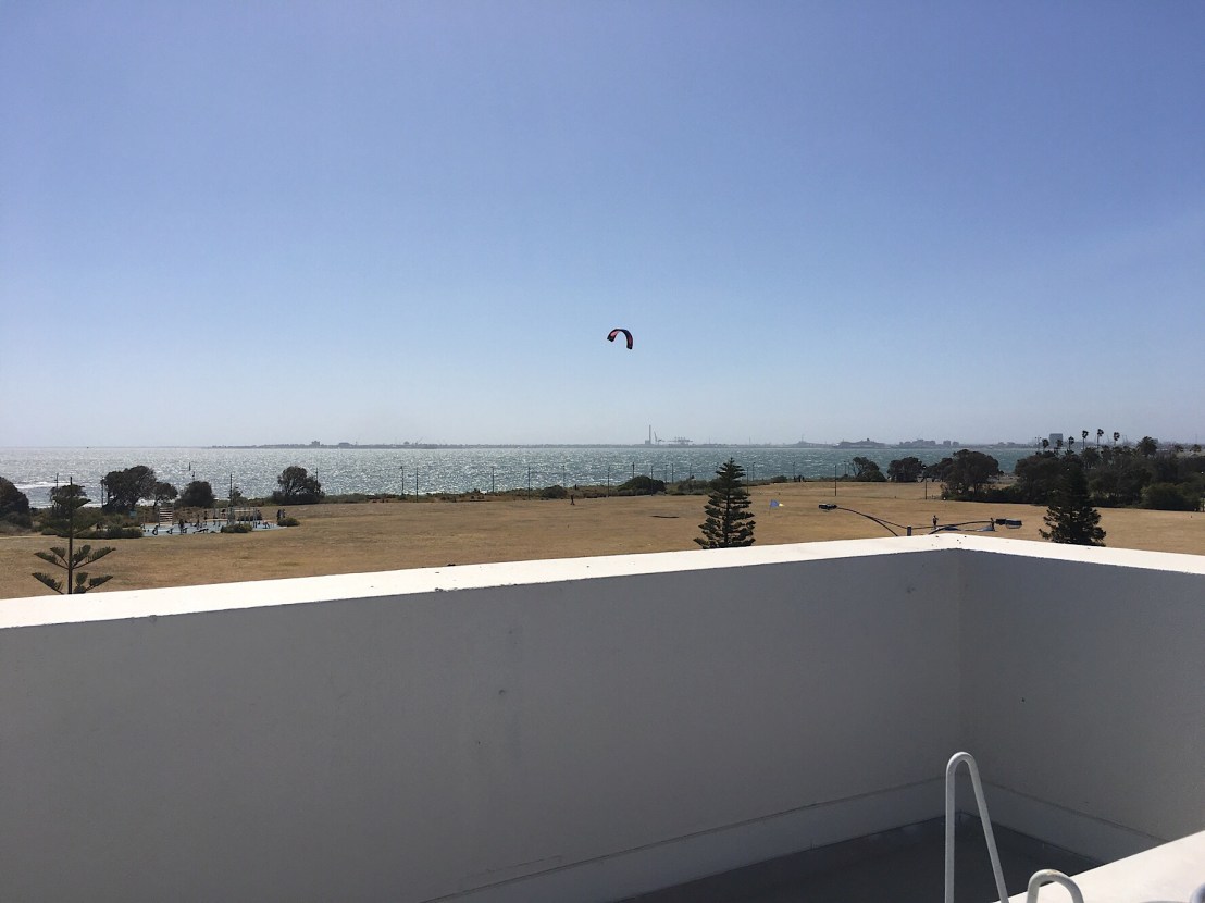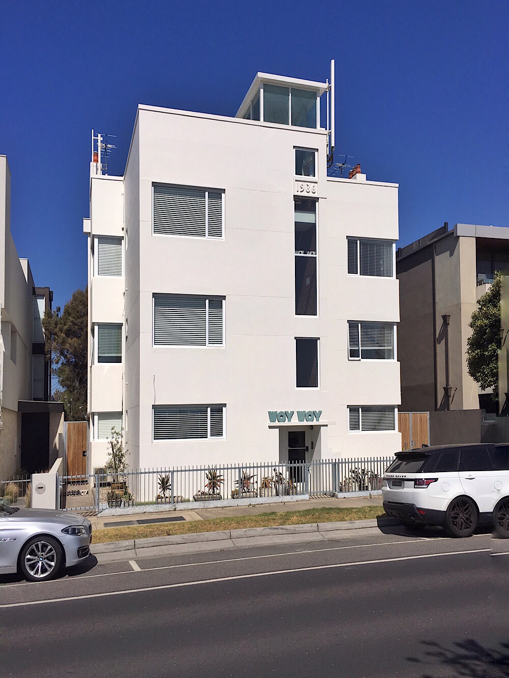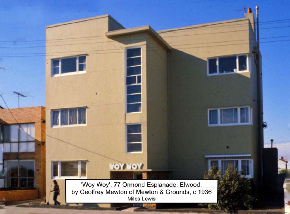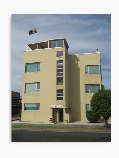 Woy Woy, #MarineParade, #Elwood, Geoffrey Mewton, 1936. Amazing bit of almost #Bauhaus in Melbourne, designed by Mewton, who did a whole series of 30s rendered or cream brick boxy houses too, all dem now except #JustinMadden’s house in Essendon. Woy Woy has just been renovated to become airb&bs, it’s bright white instead of ochre, and the owner waved us in ! It’s a set of 6 tiny one bed #batchelorflats (there was going to be a second block behind, never built). The exterior changed quite a bit in a 1980s renovation – the windows of the upper floors were enlarged, and changed from steel to aluminium, and the stairs extended up to the flat roof (just before it was #heritagelisted ?), with a little tower – 2nd photo. Also the face bricks at the entrance, possibly with a planter bed, were rendered over. The front windows on the left are actually bedrooms, the lounges are to the sides. Pre-war flats and even often postwar ones often weren’t built for a view from the lounge room like we expect now, the lounge was for reading, listening to the radio, doing some knitting – if you wanted a view or some air, you went outside. That’s my theory anyway. The roof has amazing views.