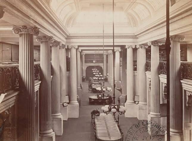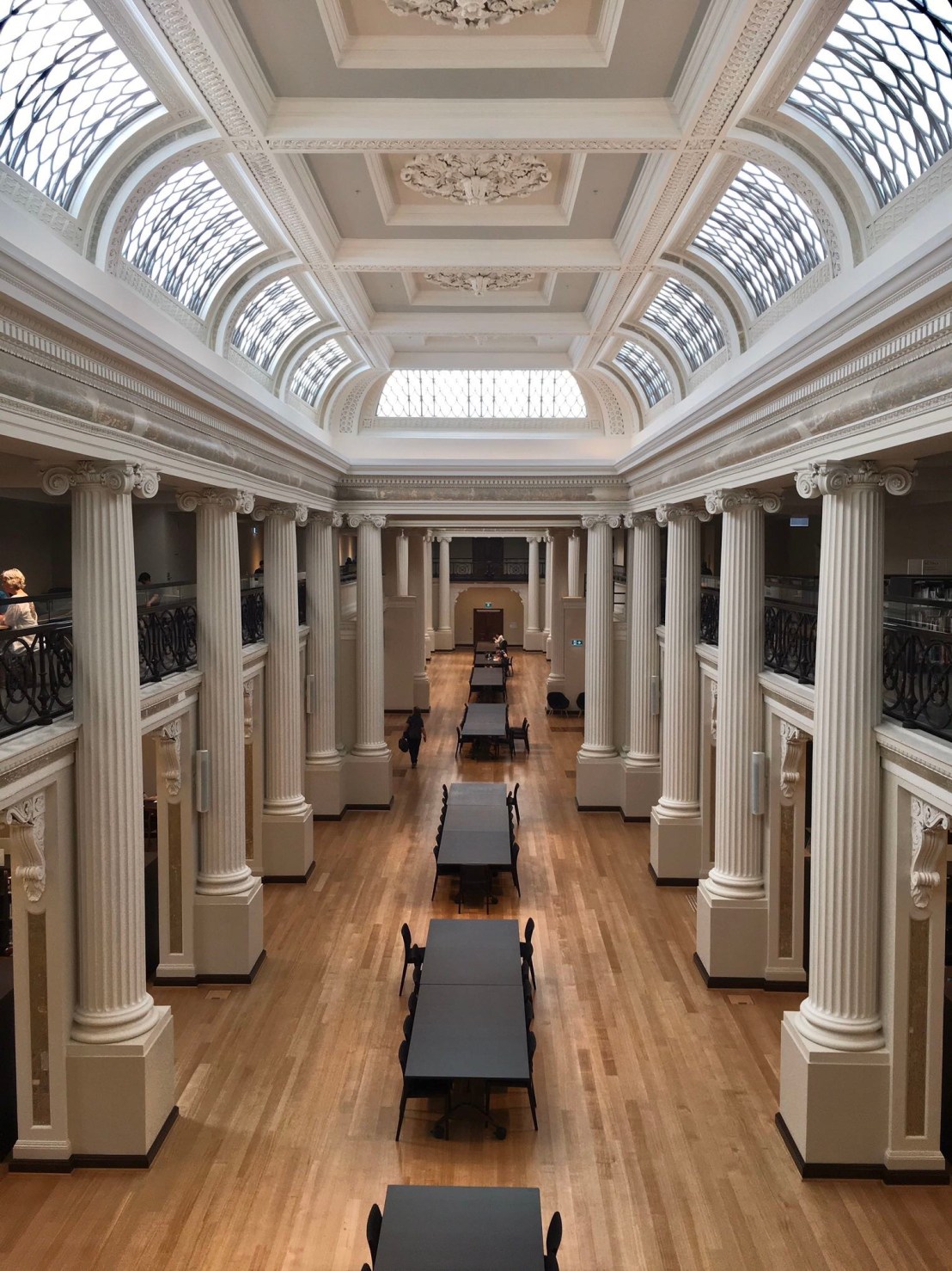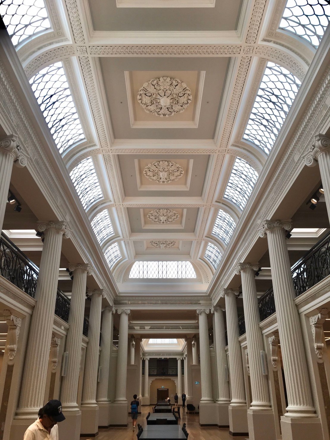 The refurbished #QueensHall at the #StateLibraryVictoria looks amazing, all that delicate plaster detail highlighted by pale paint, and the fabbo #fishscale #skylights reinstated; hard to believe it’s been 16 years since it closed (due to fire risk/exits), and what a change from the 1970s green and cream scheme. It now looks much as it did in a photo from 1866. Designed by Joseph Reed, it was built in 3 stages all matching (middle, south, north) and the photo shows it was mostly pale, with patterned #friezes by EJ Bateman only in the places where they’ve been revealed. The giant 70s Victorian style lights have gone, but not replaced with reproductions of the 1860s lights. This room is fondly remembered as the cosy and quiet Arts Library section from 1976 to 2003, now it’s just the chess and bridge collection, with the central space more easily emptied for functions. Restoration works by @andronasarchitecture.